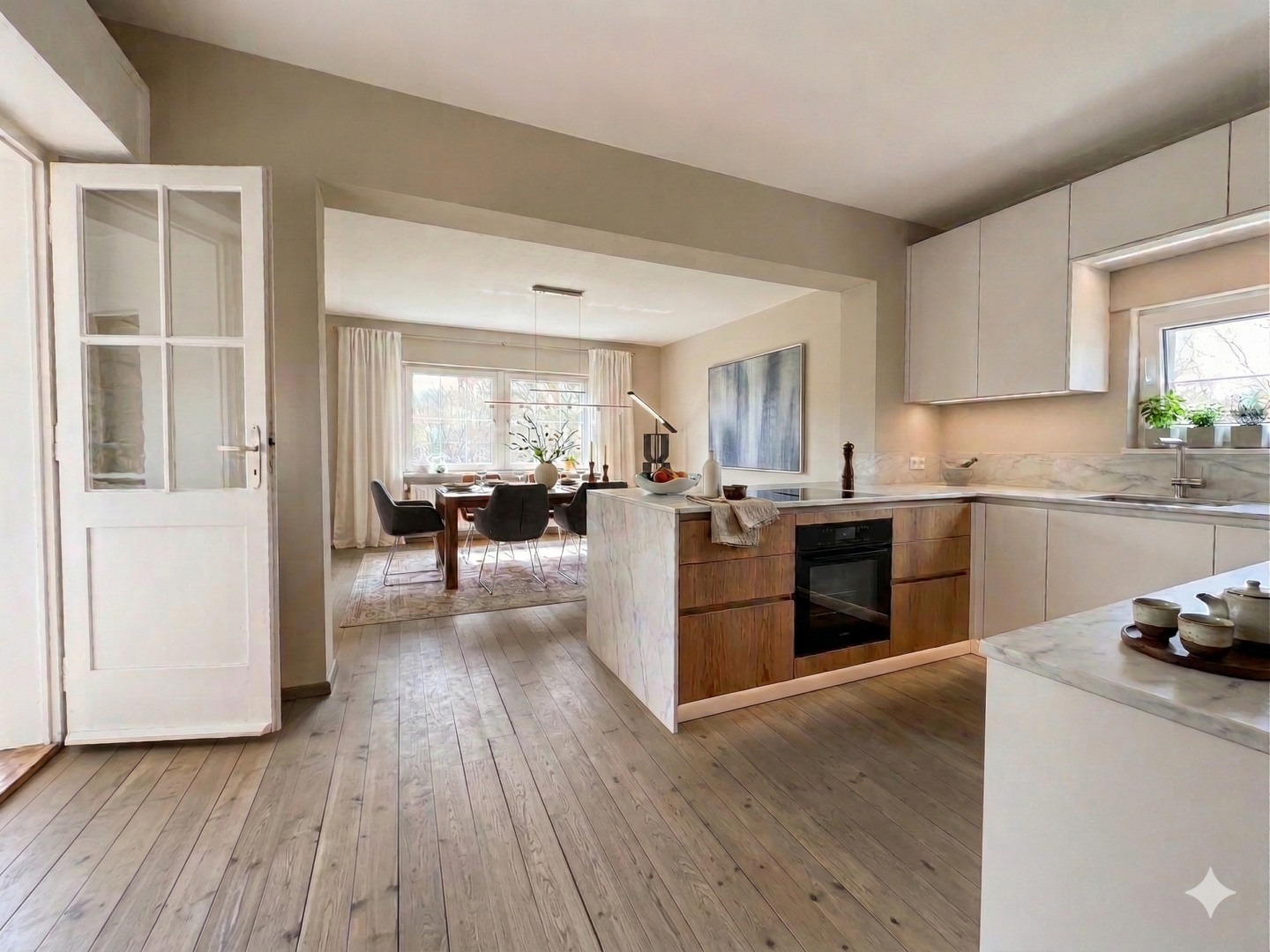 Die Immobilie überzeugt durch ihren klassischen Altbaucharakter. In vielen Wohn- und Schlafräumen sind originale Holzdielenböden erhalten, ergänzt durch historische Schiebetüren sowie eine charaktervolle Holztreppe im Treppenhaus. Hohe Decken unterstreichen das großzügige Raumgefühl.