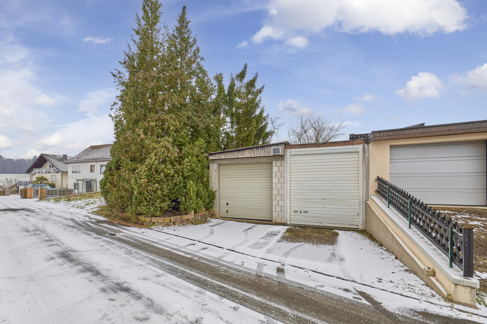 Bereits auf dem Grundstück vorhanden sind zwei massiv gebaute Doppelgaragen, die vielseitig genutzt werden können. Eine der Garagen ist aktuell für 50 € monatlich vermietet; das Mietverhältnis kann unter Einhaltung der gesetzlichen Kündigungsfrist von drei Monaten beendet werden.