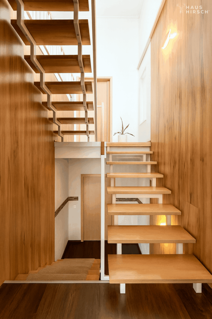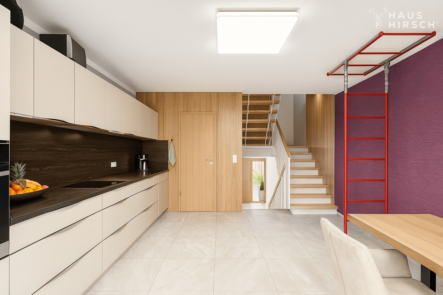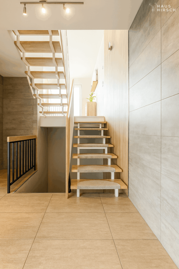 Die massive Bauausführung in Kombination mit dem modernen Split-Level-Grundriss verleiht dem Haus eine besondere räumliche Struktur. Auf mehreren Ebenen verteilen sich vier helle Zimmer, die sowohl Rückzugsorte als auch offen gestaltete Wohnbereiche bieten. Diese Aufteilung schafft ein modernes Wohnkonzept, das Funktionalität und zeitgemäße Wohnansprüche sinnvoll miteinander verbindet.