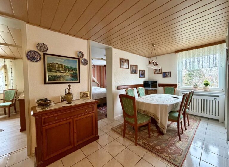 Der separate Essbereich, der direkt an die großzügige Einbauküche aus Massivholz anschließt, bildet das funktionale Herzstück der Wohnung. Die offen gestaltete Verbindung zwischen Küche, Essbereich und Wohnzimmer schafft einen angenehmen, fließenden Übergang der Wohnbereiche und lädt zum gemeinsamen Verweilen ein.