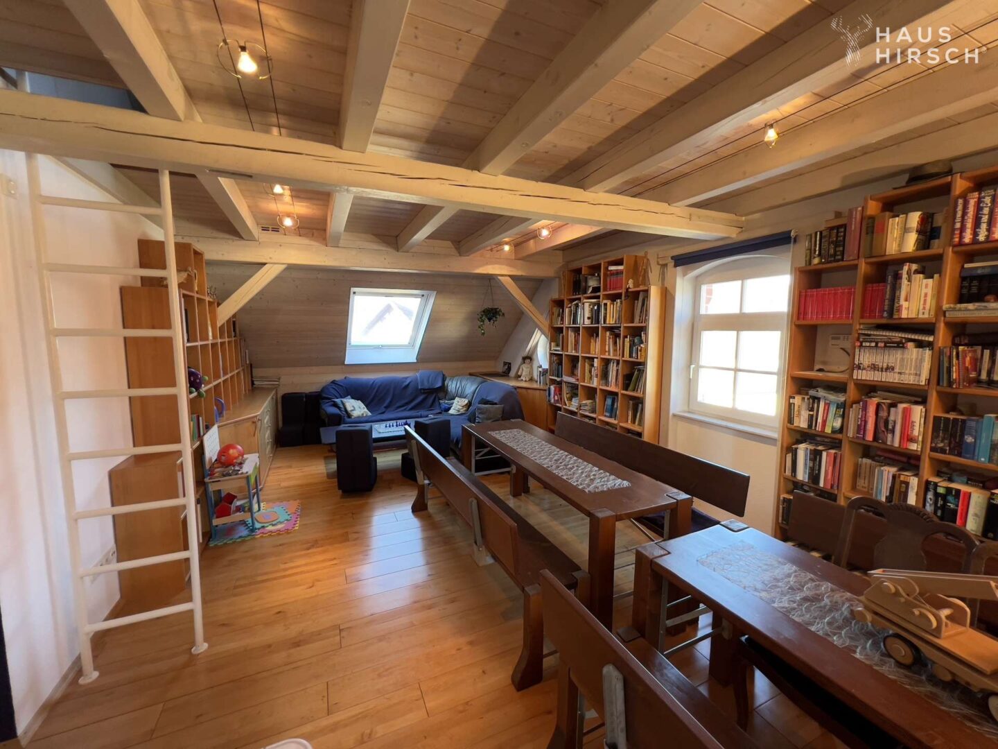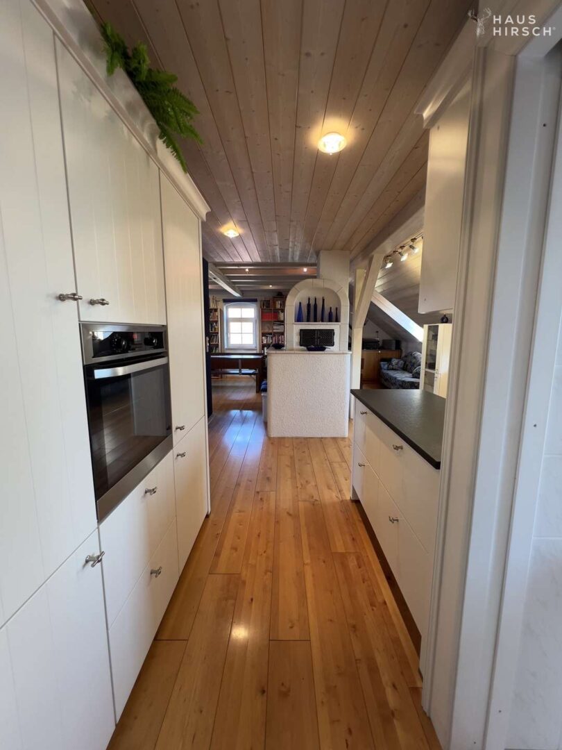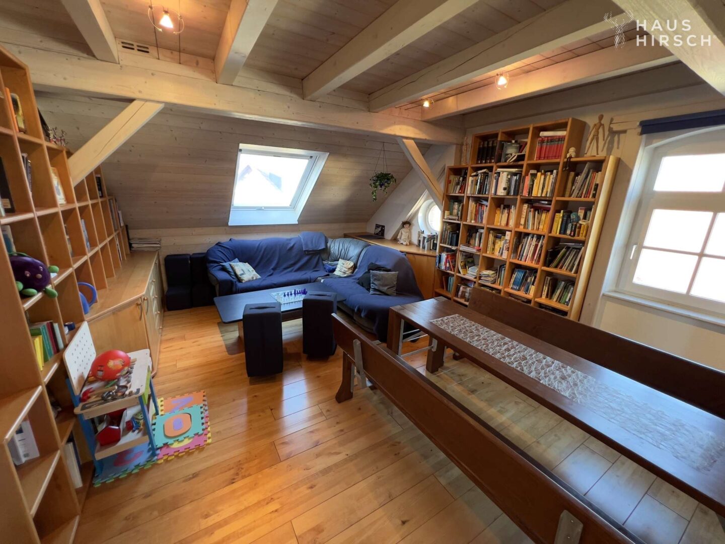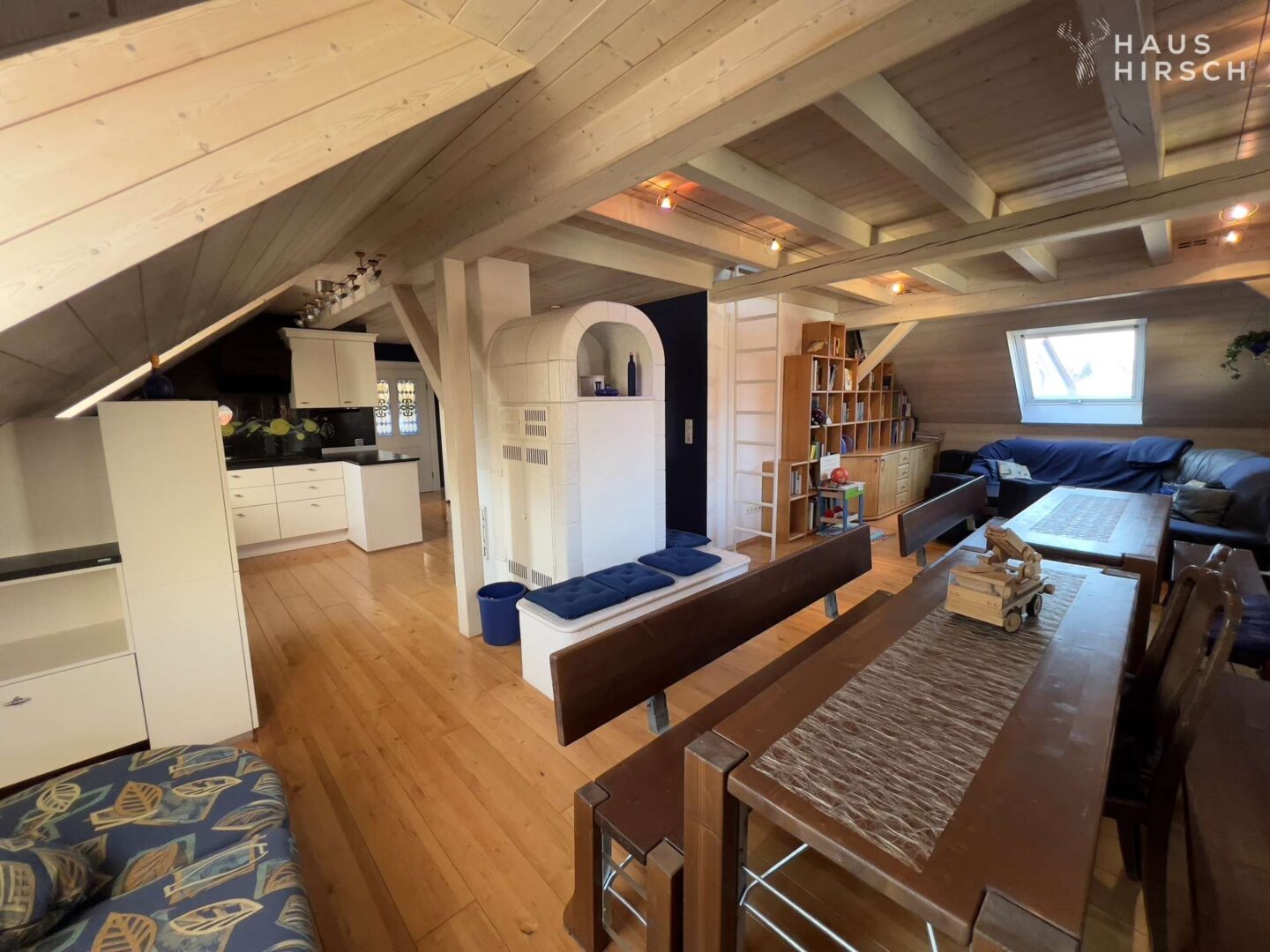 Diese gemütliche Wohnung unter dem Dach bietet eine offene Wohnatmosphäre mit einem zentralen Kachelofen und bietet Zugang zu einem zusätzlichen Stauraum im Spitzgiebel, der auch als Kinderschlafzimmer genutzt werden kann. Die Küche ist neu und hochwertig ausgestattet. Das Schlafzimmer (18,51 m²) ist mit maßgefertigten Massivholzmöbeln eingerichtet. Ein weiteres Highlight ist das kleine, charmante Kinderzimmer (15,5 m²).