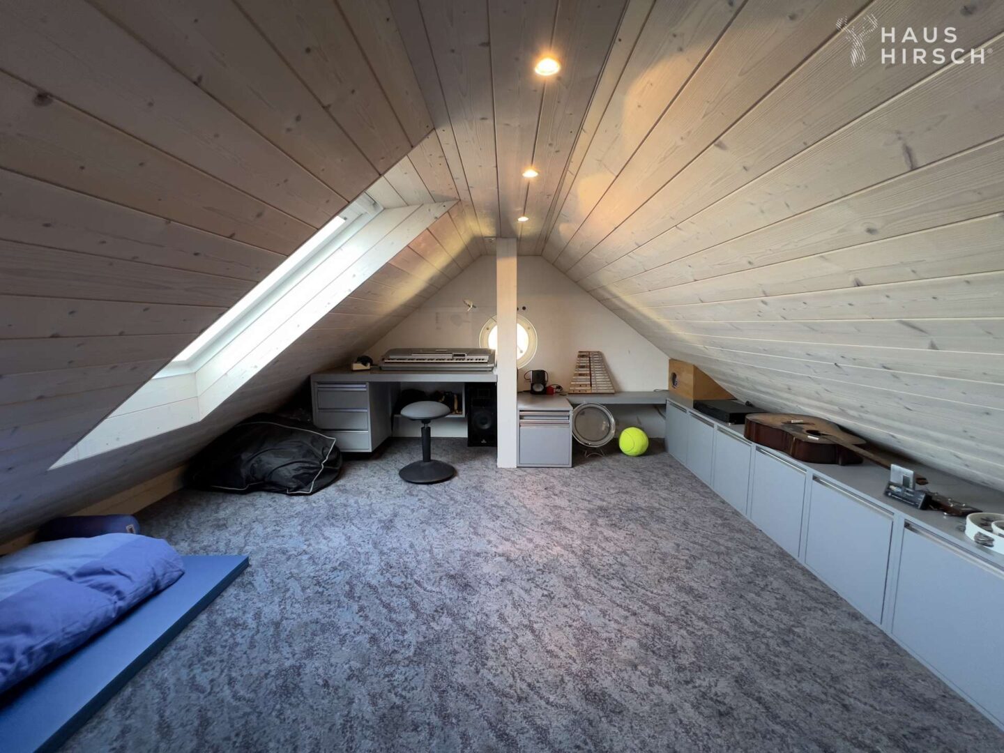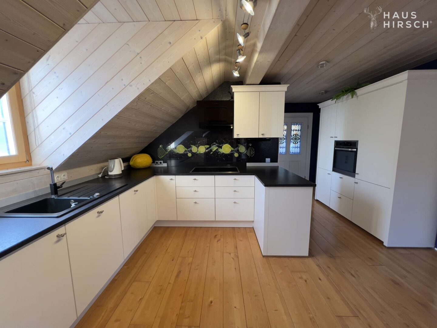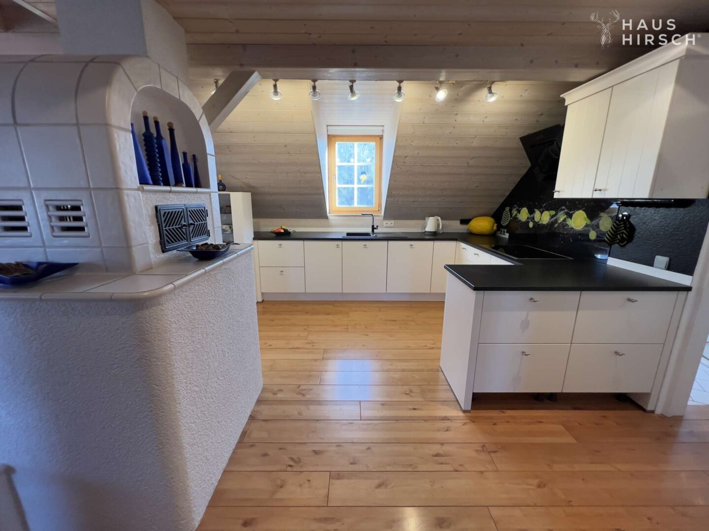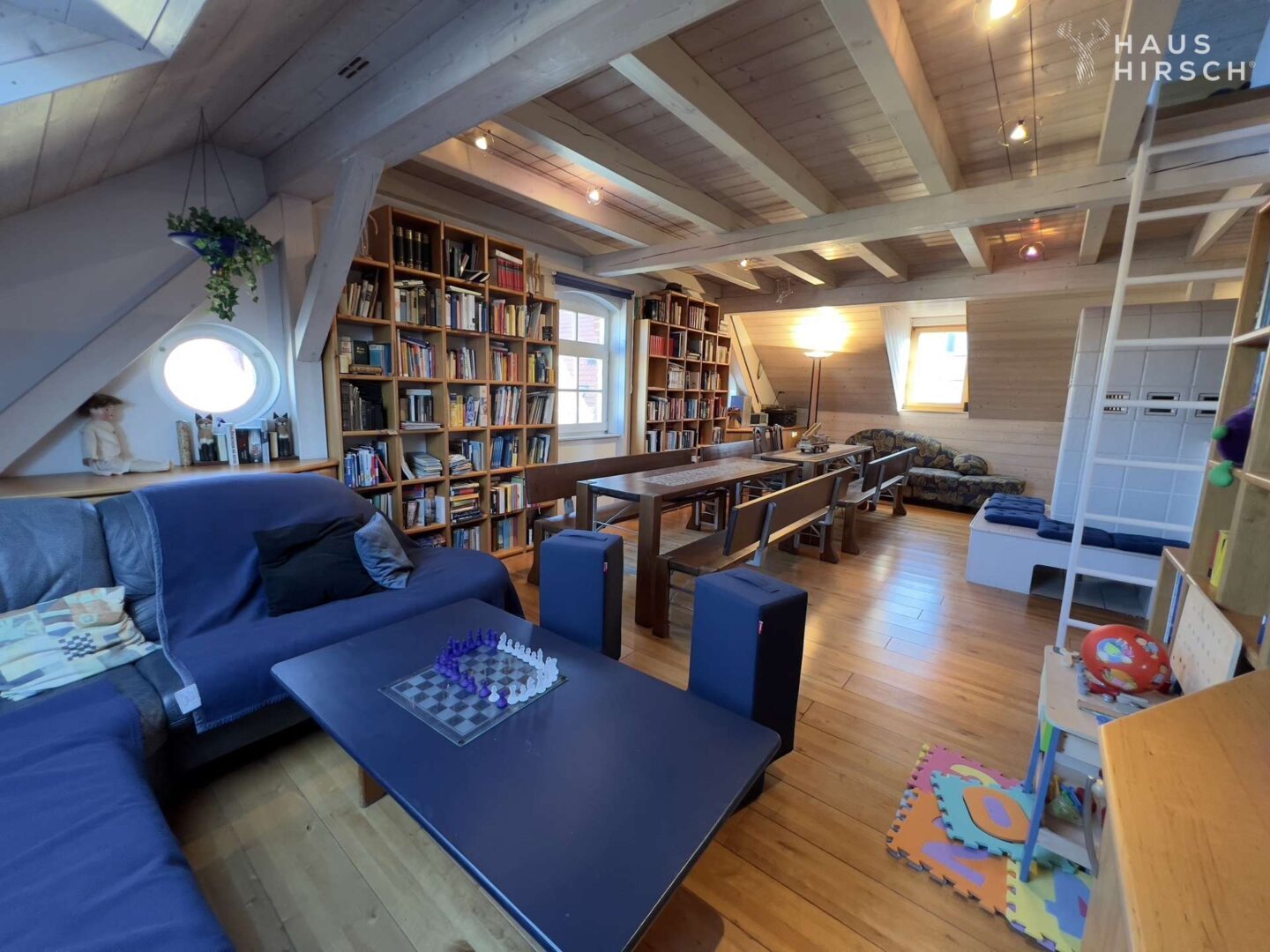 Diese gemütliche Wohnung unter dem Dach bietet eine offene Wohnatmosphäre mit einem zentralen Kachelofen und bietet Zugang zu einem zusätzlichen Stauraum im Spitzgiebel, der auch als Kinderschlafzimmer genutzt werden kann. Die Küche ist neu und hochwertig ausgestattet. Das Schlafzimmer (18,51 m²) ist mit maßgefertigten Massivholzmöbeln eingerichtet. Ein weiteres Highlight ist das kleine, charmante Kinderzimmer (15,5 m²).