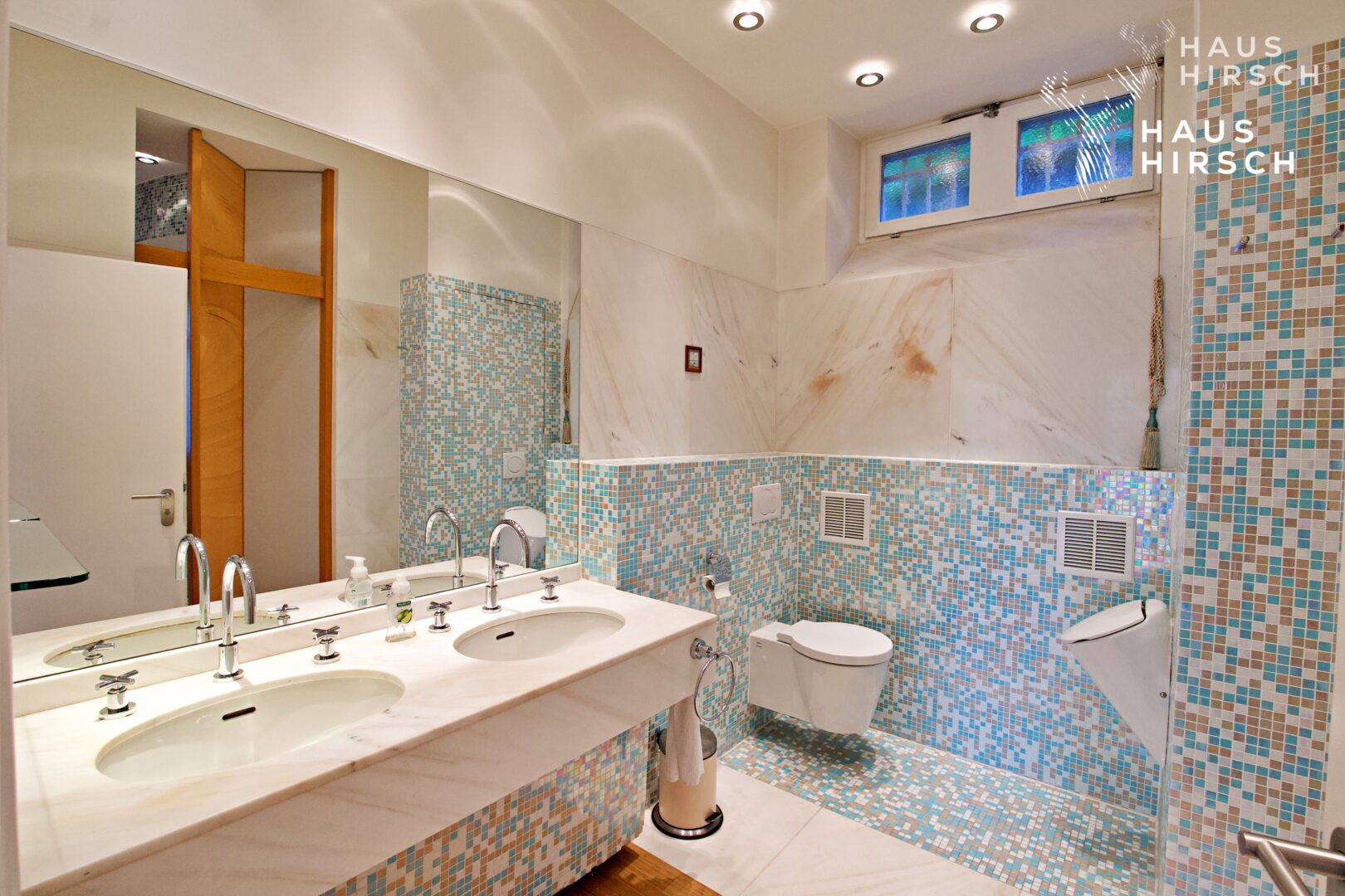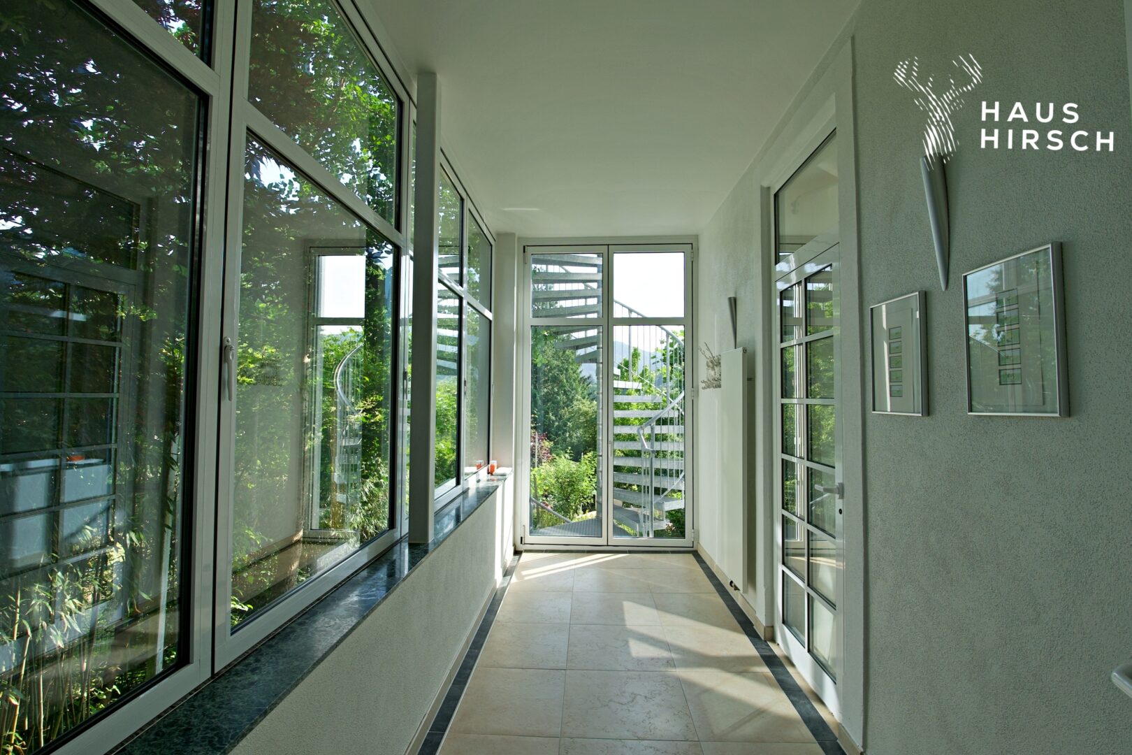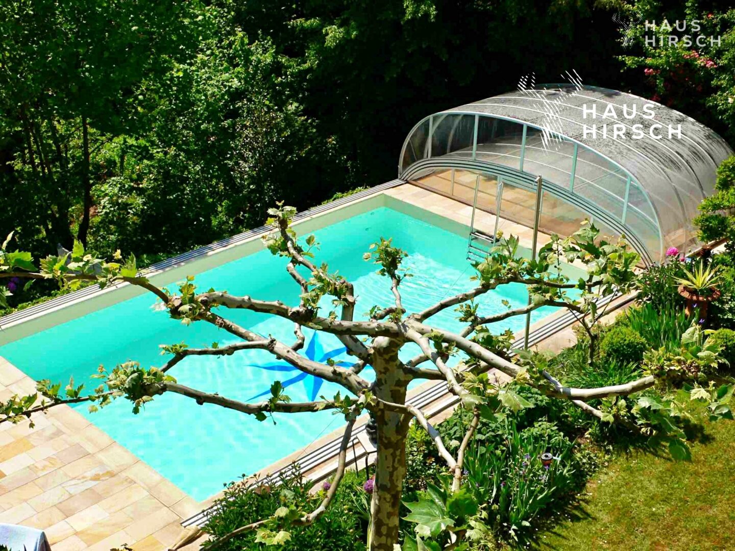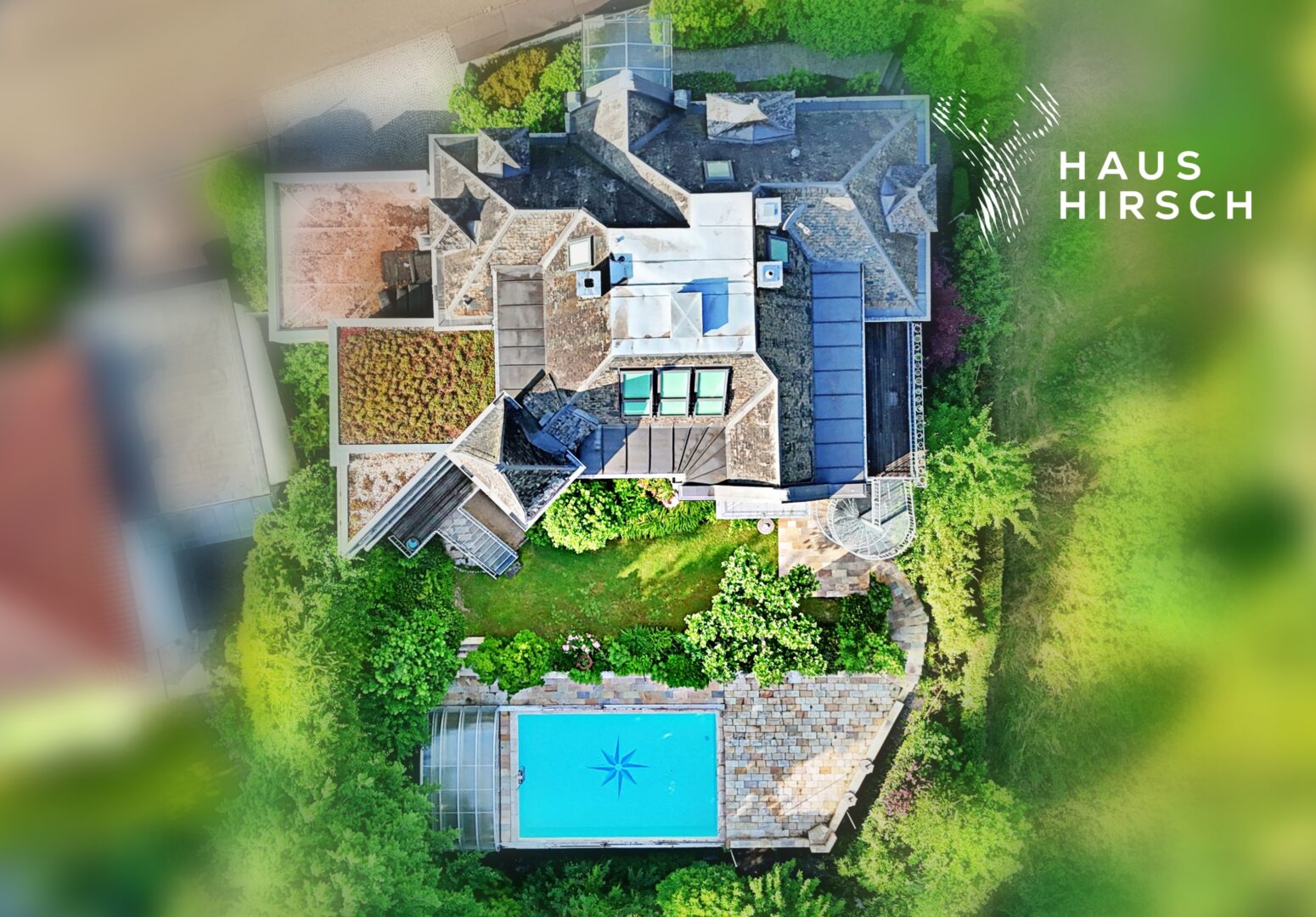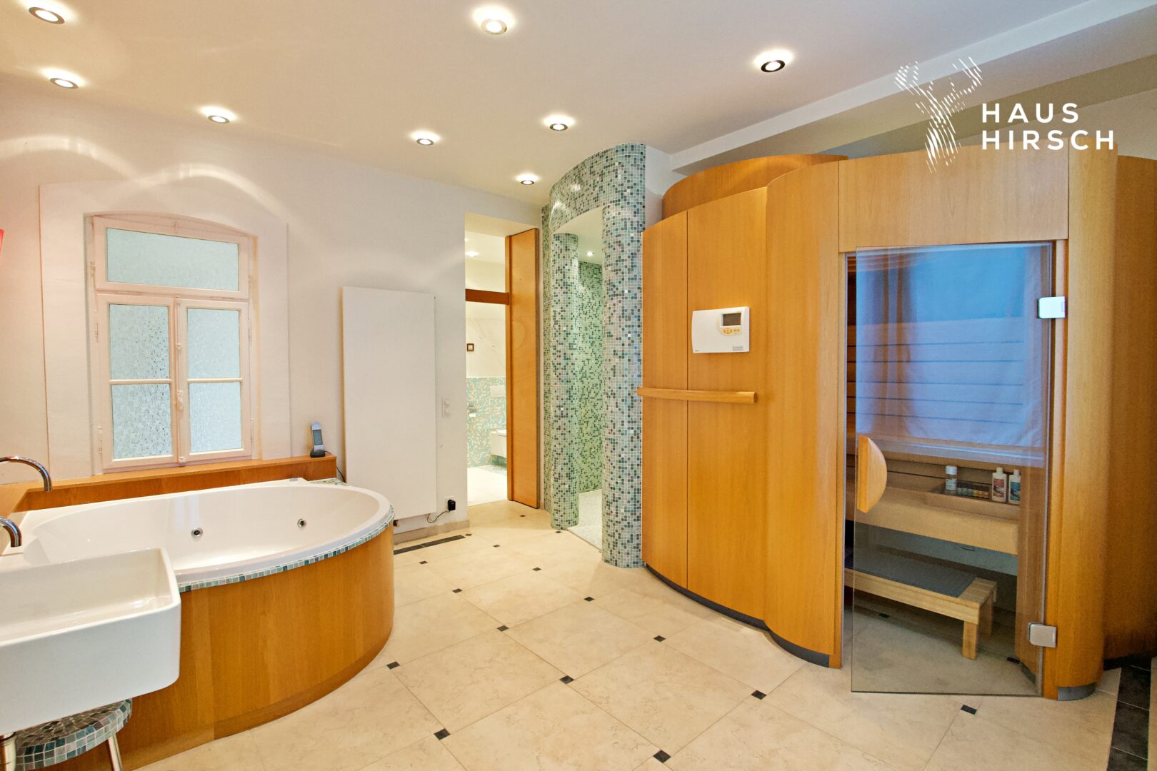 Ein moderner, zweigeschossiger Glasanbau, großzügige Sonnenterrassen, zwei Wintergärten, ein gepflegter Garten sowie ein beheiztes Außenschwimmbad bieten höchsten Wohnkomfort. Die Villa verfügt über 15 Zimmer, vier Badezimmer, zwei voll ausgestattete Küchen und einen privaten Wellnessbereich. Beheizt wird das Anwesen über eine Gaszentralheizung.