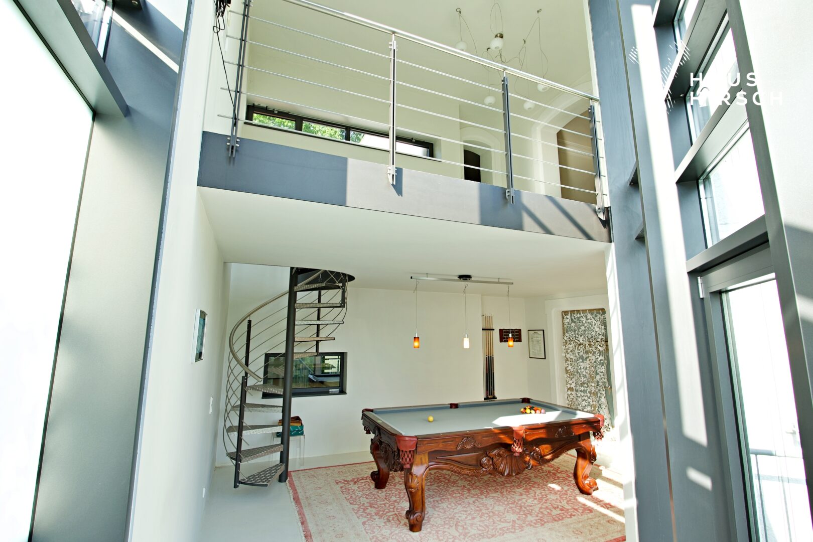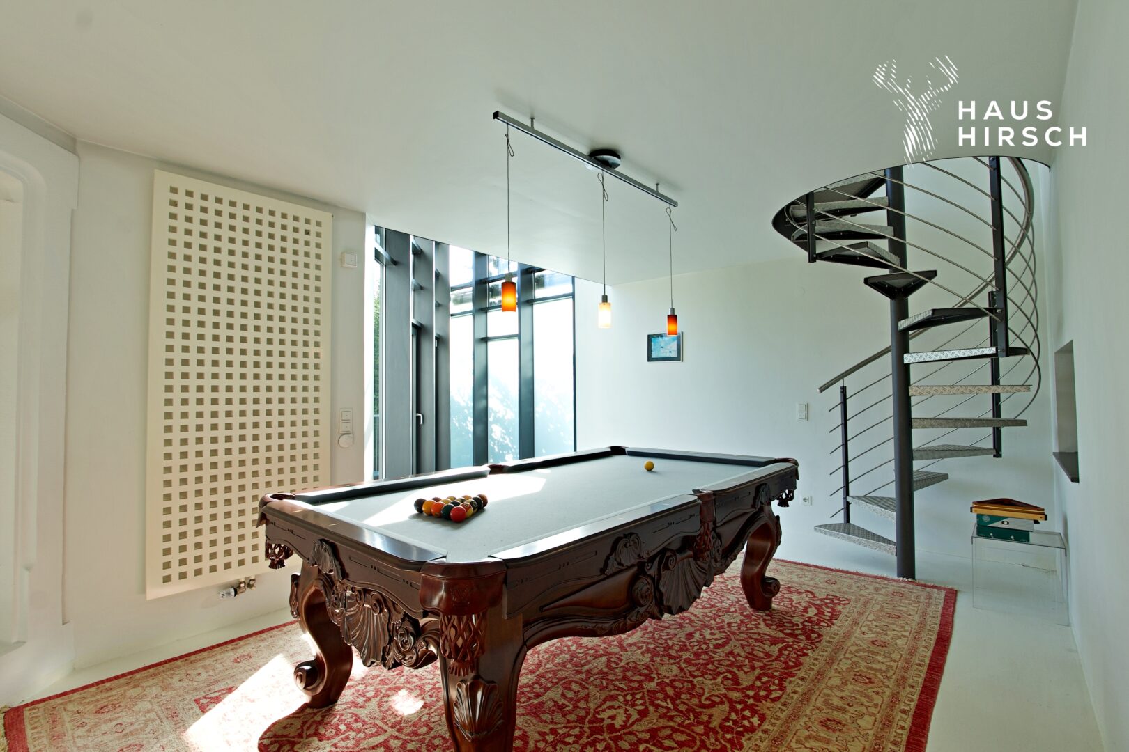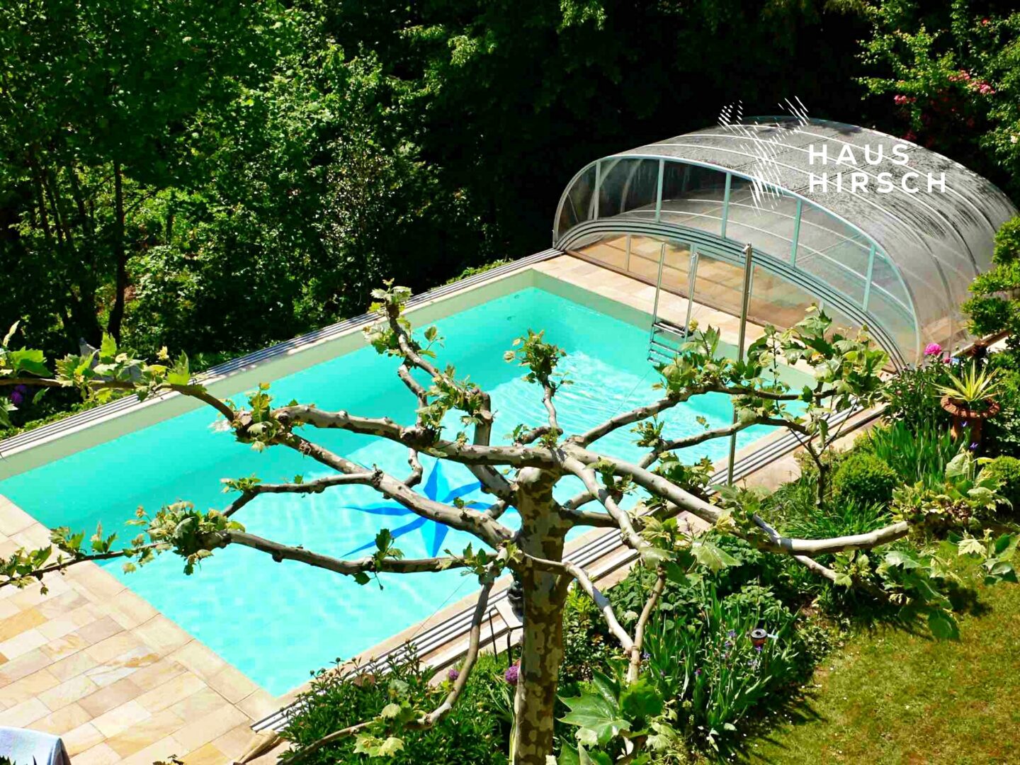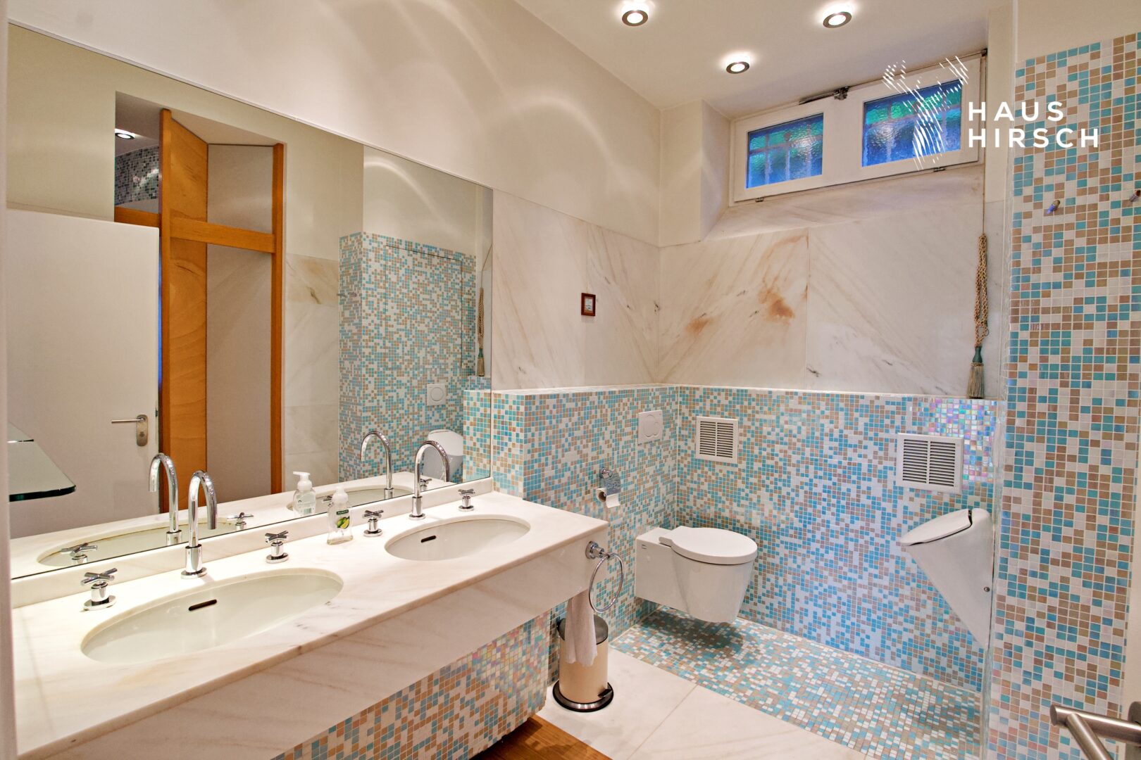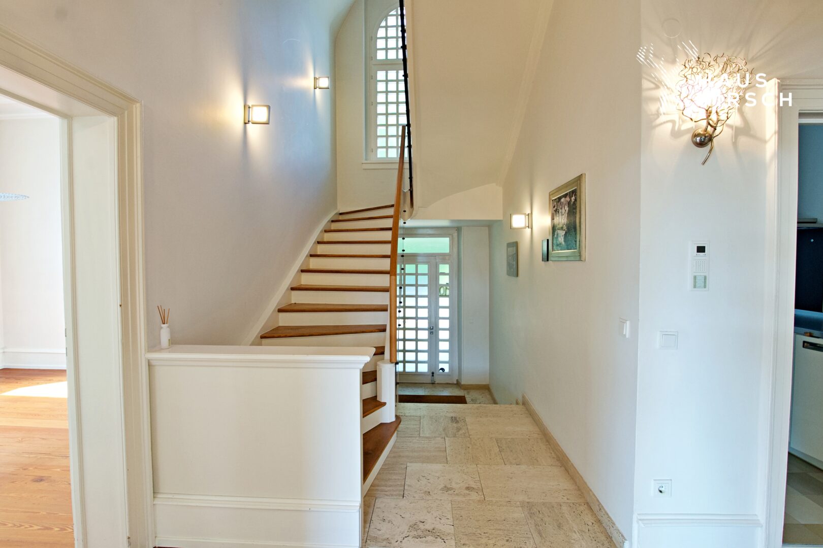 Ein moderner, zweigeschossiger Glasanbau, großzügige Sonnenterrassen, zwei Wintergärten, ein gepflegter Garten sowie ein beheiztes Außenschwimmbad bieten höchsten Wohnkomfort. Die Villa verfügt über 15 Zimmer, vier Badezimmer, zwei voll ausgestattete Küchen und einen privaten Wellnessbereich. Beheizt wird das Anwesen über eine Gaszentralheizung.