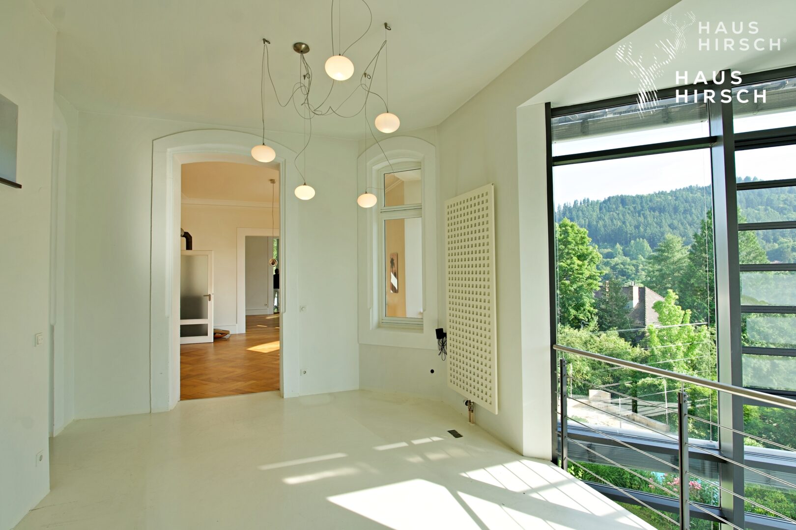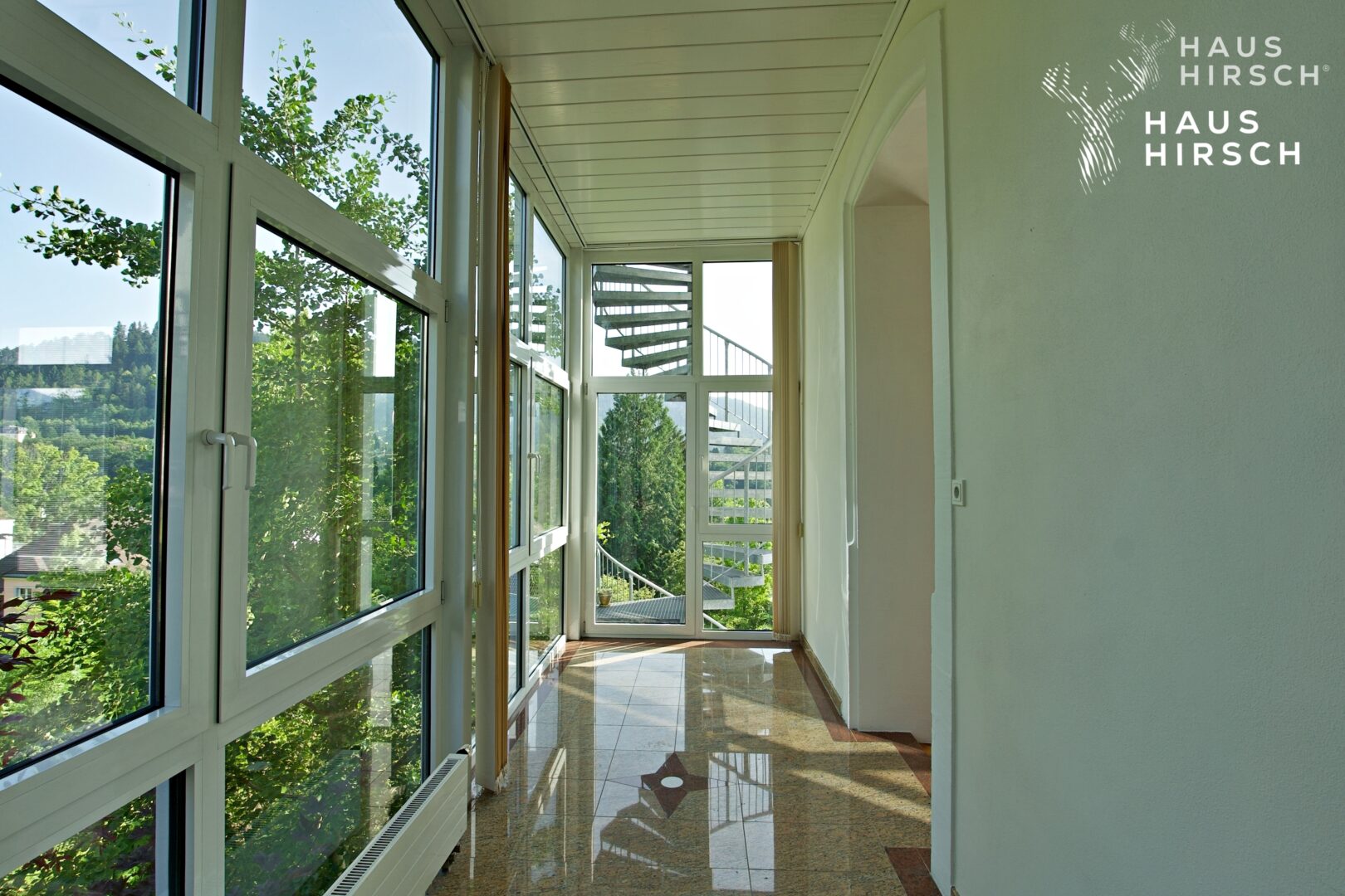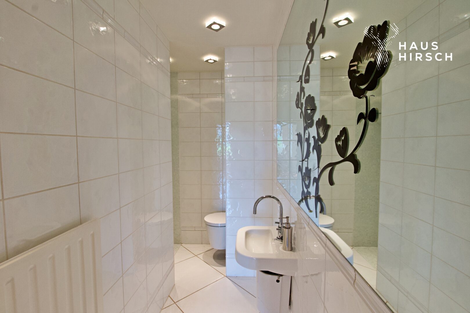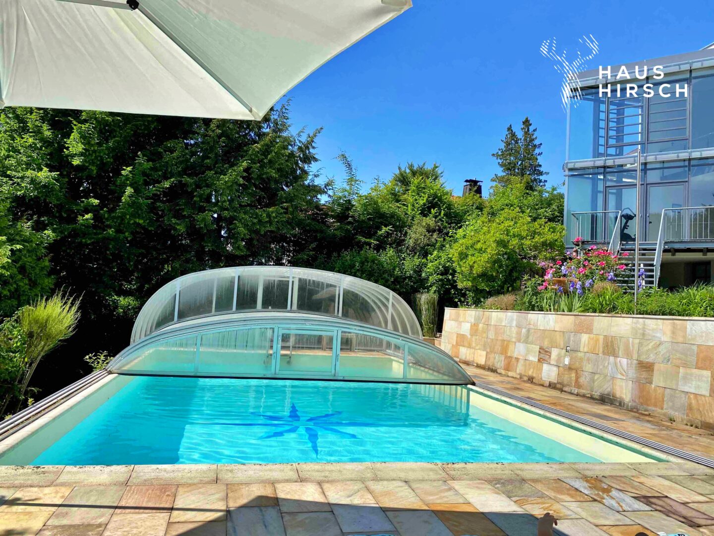 Ein moderner, zweigeschossiger Glasanbau, großzügige Sonnenterrassen, zwei Wintergärten, ein gepflegter Garten sowie ein beheiztes Außenschwimmbad bieten höchsten Wohnkomfort. Die Villa verfügt über 15 Zimmer, vier Badezimmer, zwei voll ausgestattete Küchen und einen privaten Wellnessbereich. Beheizt wird das Anwesen über eine Gaszentralheizung.