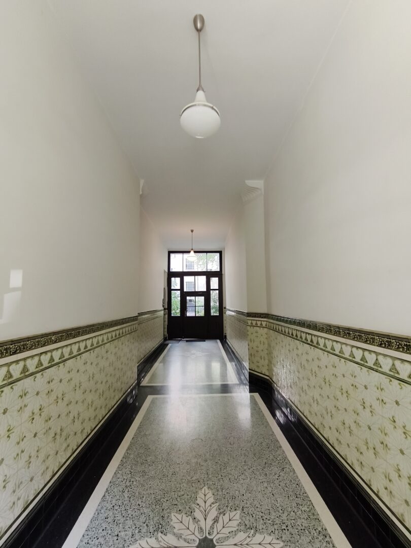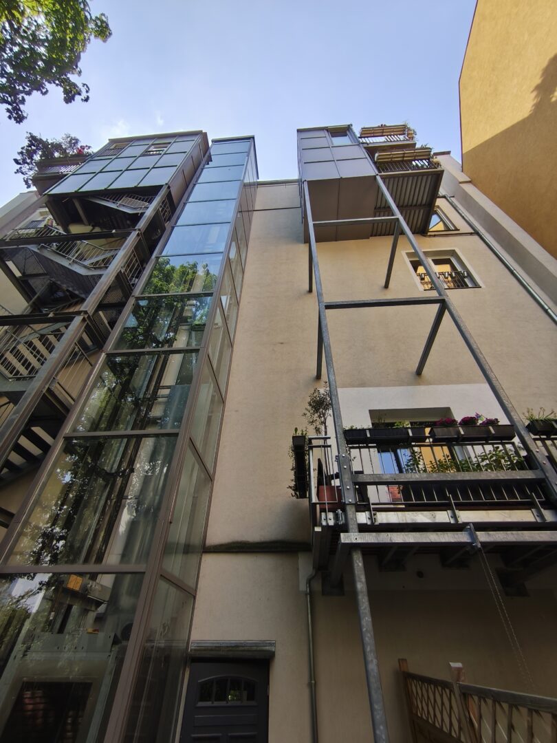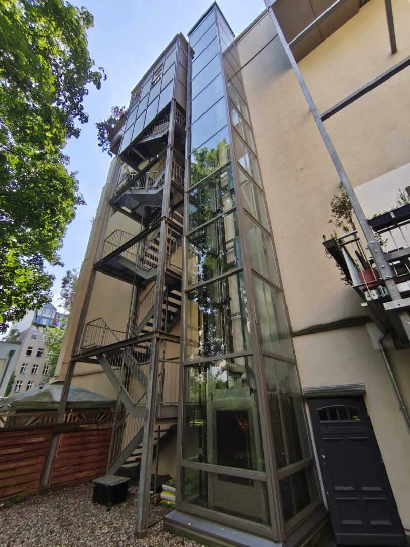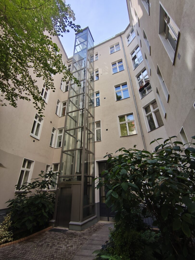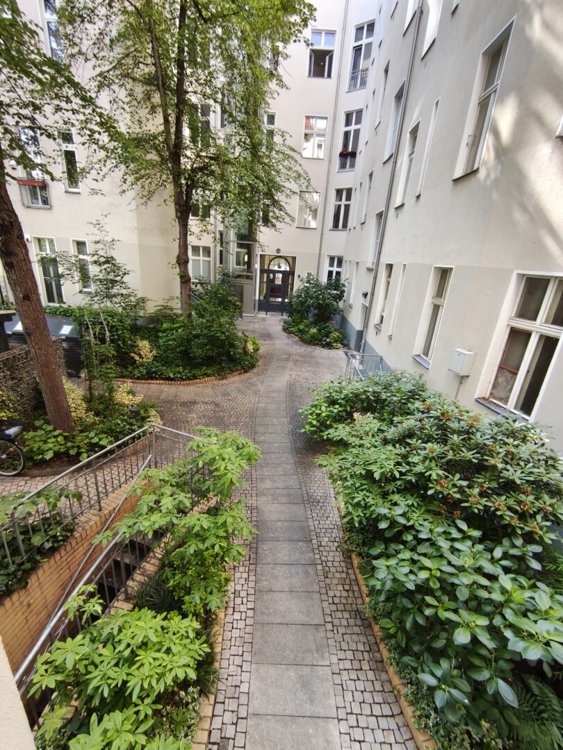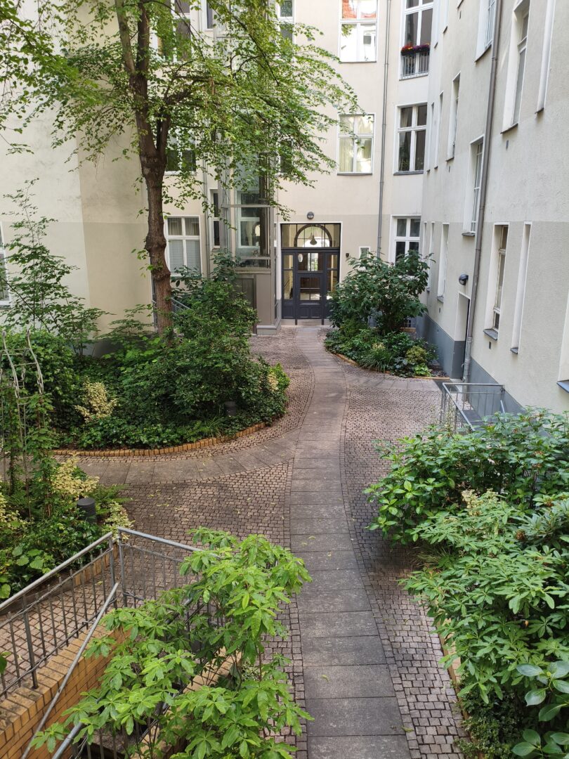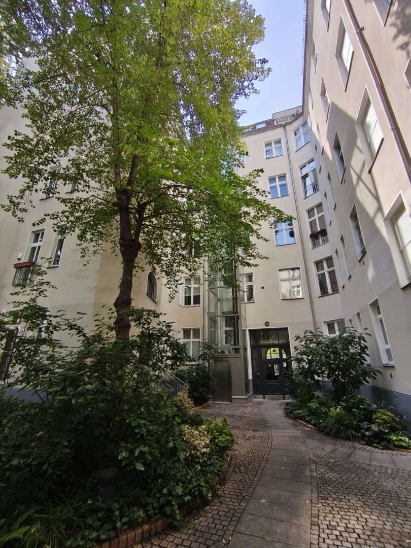 Das Penthouse befindet sich im bzw. auf dem Hinterhaus. Es wurde aus einer der beiden oberen Wohnungen und dem darüberliegenden halben Dachgeschoss hergestellt. Den Hinterhof erreicht man von der Straße aus durch einen Durchgang, der an den Seiten von Original-Keramik im Jugendstil von 1906 flankiert ist. Der Hinterhof beherbergt eine sehr gepflegte Grünanlage mit vielen Pflanzen und einem kleinen rauschenden Wasserfall. Das Penthouse kann man über die schöne Altbau-Treppe im Hinterhaus oder über einen exklusiven Aufzug an der Hinterwand des Hinterhauses erreichen. Neben dem Aufzug befindet sich eine Feuer-Rettungs-Treppe. Zum Hof hinter dem Hinterhaus haben nur die Benutzer des Fahrstuhls Zugang und die beiden Wohnungen im Erdgeschoss, deren Gärten sich dort befinden.