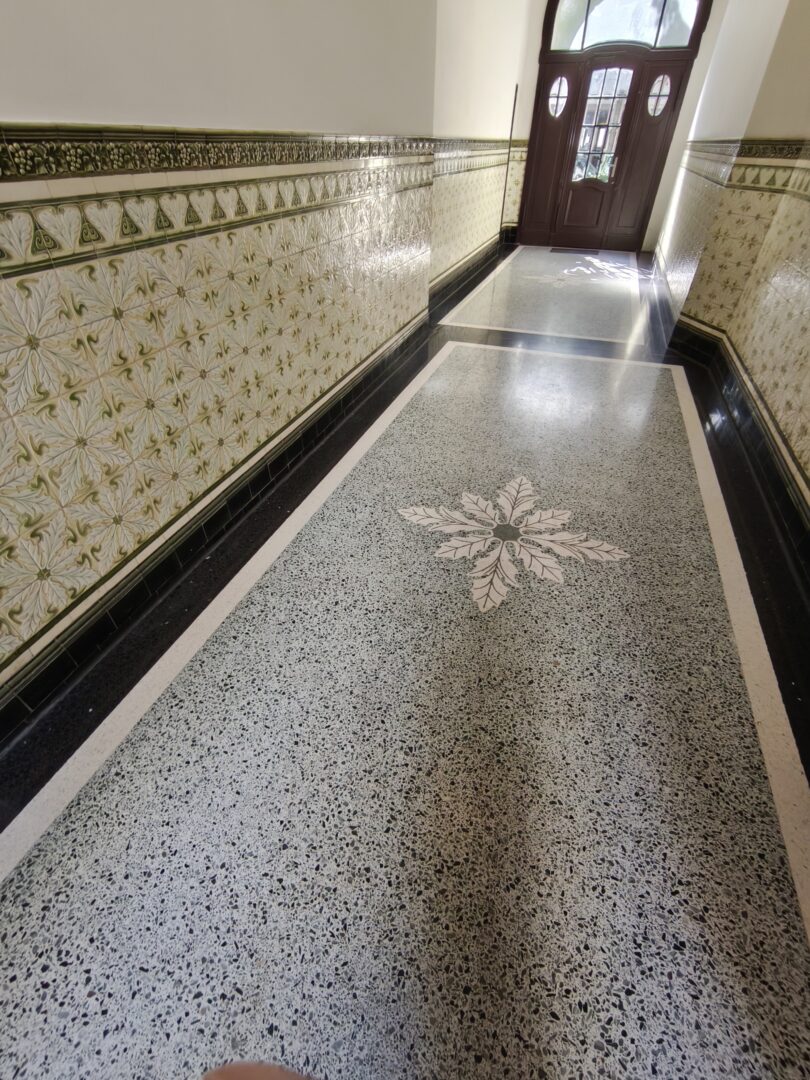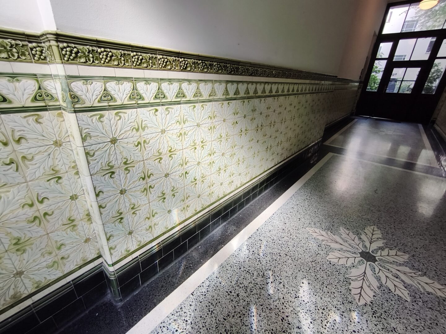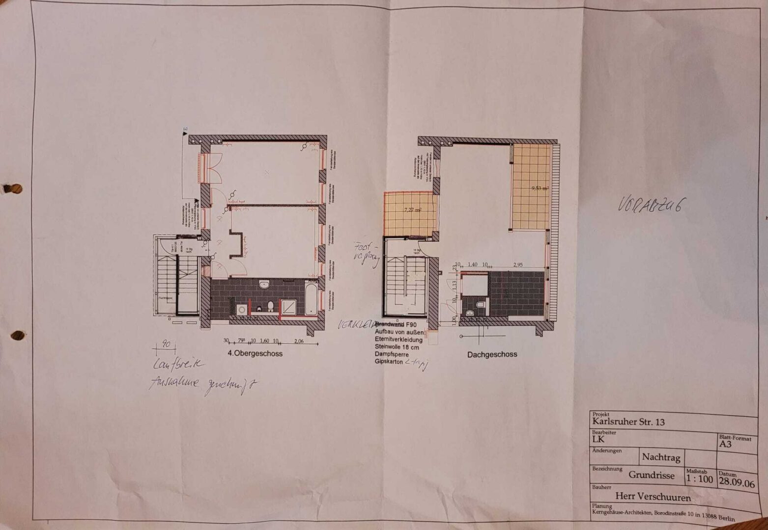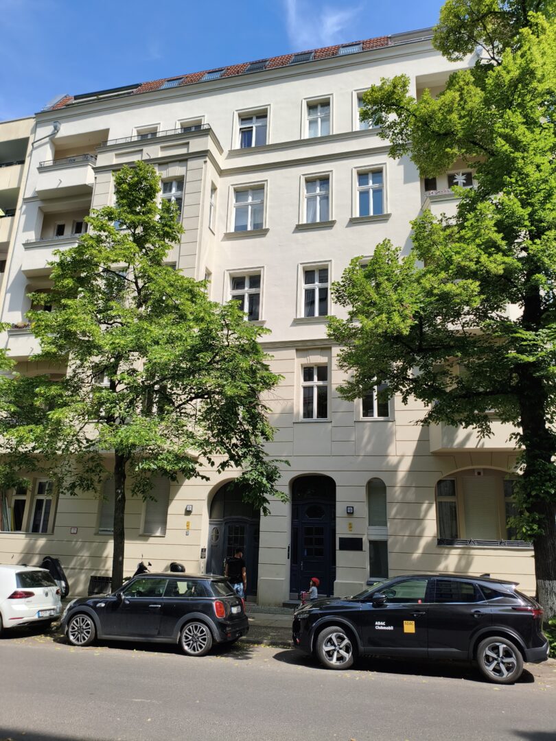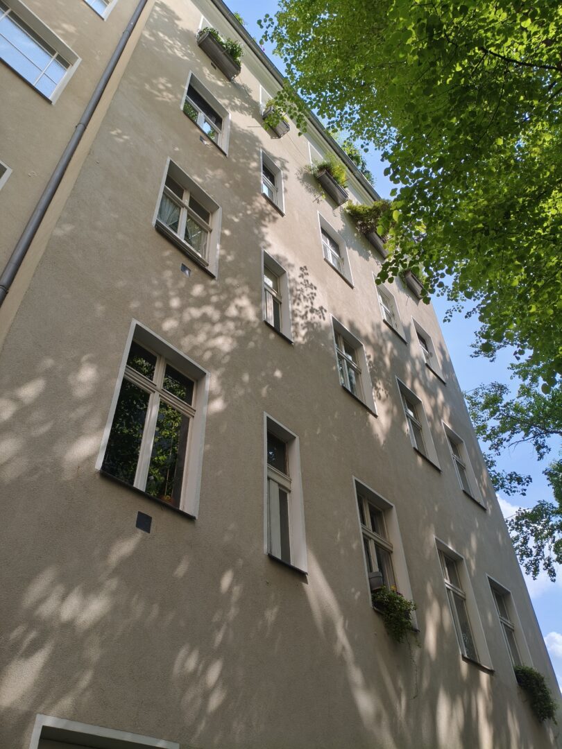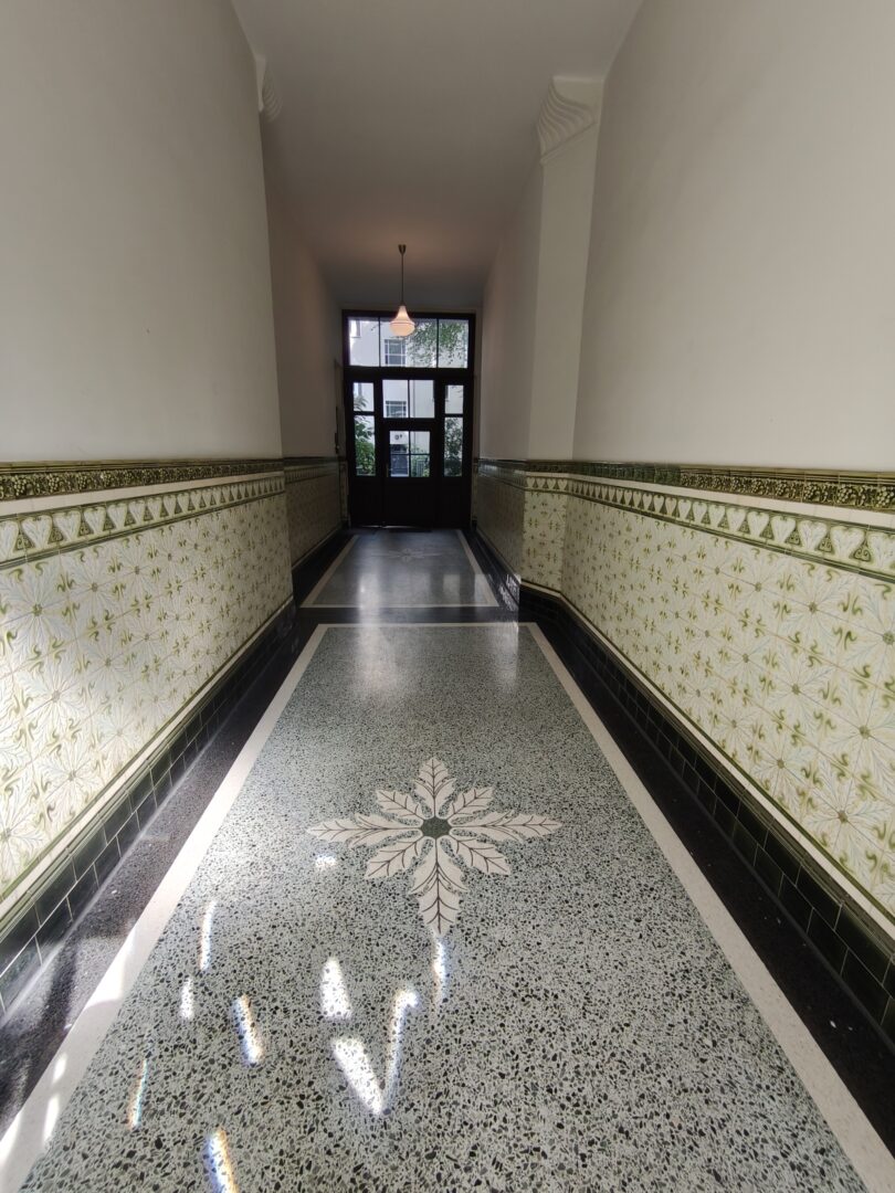 Das Penthouse befindet sich im bzw. auf dem Hinterhaus. Es wurde aus einer der beiden oberen Wohnungen und dem darüberliegenden halben Dachgeschoss hergestellt. Den Hinterhof erreicht man von der Straße aus durch einen Durchgang, der an den Seiten von Original-Keramik im Jugendstil von 1906 flankiert ist. Der Hinterhof beherbergt eine sehr gepflegte Grünanlage mit vielen Pflanzen und einem kleinen rauschenden Wasserfall. Das Penthouse kann man über die schöne Altbau-Treppe im Hinterhaus oder über einen exklusiven Aufzug an der Hinterwand des Hinterhauses erreichen. Neben dem Aufzug befindet sich eine Feuer-Rettungs-Treppe. Zum Hof hinter dem Hinterhaus haben nur die Benutzer des Fahrstuhls Zugang und die beiden Wohnungen im Erdgeschoss, deren Gärten sich dort befinden.