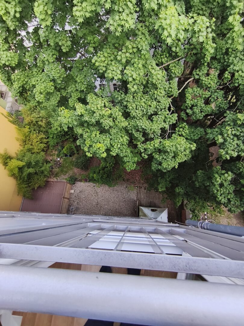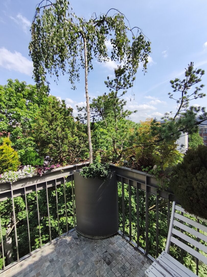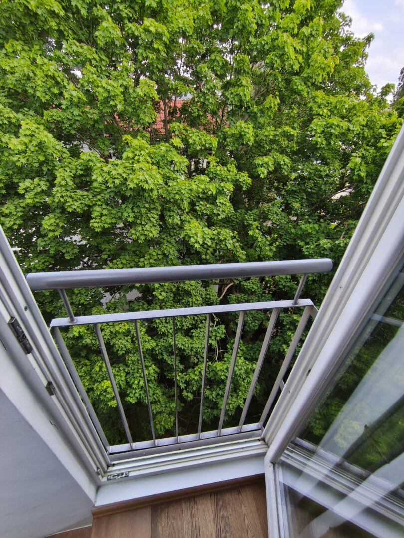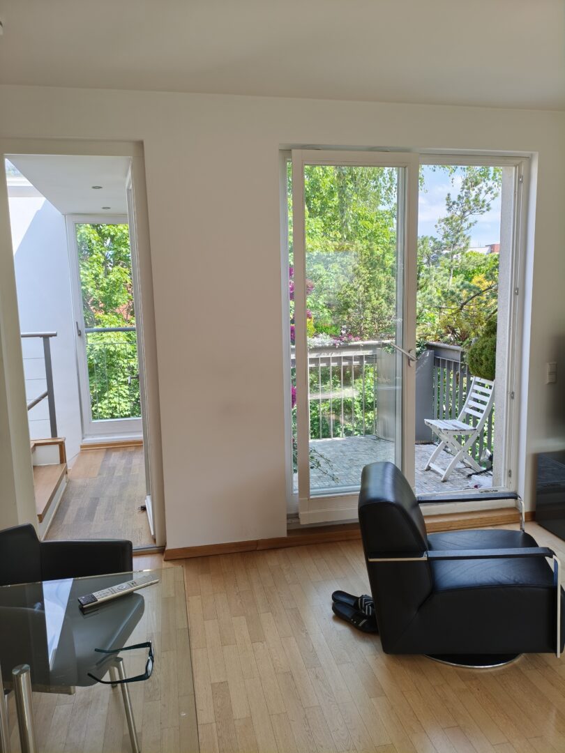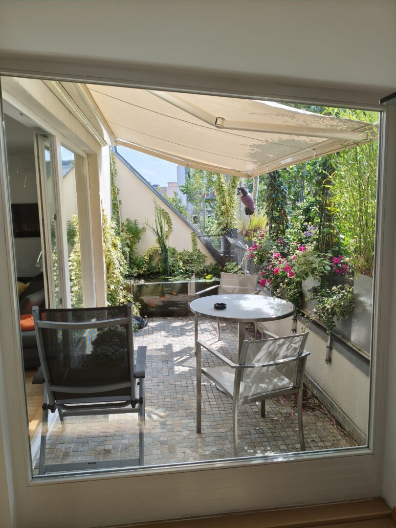Die obere Etage der Wohnung besteht aus Wohnzimmer-Küche, Gäste-WC und zwei Balkonen. Auf dem größeren Balkon befindet sich ein Aquarium-Teich mit Goldfischen und quakenden Fröschen. Die Frösche lassen sich auch gerne auf dem Boden des Balkons mit Regenwürmern füttern und klettern dazu am Efeu aus ihrem Teich und wieder zurück. Dieser Balkon kann durch eine elektrische Markise beschattet werden. Die in die Markise integrierte Beleuchtung sorgt für gemütliche Abende. Auf den Balkonen und im wohnungsinternen Treppenhaus gibt es viele Pflanzen. Diese werden teilweise durch Bewässerungscomputer automatisch bewässert. Der Eigentümer ist ein Naturliebhaber und Pflanzenprofi. Auf dem kleineren Balkon steht eine von Pflanzen umgebene Bank, in der Ecke gegenüber wächst eine kleine Birke, links und rechts davon gibt es viele Pflanzen, und zwar in Profi-Blumenkästen, statt in kleinen Baumarkt-Blumenkästen. Die Wohnung ist in alle Richtungen umgeben von Bäumen, die in den angrenzenden Innenhöfen wachsen. Hinter den Bäumen sieht man Dächer der umgebenden Häuser. Straßenlärm ist hier oben nicht zu hören, auch Mücken gibt es nicht, so dass man bei passendem Wetter viele Fenster geöffnet lassen kann.