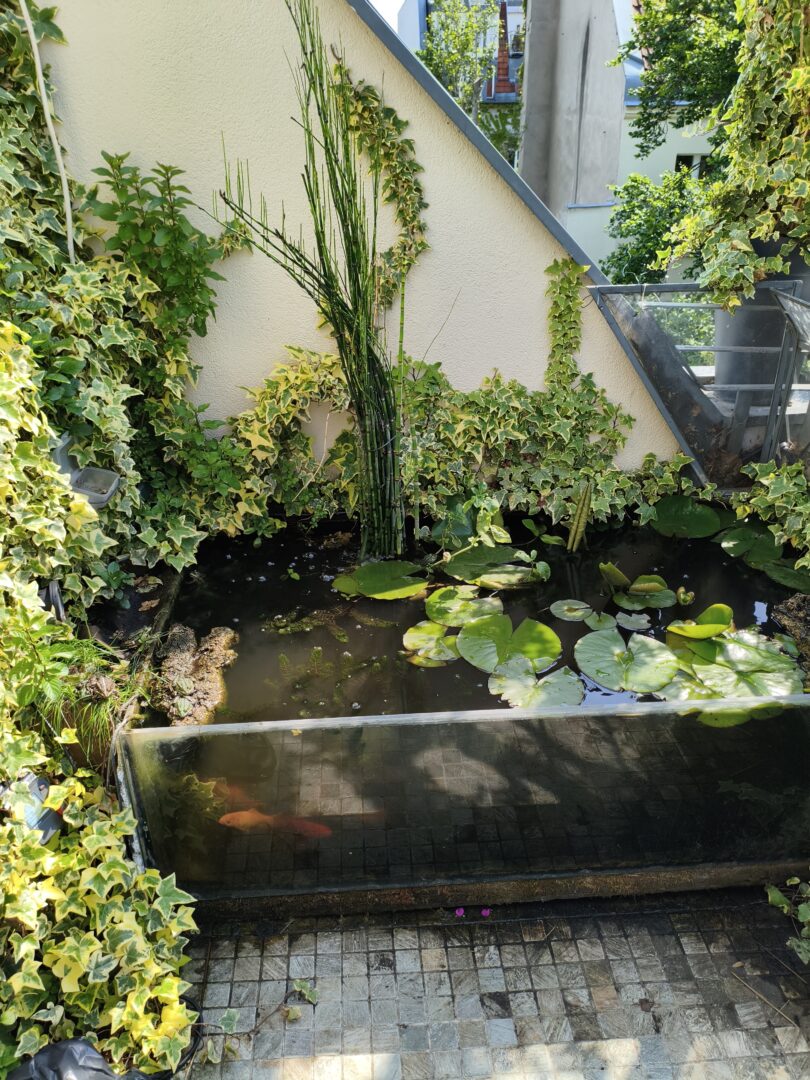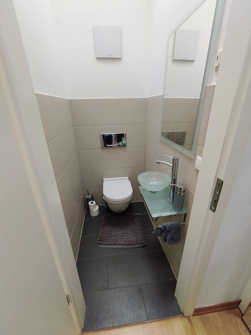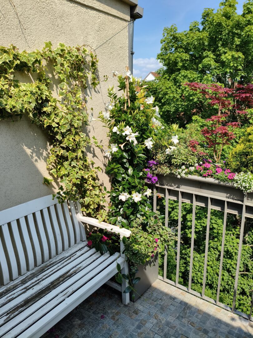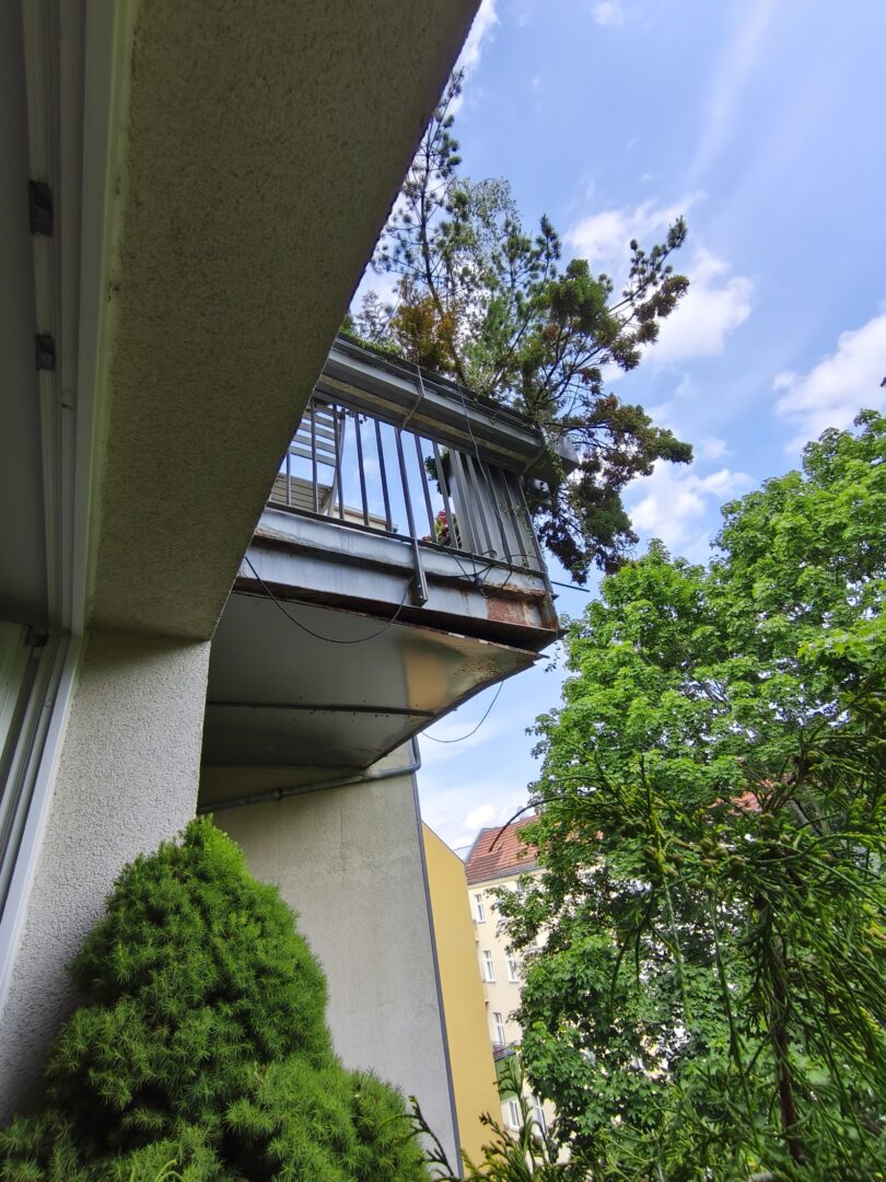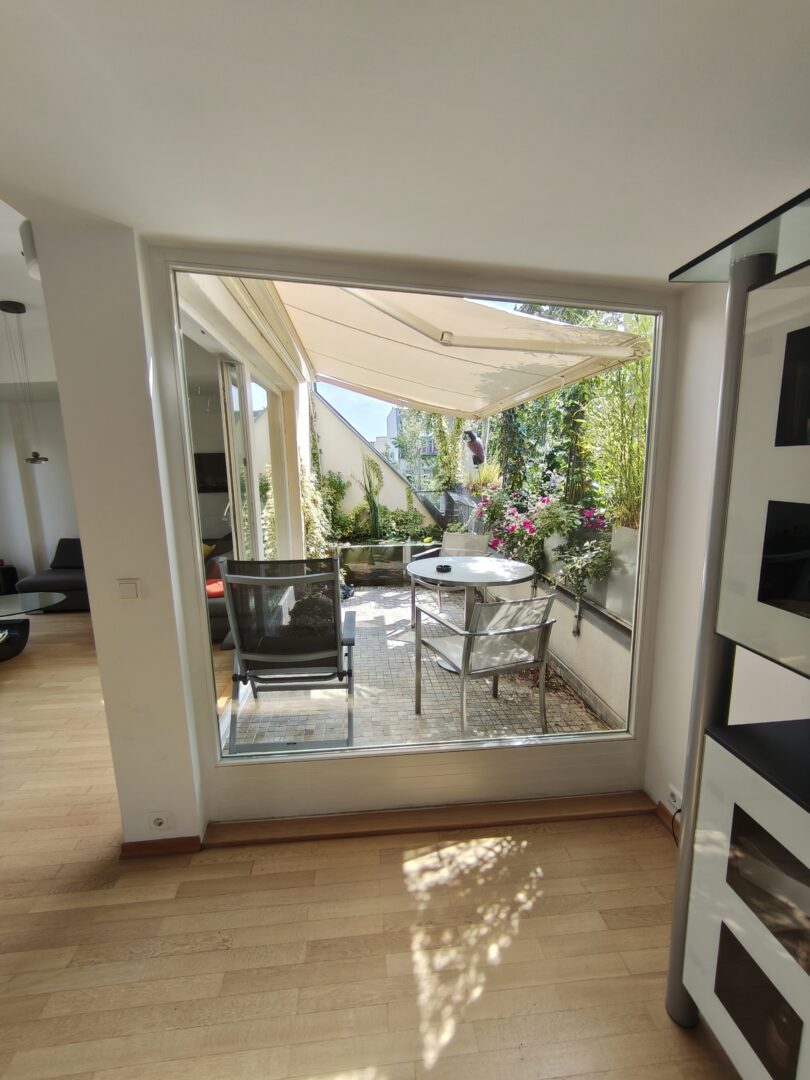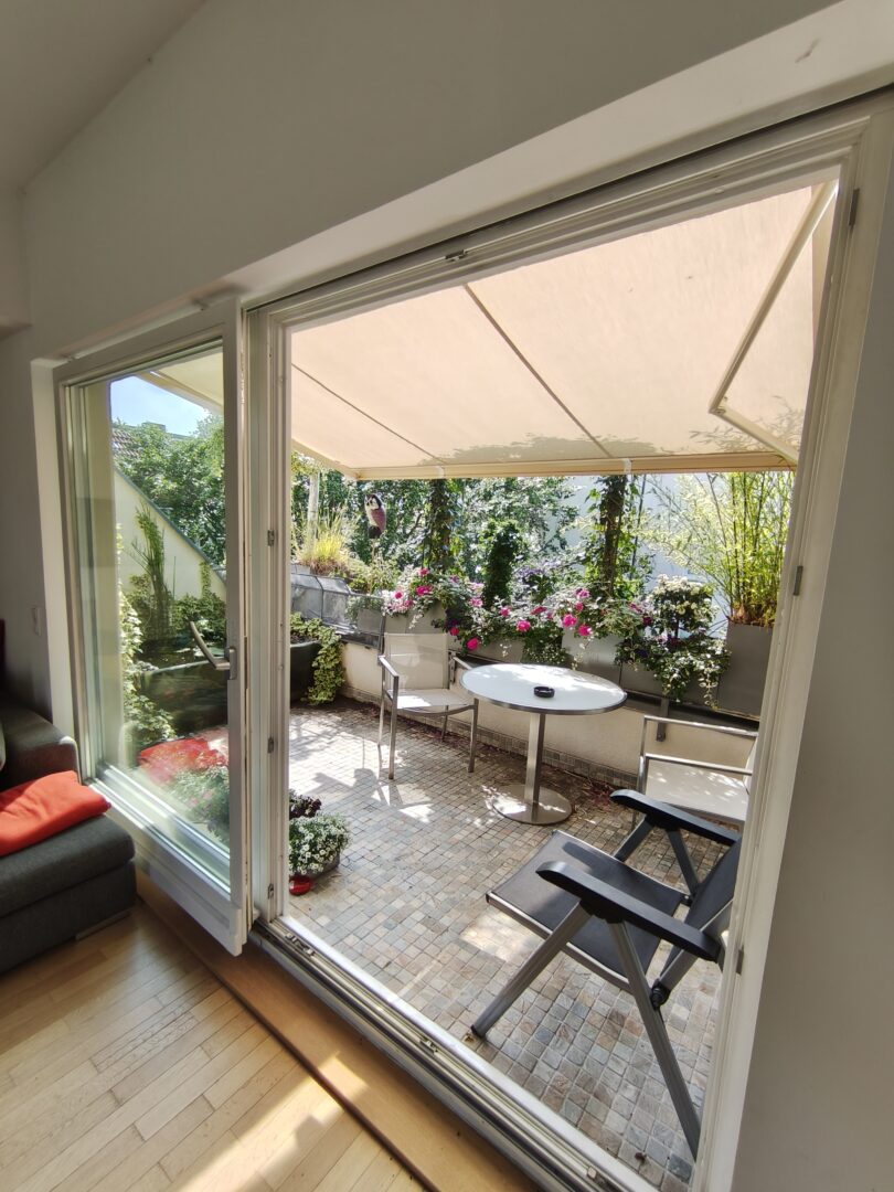 Die obere Etage der Wohnung besteht aus Wohnzimmer-Küche, Gäste-WC und zwei Balkonen. Auf dem größeren Balkon befindet sich ein Aquarium-Teich mit Goldfischen und quakenden Fröschen. Die Frösche lassen sich auch gerne auf dem Boden des Balkons mit Regenwürmern füttern und klettern dazu am Efeu aus ihrem Teich und wieder zurück. Dieser Balkon kann durch eine elektrische Markise beschattet werden. Die in die Markise integrierte Beleuchtung sorgt für gemütliche Abende. Auf den Balkonen und im wohnungsinternen Treppenhaus gibt es viele Pflanzen. Diese werden teilweise durch Bewässerungscomputer automatisch bewässert. Der Eigentümer ist ein Naturliebhaber und Pflanzenprofi. Auf dem kleineren Balkon steht eine von Pflanzen umgebene Bank, in der Ecke gegenüber wächst eine kleine Birke, links und rechts davon gibt es viele Pflanzen, und zwar in Profi-Blumenkästen, statt in kleinen Baumarkt-Blumenkästen. Die Wohnung ist in alle Richtungen umgeben von Bäumen, die in den angrenzenden Innenhöfen wachsen. Hinter den Bäumen sieht man Dächer der umgebenden Häuser. Straßenlärm ist hier oben nicht zu hören, auch Mücken gibt es nicht, so dass man bei passendem Wetter viele Fenster geöffnet lassen kann.