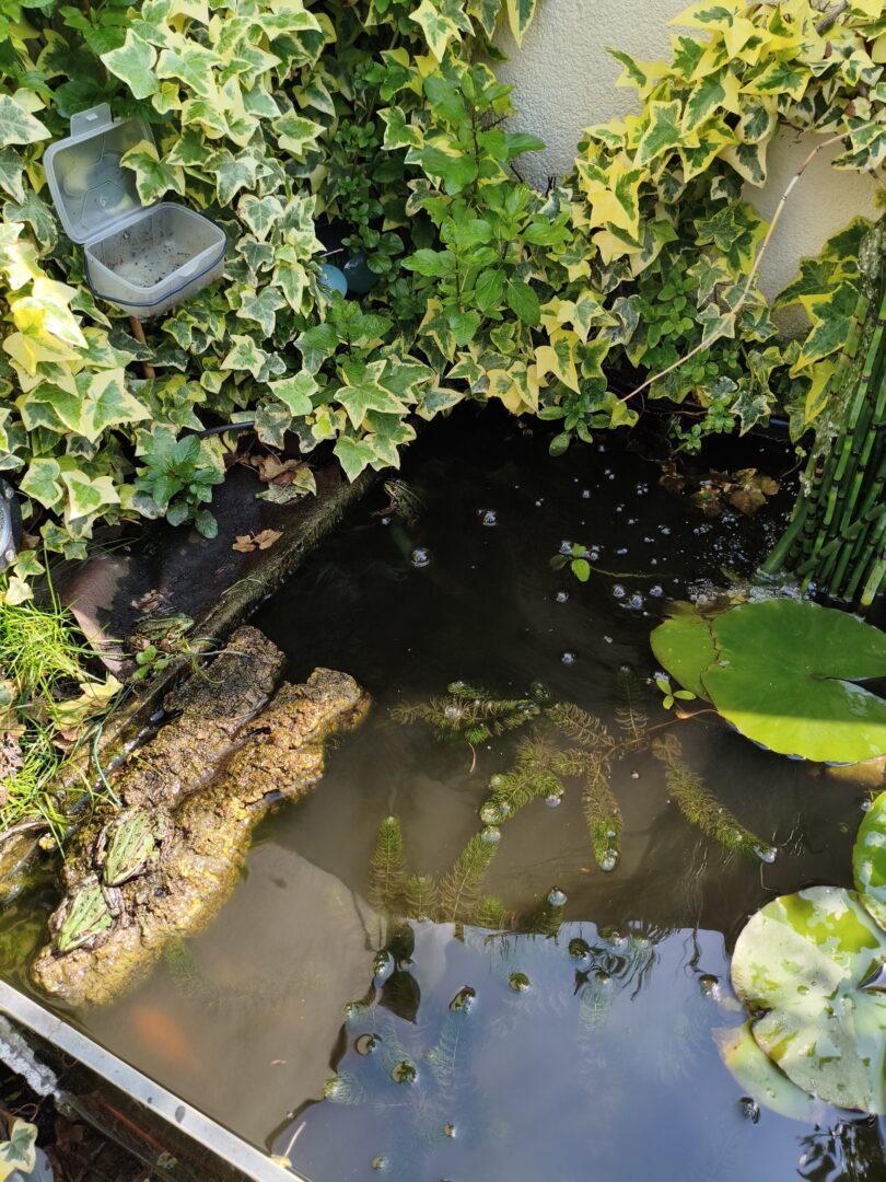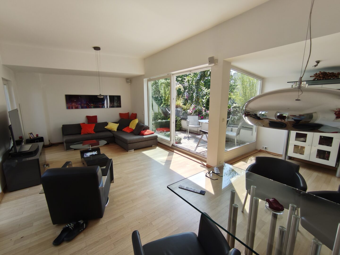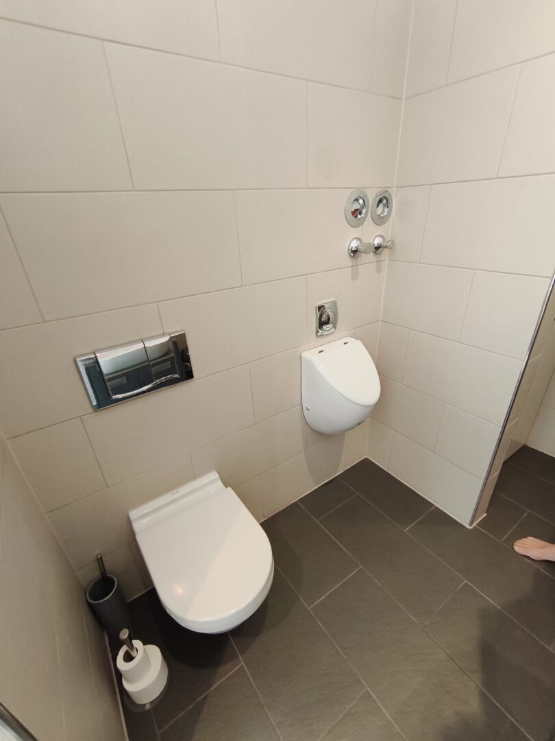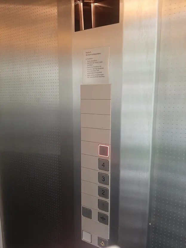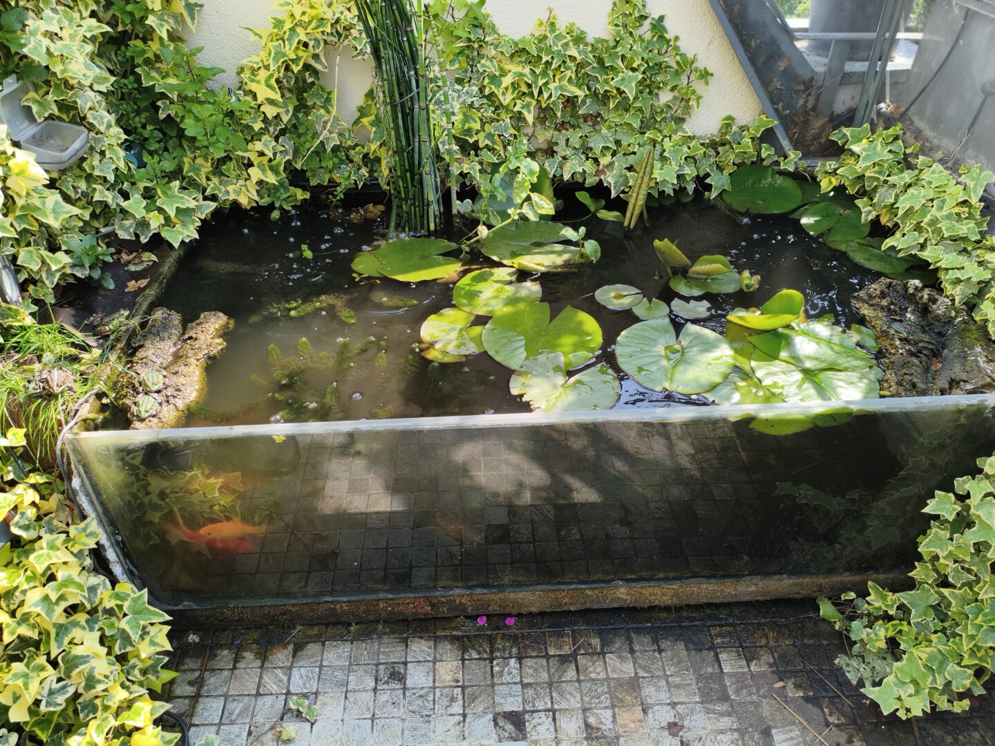 Die obere Etage der Wohnung besteht aus Wohnzimmer-Küche, Gäste-WC und zwei Balkonen. Auf dem größeren Balkon befindet sich ein Aquarium-Teich mit Goldfischen und quakenden Fröschen. Die Frösche lassen sich auch gerne auf dem Boden des Balkons mit Regenwürmern füttern und klettern dazu am Efeu aus ihrem Teich und wieder zurück. Dieser Balkon kann durch eine elektrische Markise beschattet werden. Die in die Markise integrierte Beleuchtung sorgt für gemütliche Abende. Auf den Balkonen und im wohnungsinternen Treppenhaus gibt es viele Pflanzen. Diese werden teilweise durch Bewässerungscomputer automatisch bewässert. Der Eigentümer ist ein Naturliebhaber und Pflanzenprofi. Auf dem kleineren Balkon steht eine von Pflanzen umgebene Bank, in der Ecke gegenüber wächst eine kleine Birke, links und rechts davon gibt es viele Pflanzen, und zwar in Profi-Blumenkästen, statt in kleinen Baumarkt-Blumenkästen. Die Wohnung ist in alle Richtungen umgeben von Bäumen, die in den angrenzenden Innenhöfen wachsen. Hinter den Bäumen sieht man Dächer der umgebenden Häuser. Straßenlärm ist hier oben nicht zu hören, auch Mücken gibt es nicht, so dass man bei passendem Wetter viele Fenster geöffnet lassen kann.