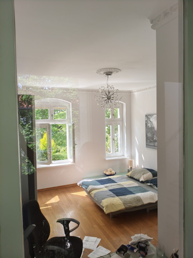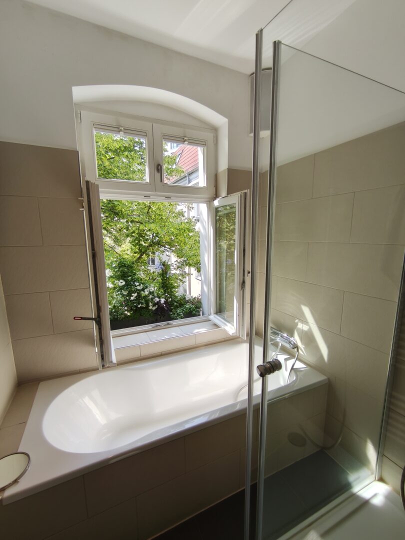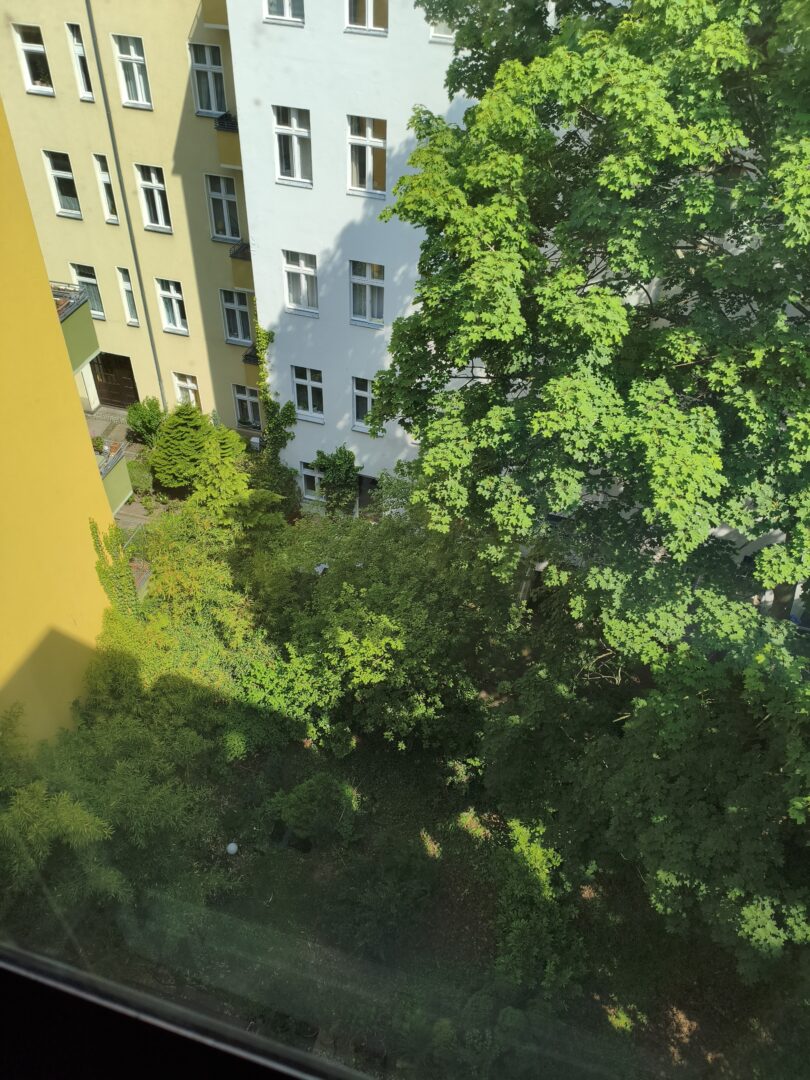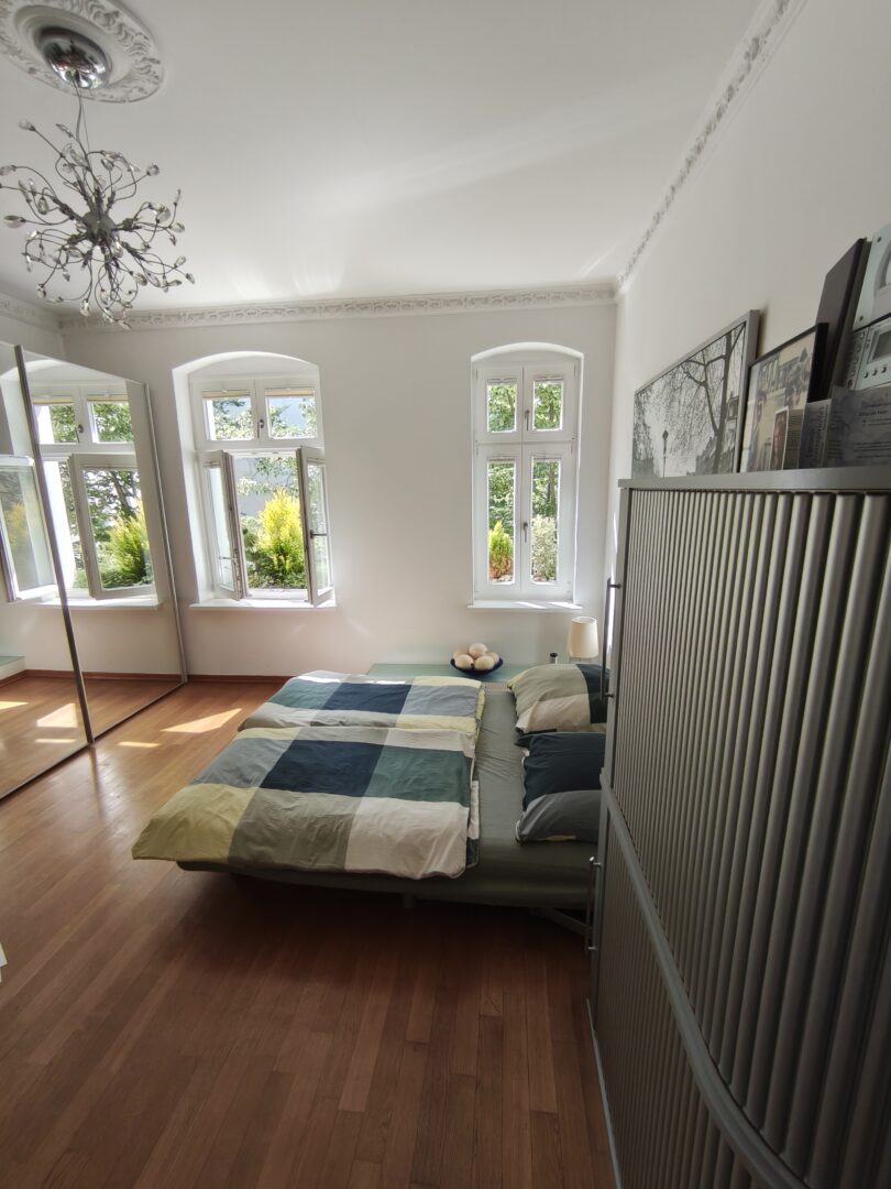 In der unteren Etage gibt es ein Schlafzimmer, ein mittleres Zimmer und ein Bad. Die Badewanne steht direkt am Fenster, durch dieses hat man einen schönen Blick auf die umgebenden Bäume. Das mittlere Zimmer hat als Besonderheit neben der Tür ein großes Glasfenster zum Flur. Derzeit ist im Zimmer hinter diesem inneren Fenster ein Arbeitsplatz eingerichtet. Von diesem aus blickt man durch das innere Fenster, den Flur und das sich anschließende äußere Fenster auf Bäume. Überhaupt sind beim Blick aus allen Fenstern Bäume zu sehen, was den Eindruck verstärkt, nicht in einer Wohnung im Zentrum Berlins zu wohnen, sondern in einem Haus im Grünen.