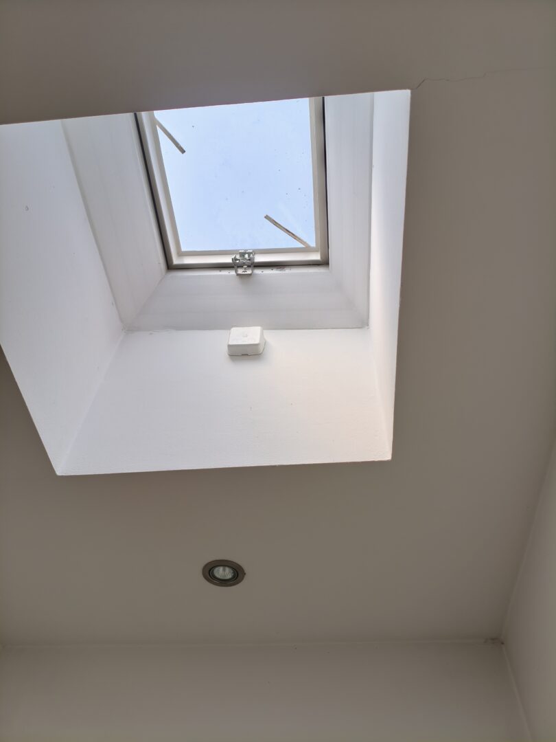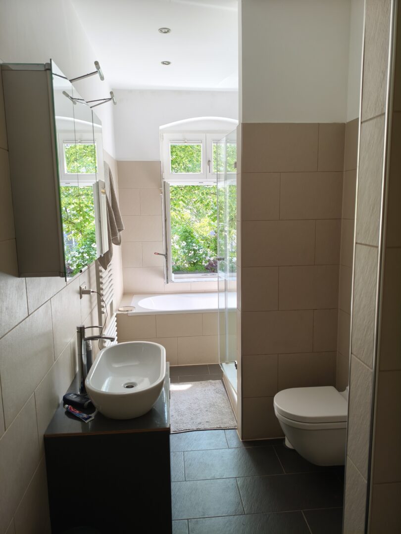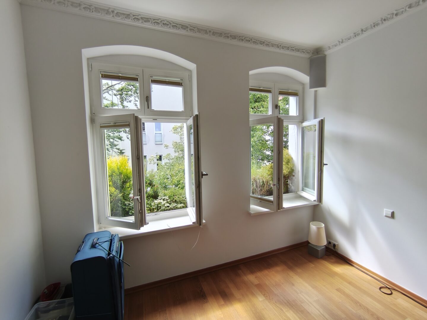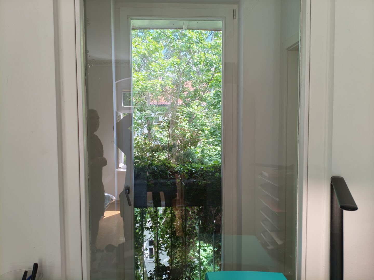 In der unteren Etage gibt es ein Schlafzimmer, ein mittleres Zimmer und ein Bad. Die Badewanne steht direkt am Fenster, durch dieses hat man einen schönen Blick auf die umgebenden Bäume. Das mittlere Zimmer hat als Besonderheit neben der Tür ein großes Glasfenster zum Flur. Derzeit ist im Zimmer hinter diesem inneren Fenster ein Arbeitsplatz eingerichtet. Von diesem aus blickt man durch das innere Fenster, den Flur und das sich anschließende äußere Fenster auf Bäume. Überhaupt sind beim Blick aus allen Fenstern Bäume zu sehen, was den Eindruck verstärkt, nicht in einer Wohnung im Zentrum Berlins zu wohnen, sondern in einem Haus im Grünen.