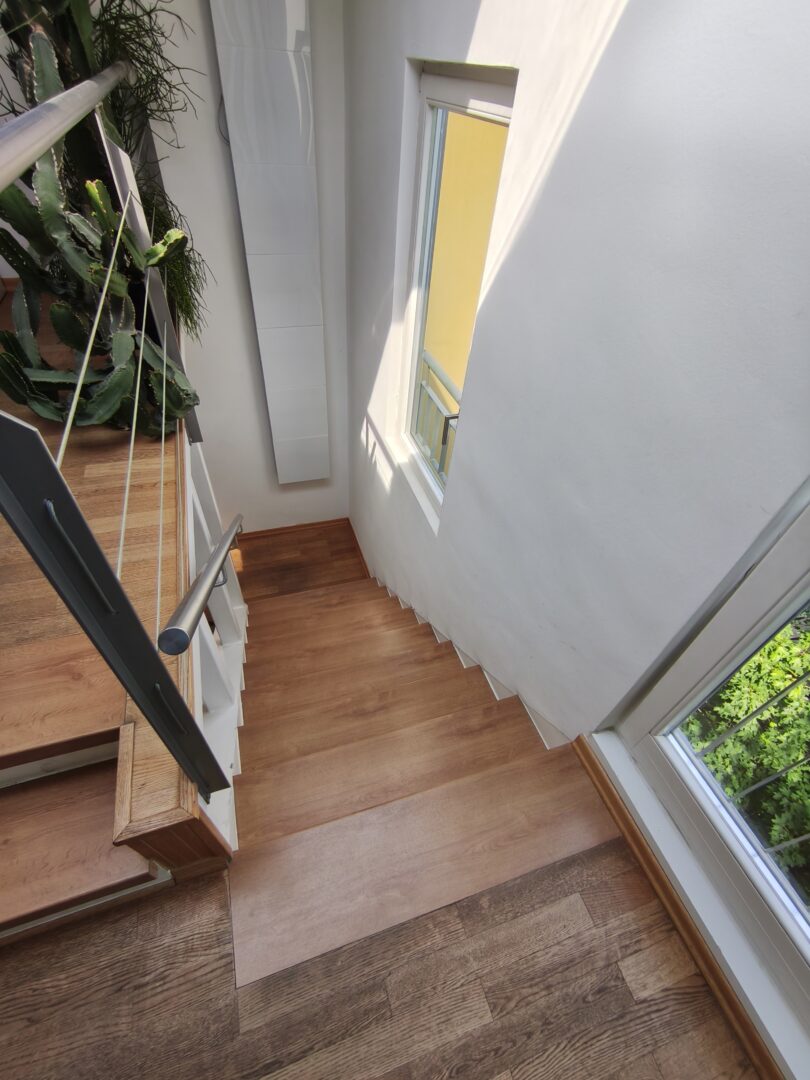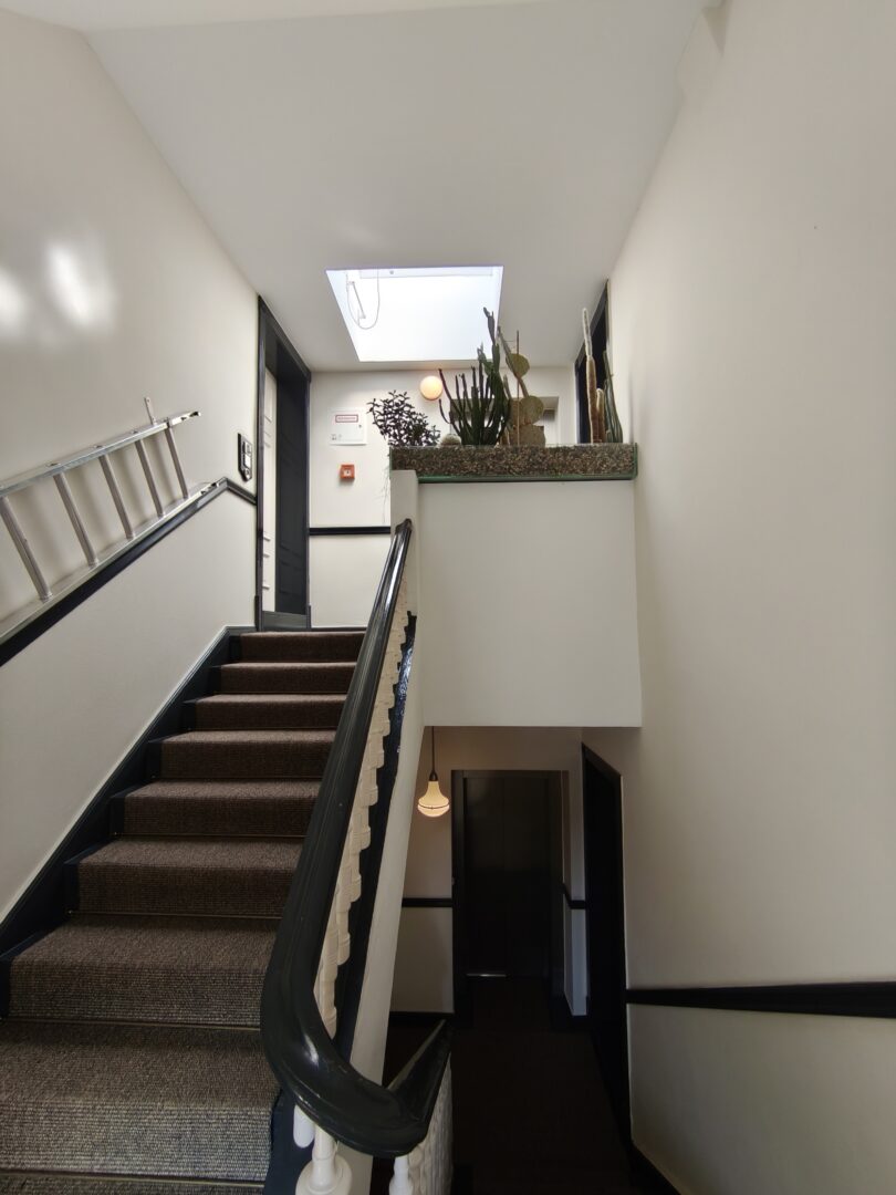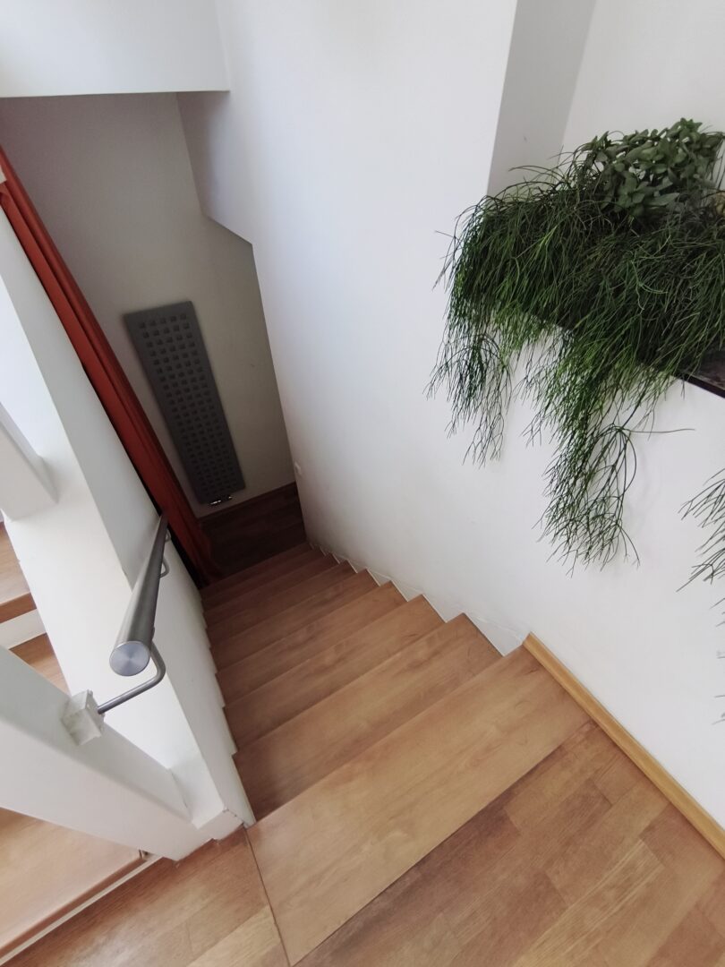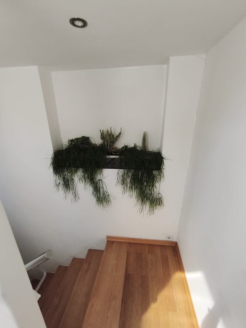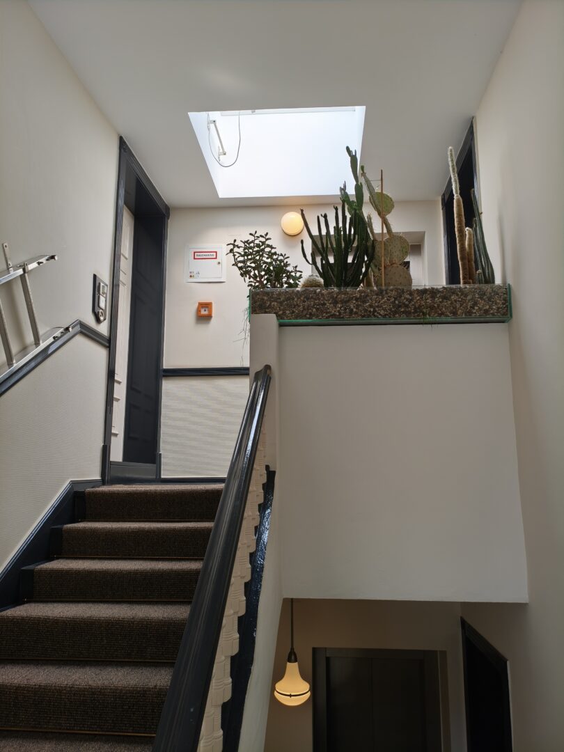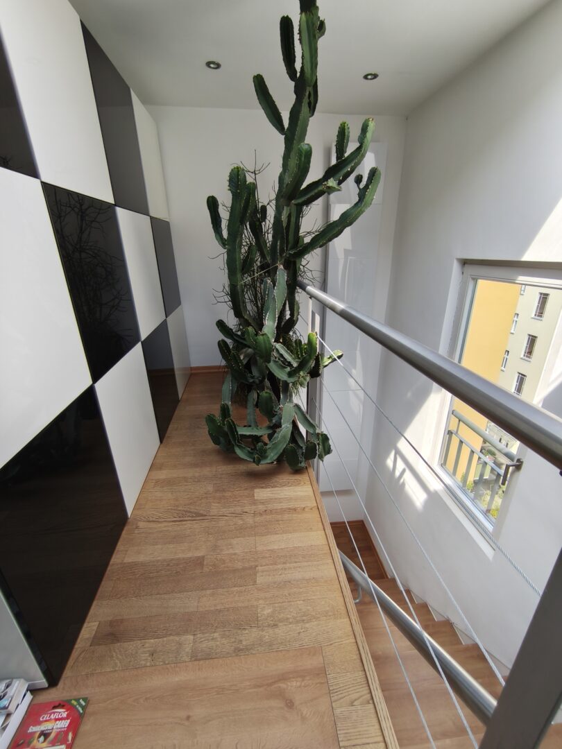 Im wohnungsinternen Treppenhaus mit seinem großen Oberlicht, das die beiden Etagen der Wohnung miteinander verbindet, wächst ein großer Kaktus, in Wand-Nischen gibt es weitere Pflanzen.
