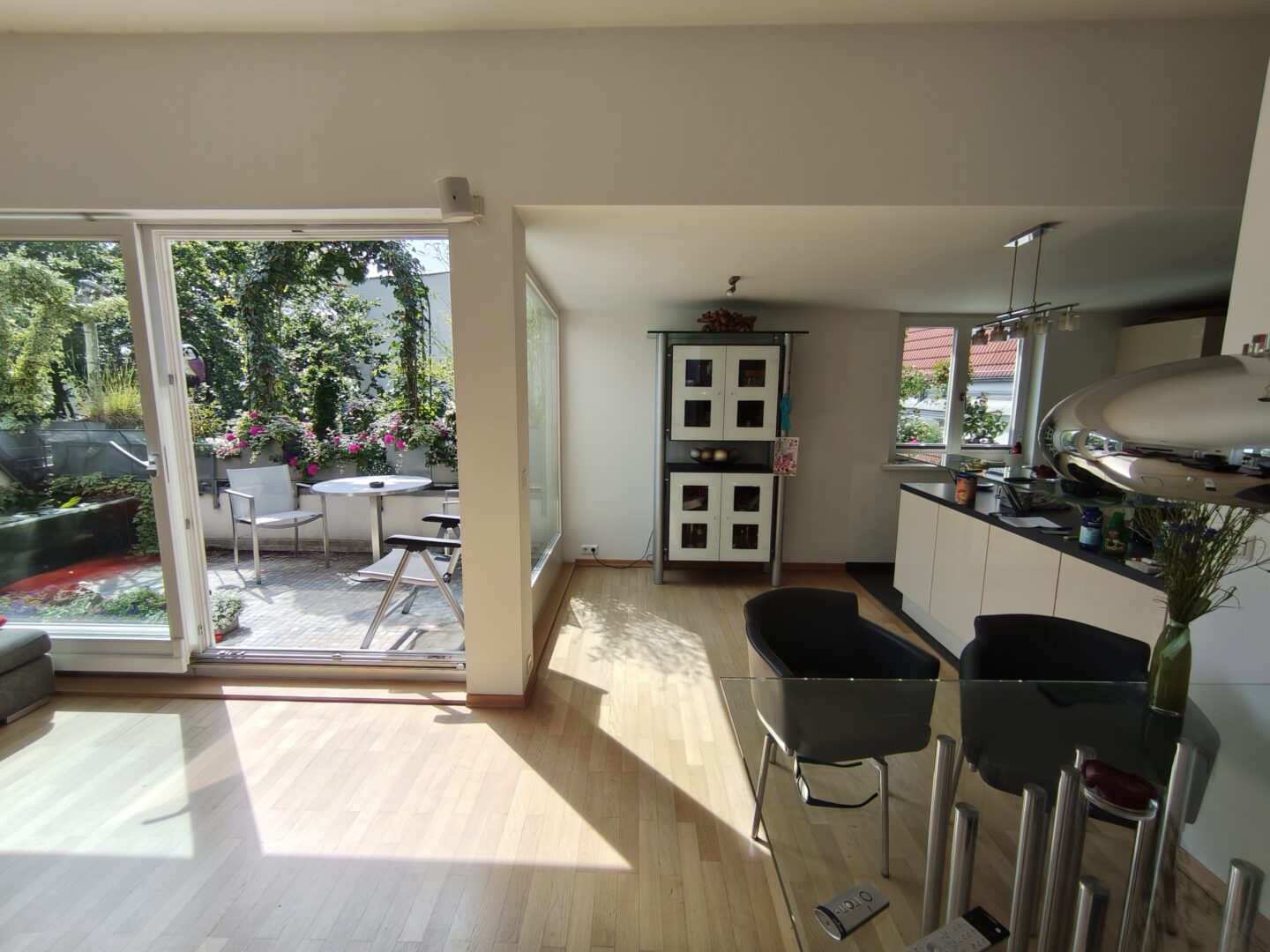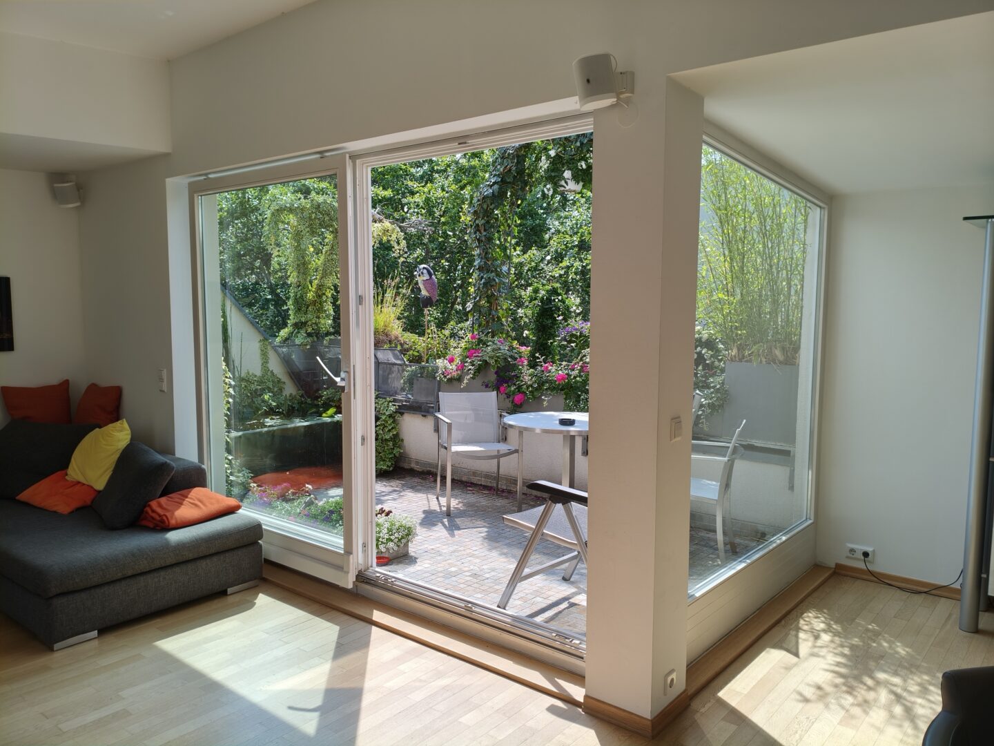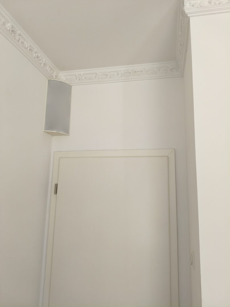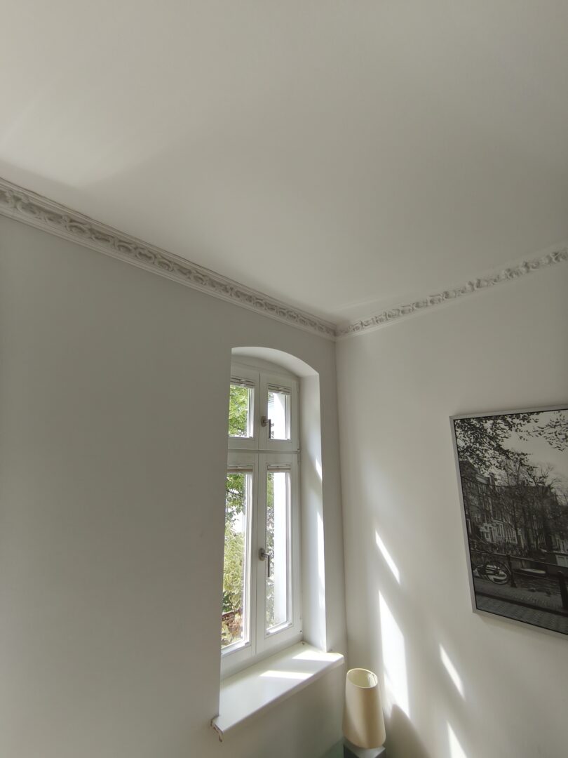 Vor dem Eingang zur Wohnung stehen Sukkulenten, die durch natürliches Oberlicht gut beleuchtet werden. Sie bilden den Beginn des kleinen "Botanischen Gartens". Die gesamte Wohnung vermittelt den Eindruck einen Hauses im Grünen, mit viel Licht und vielen Pflanzen. Die Wohnung wird durch verschiedene Oberlichter und viele Fenster sehr gut beleuchtet. Und es gibt viele interessante Details. Das fängt bei der Wohnungstür an, die von außen ganz historisch aussieht, tatsächlich eine Sicherheitstür ist. Die Innenseite dieser Tür ist ein großer Spiegel. Oberlicht im Flur, Oberlicht im Gäste-WC. Stück an der Decke in allen Zimmern. Es gib ein zentrales Soundsystem in allen Räumen.