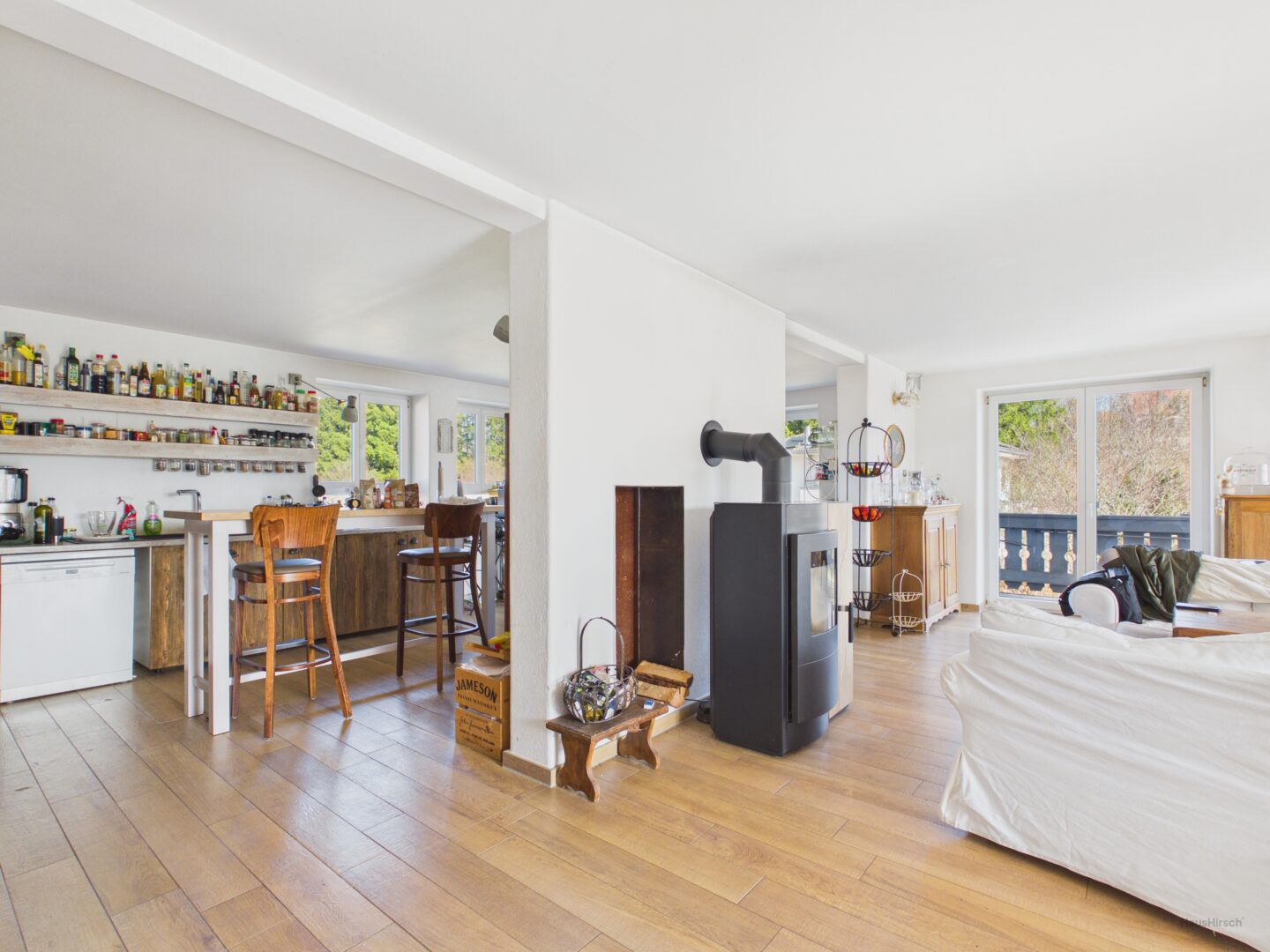 Wohnbereich (ca. 42 m²): Süd-Ost-Ausrichtung mit Kaminofen für behagliche Stunden.