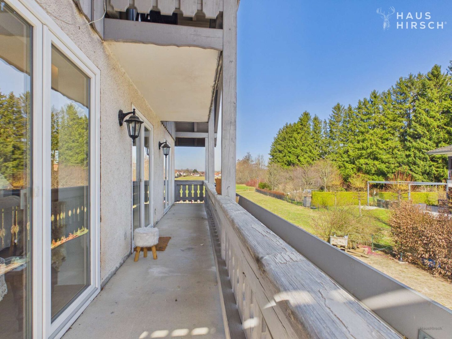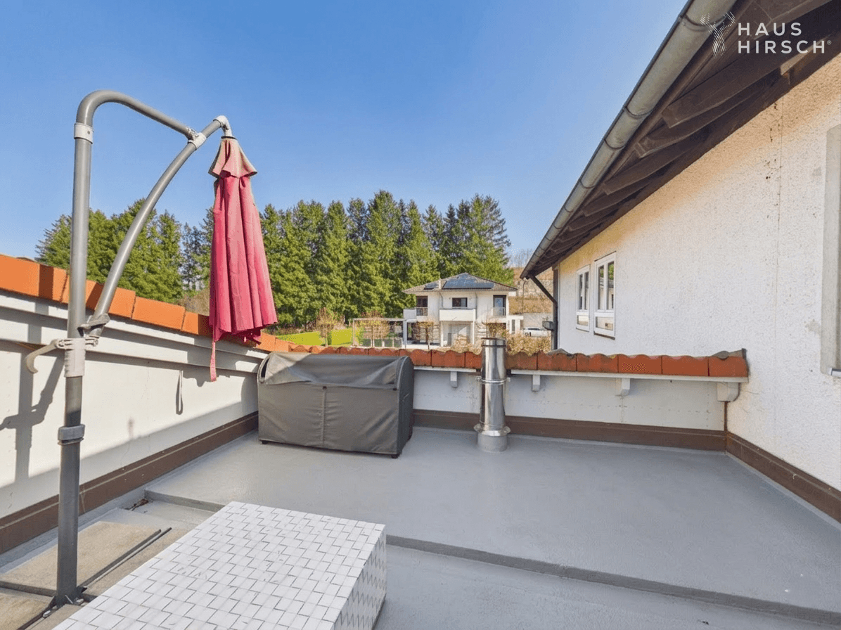 Die Krönung: Ein teilweise umlaufender Balkon in Süd- und Ostausrichtung (Nutzfläche 29,87 m²) lädt von morgens bis zum Abend zum Verweilen ein – mit Blick in den privaten Garten und die Windacher Naturlandschaft.
