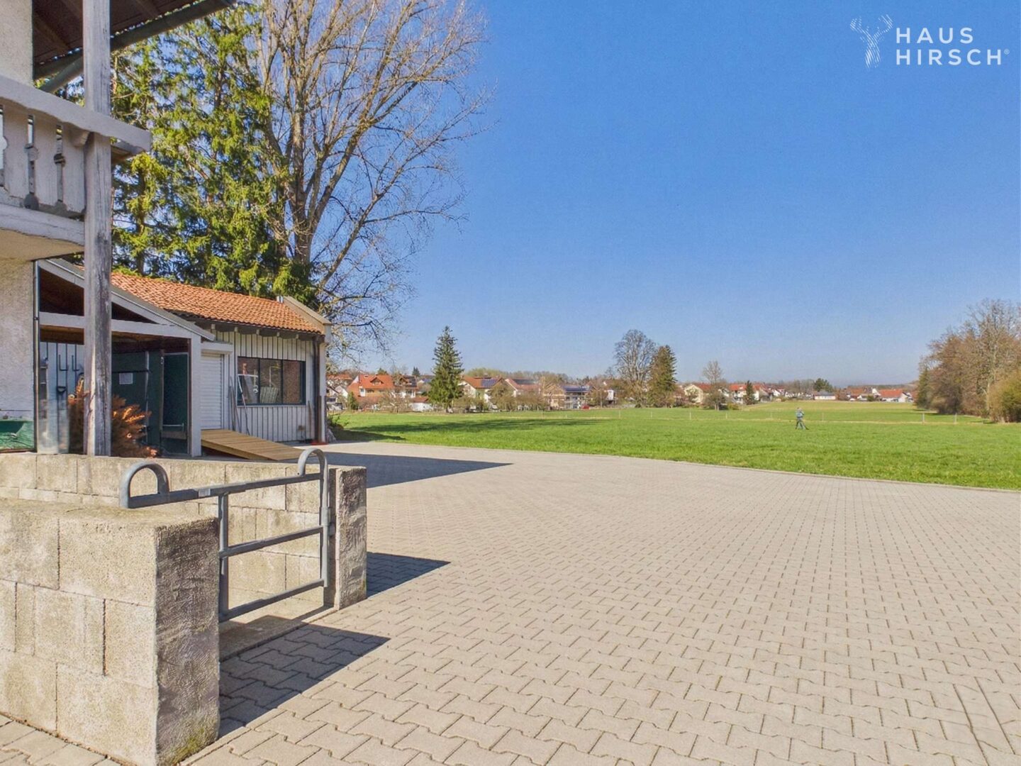 Das Erdgeschoss ist die strategische Schaltzentrale dieses Hauses – hier trennen sich Wohnen und Gewerbe, ohne sich gegenseitig zu stören. Die Zufahrt erfolgt von der Hechenwanger Straße aus; im Norden des Grundstücks erschließt ein großzügiger gepflasterter Hofbereich mit sechs Außenstellplätzen und einem Carport das Ensemble. Ein zentraler Flur (ca. 12 m²) bildet das Herzstück des Erdgeschosses und verteilt auf alle Bereiche – nach oben in die Wohngeschosse, seitlich in die Gewerbeflächen und direkt auf den Südgarten.