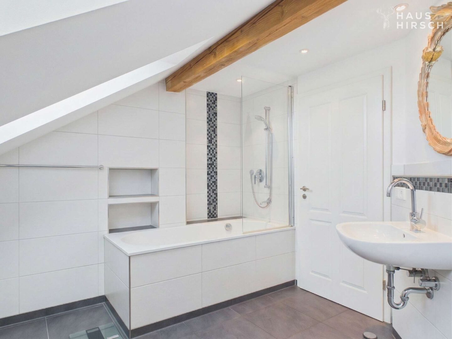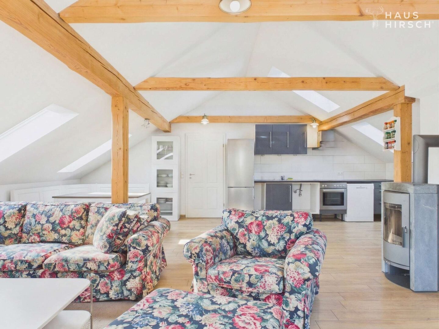 Das 2013 vollständig ausgebaute Dachgeschoss überrascht mit echtem Loft-Charakter: Freiliegende Holzbalken, großflächige Dachflächenfenster und der offene Grundriss machen diese Etage zu etwas Besonderem.