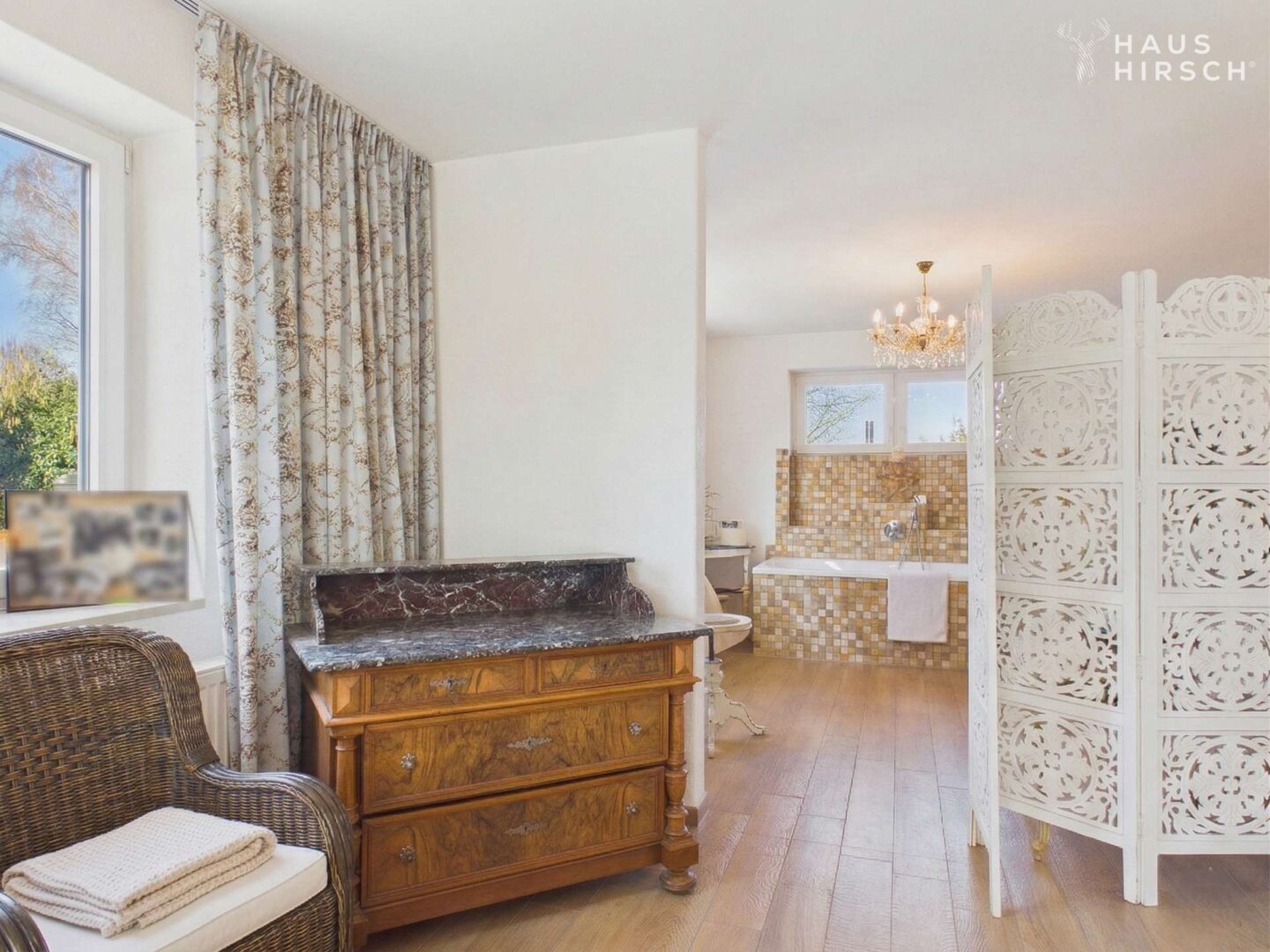 Nach Westen hin liegen zwei Schlafzimmer (ca. 25 m² und 15 m²), ein separater Verbindungsraum (ca. 12,8 m²) sowie das modernisierte Hauptbadezimmer (ca. 10,6 m²) mit Fußbodenheizung, Badewanne und direktem Zugang zur Dachterrasse. Ein weiterer Raum (ca. 17,4 m²) bietet Flexibilität als Kinderzimmer, Arbeitszimmer oder zweites Schlafzimmer.