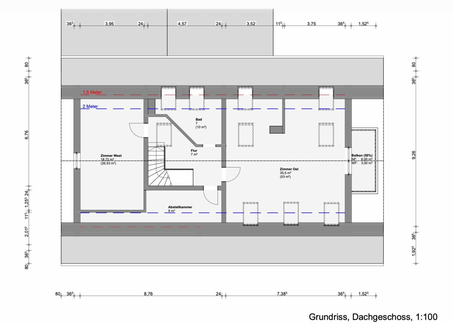 Im Osten liegt das große Studio-Zimmer (ca. 35,5 m² Wohnfläche, bei vollem Raumquerschnitt 53 m²) – ein außergewöhnlich lichtdurchfluteter, vielseitig nutzbarer Raum, der als Wohn-Schlaf-Studio, als Heimkino, als Kreativraum oder als Jugendzimmer dient. Ein überdachter Ostbalkon (NF 6 m²) gehört dazu. Im Westen das zweite Zimmer (ca. 18,72 m² Wohnfläche, bei vollem Querschnitt 26,53 m²), ebenfalls mit Dachfenstern belichtet. Ein Tageslichtbad (ca. 10 m²) mit Badewanne und Dusche, eine Abstellkammer (9 m²), ein Flur (7 m²) sowie ein weiterer Kaminofen runden das Dachgeschoss zu einer voll funktionsfähigen Einheit ab.