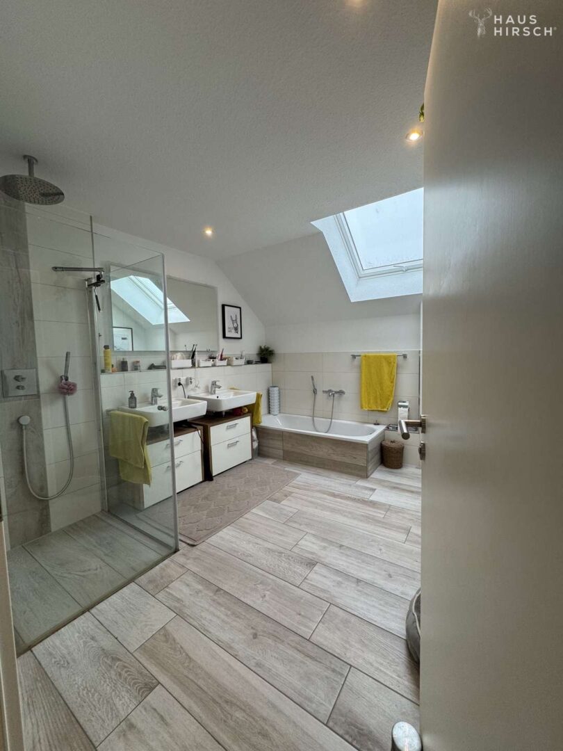 Das Obergeschoss beherbergt drei geräumige Schlafzimmer, die mit viel Licht und gemütlicher Wohnatmosphäre punkten. Das elegante Badezimmer verfügt über eine Badewanne, eine Dusche und einen Doppelwaschtisch – ideal für den morgendlichen Start in den Tag.