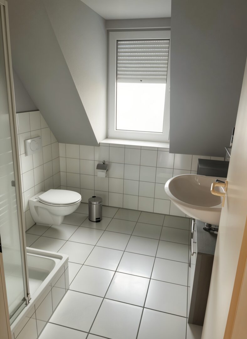 Das Wohnzimmer, Schlafzimmer und der Flur sind mit Laminat ausgelegt. Das Badezimmer mit Dusche und Fenster ist mit Fliesen ausgestattet ist.