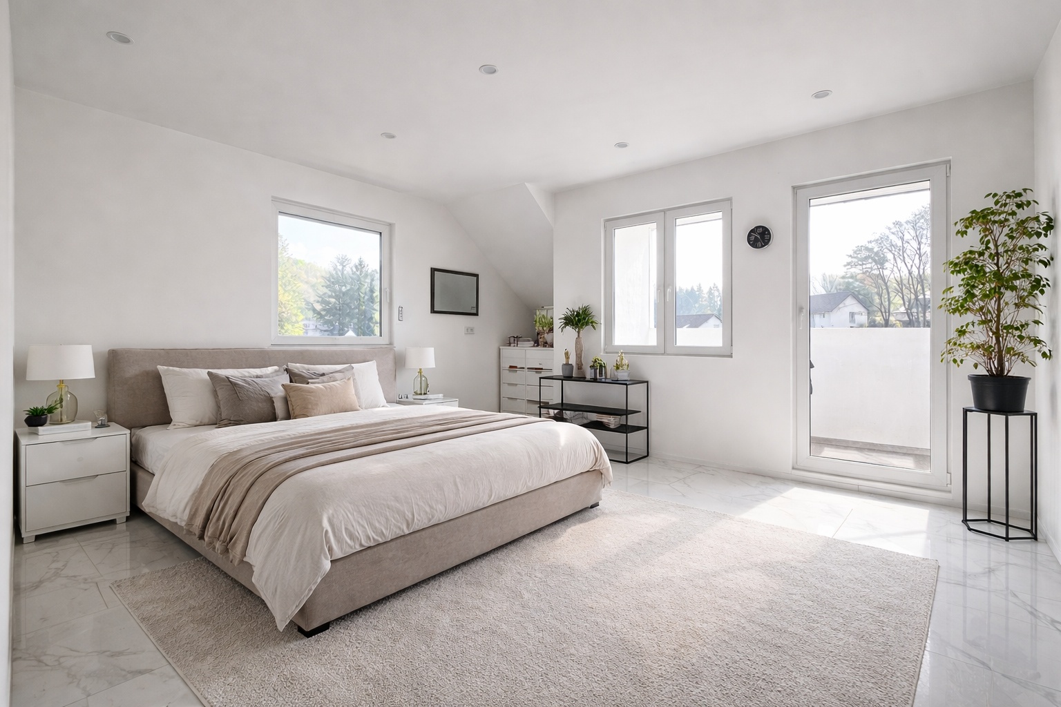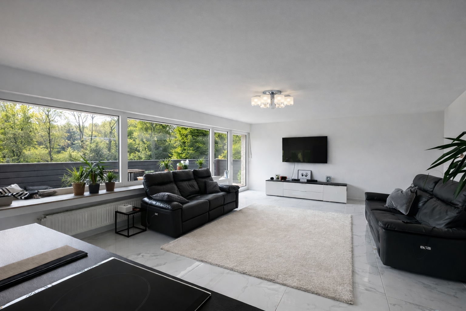 Der zentrale Wohnbereich überzeugt durch seine Offenheit und bietet direkten Zugang zu Balkon und Terrasse. Dadurch entsteht eine harmonische Verbindung zwischen Innen- und Außenbereich. Der weitläufige Garten auf dem ca. 1.500 m² großen Grundstück bietet viel Platz für Erholung, Gestaltung und Privatsphäre.