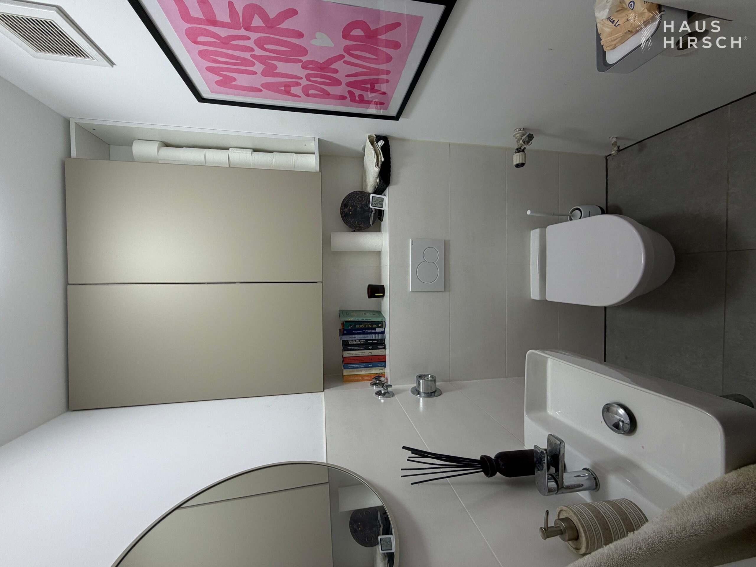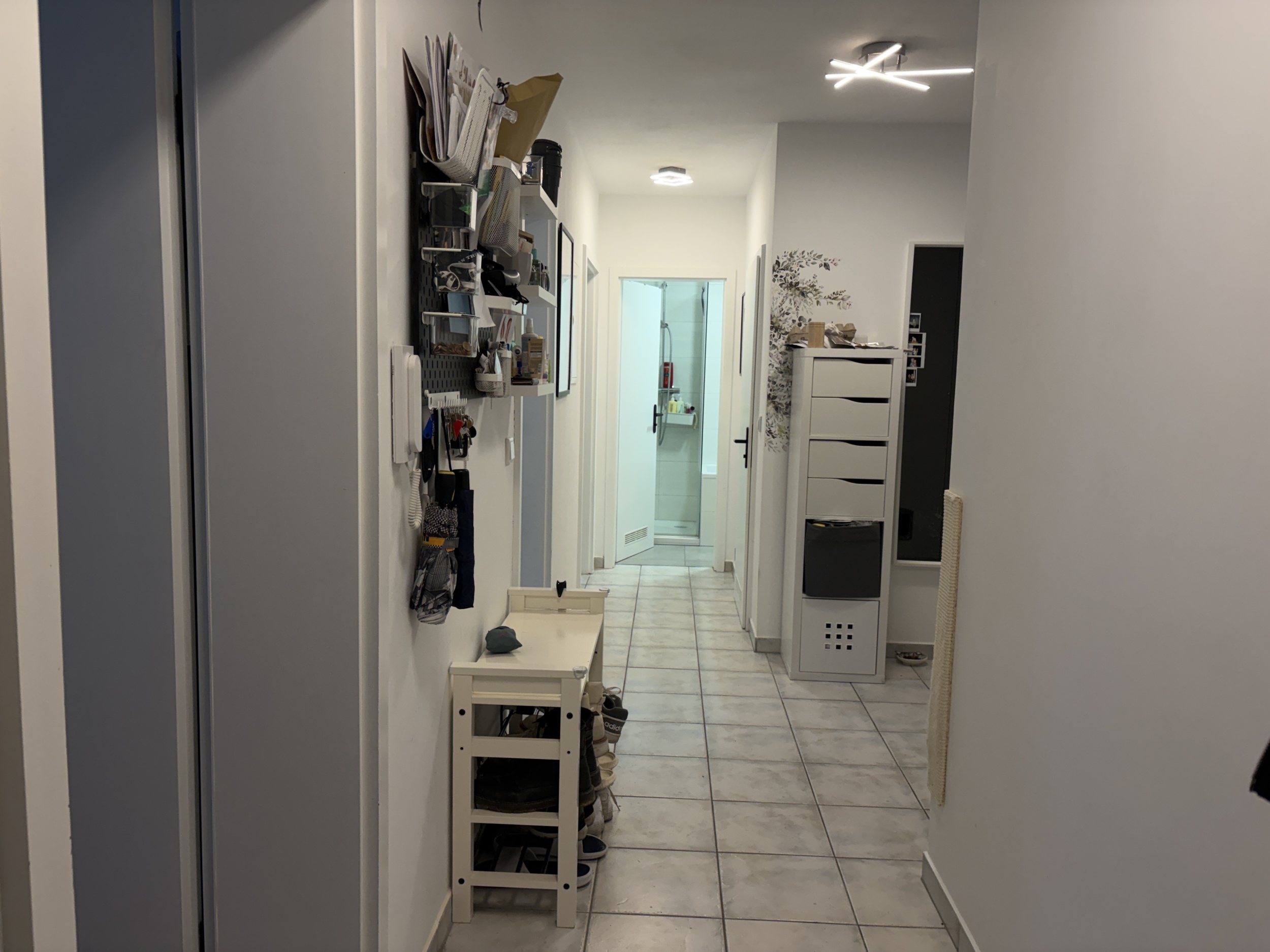 Das Bad (ca. 4,96 m²) sowie das separate WC (ca. 1,86 m²) sind klar voneinander getrennt und unterstreichen den praktikablen Zuschnitt der Wohnung. Ergänzt wird das Raumangebot durch einen Abstellraum, einen kleinen Garderobenbereich sowie ein eigenes Kellerabteil mit viel Stauraum.