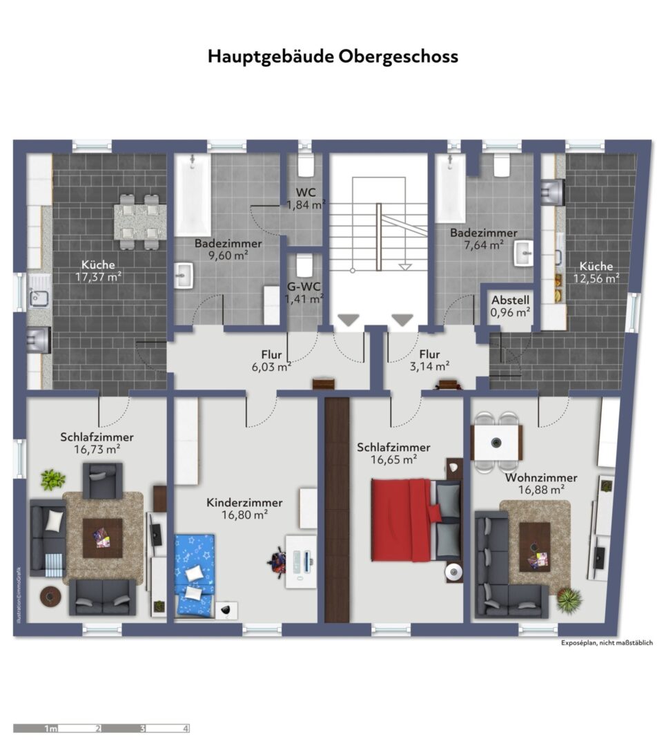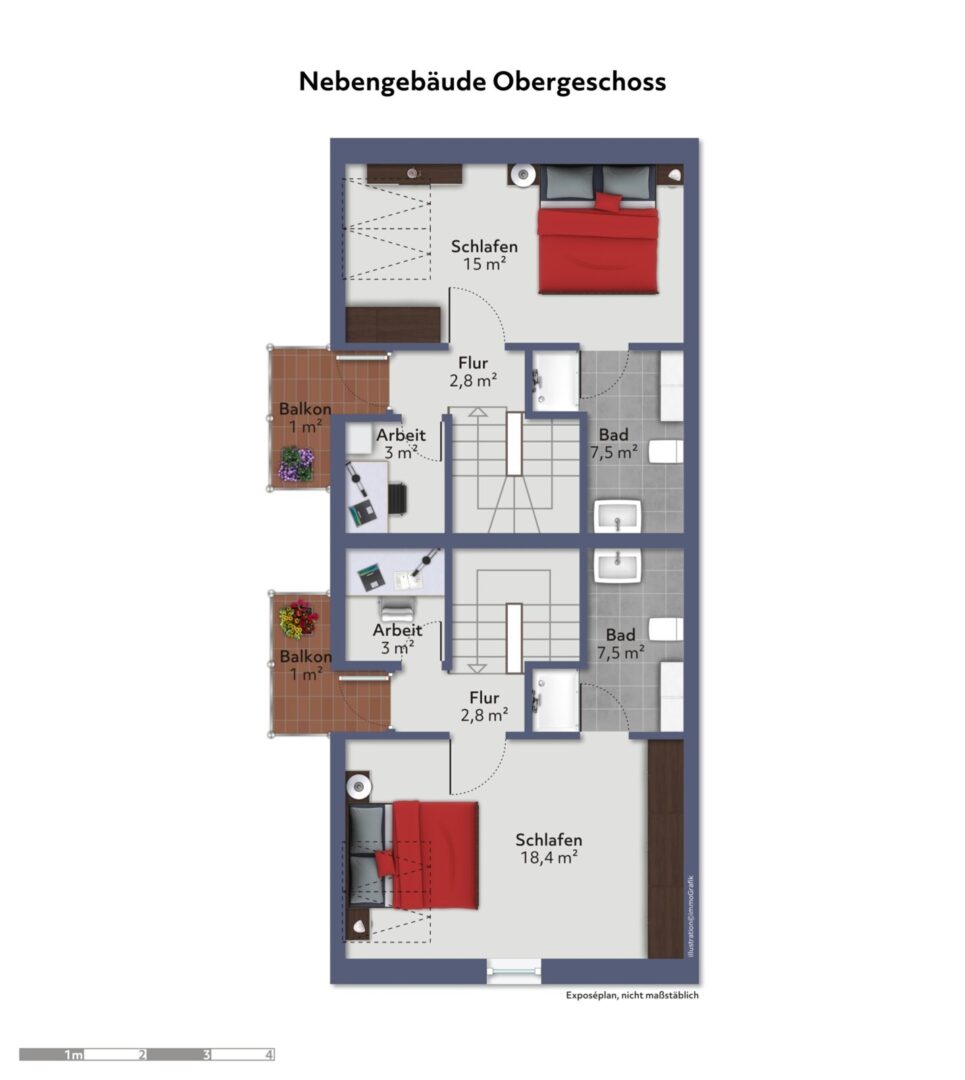 - Zwei Wohnungen im Obergeschoss mit jeweils 57,8m2 und 69,8 m2