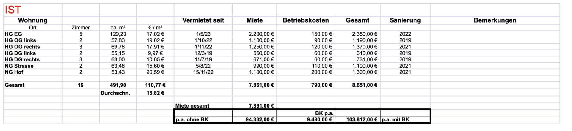 Das Objekt erzielt momentan eine Bruttorendite von 4,75%. Erwartet wird ein jährlicher Mietzins von ca. 96.132 € Miete pro Jahr, nach Abzug der Betriebskosten. Die Nettorendite beträgt momentan 4,44%.