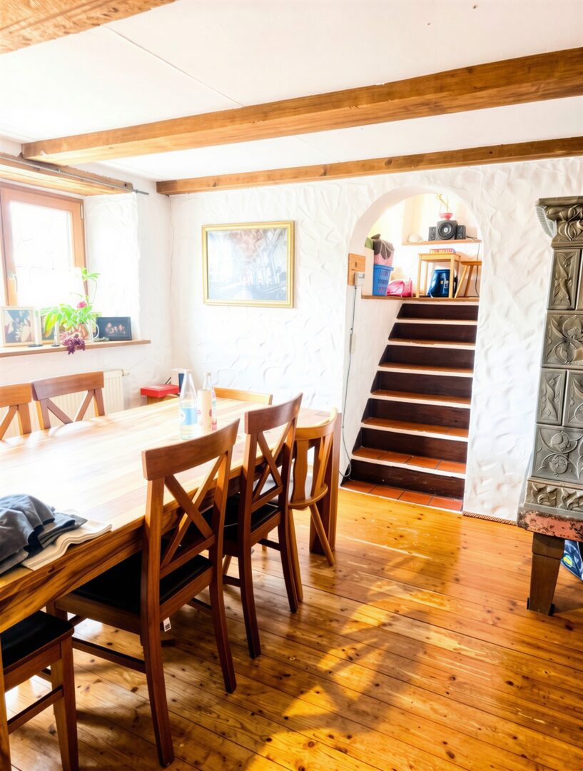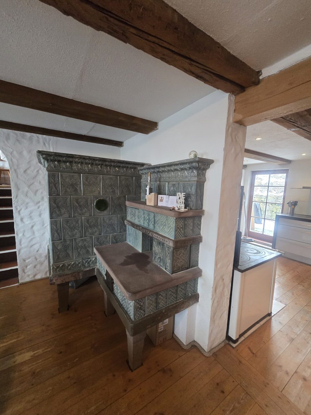 Dieses liebevoll sanierte ehemalige Bauernhaus verbindet historischen Charme mit modernem Wohnkomfort. Der einladende Eingangsbereich führt in ein großzügiges Esszimmer mit Kachelofen und moderner Küche samt zusätzlichem Holzherd. Das helle Wohnzimmer mit Panoramafenster bietet einen schönen Blick in den Garten und öffnet sich nach oben zum Galerieschlafzimmer.