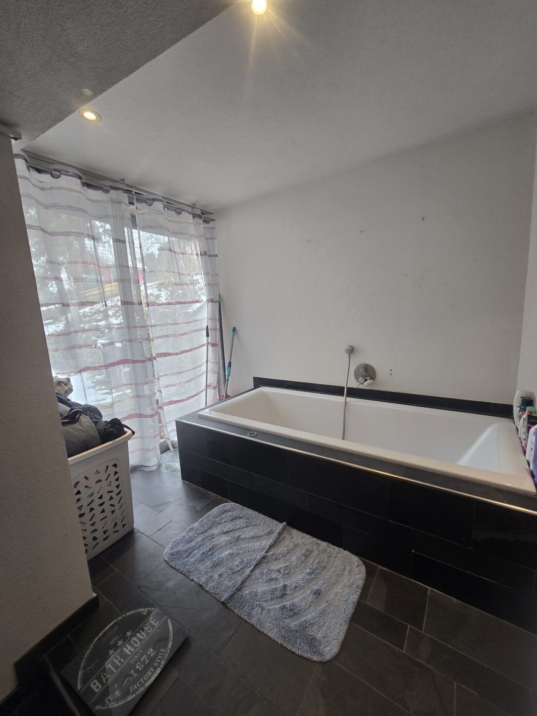 Ein hochwertiges Badezimmer mit großer Wanne und begehbarer Dusche in edlem Schieferdesign sorgt für Wellness‑Atmosphäre. Im Zwischengeschoss befinden sich ein Durchgangszimmer – ideal als Homeoffice oder Spielzimmer – sowie ein weiteres gemütliches Zimmer. Eine große Westterrasse bietet Potenzial für einen Wintergarten.