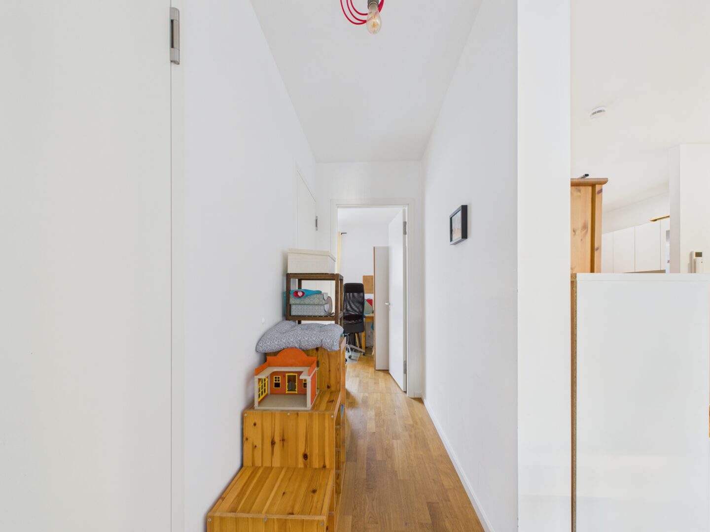 Der zentrale Flur führt zu den Schlafbereichen. Hier finden Sie ein Elternzimmer, ein Kinderzimmer und ein großes Badezimmer mit Wanne und Dusche. Ein Hauswirtschaftsraum mit Waschmaschinenanschluss rundet das Raumangebot ab.