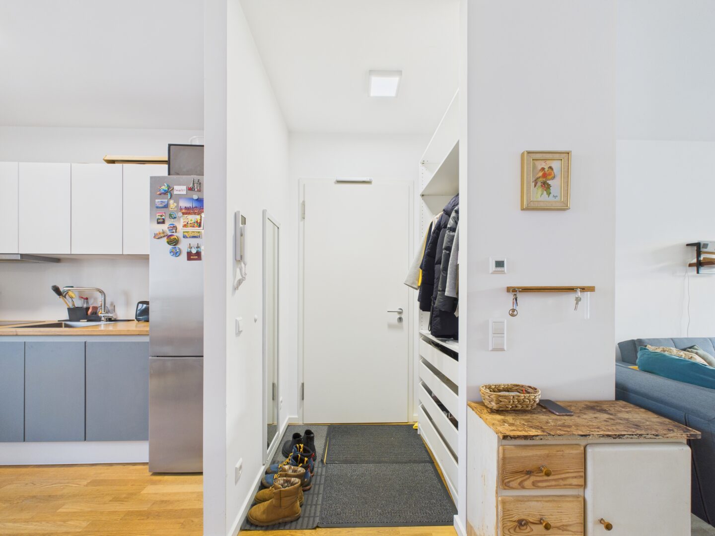 Die Wohnung befindet sich in der 2. Etage und ist bequem mit dem Aufzug zu erreichen. Eine stylische Außentreppe verleiht dem Eingangsbereich einen Hauch von New York Loft style. Der kleine, aber funktionale Eingangsbereich bietet Platz für Ihre Garderobe.