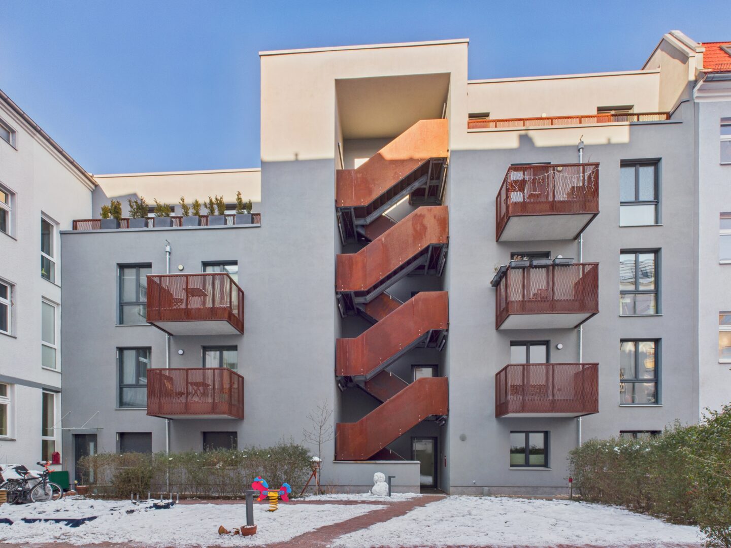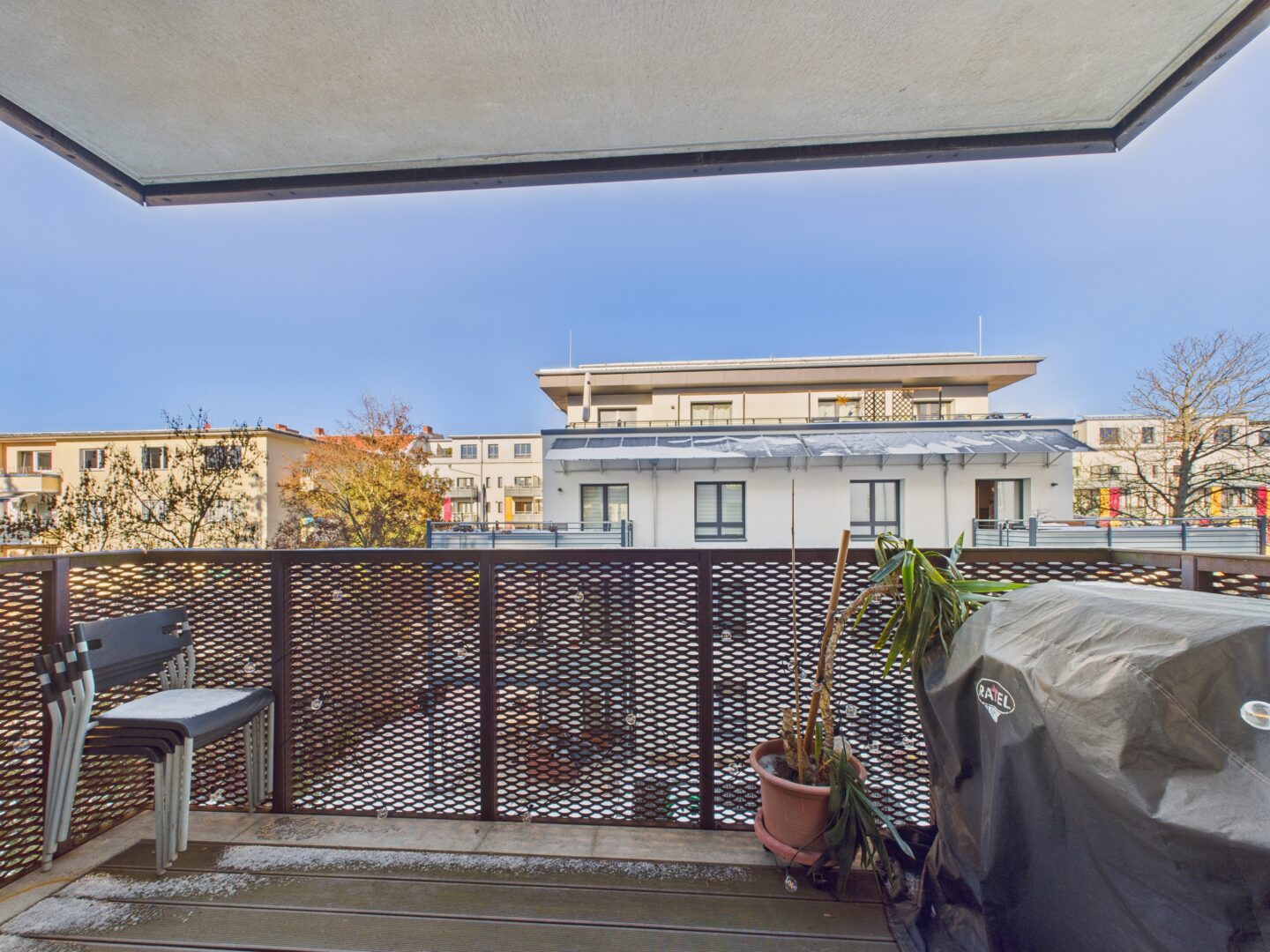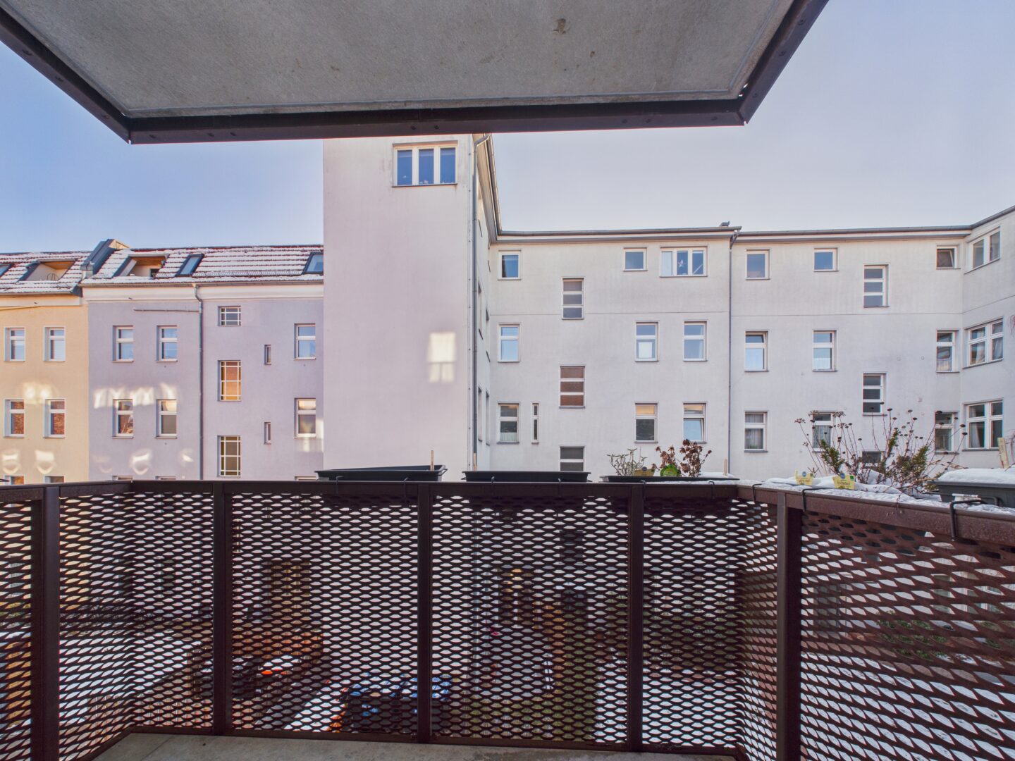 Willkommen in Ihrem neuen Zuhause im sicheren und ruhigen Neubau. Der Innenhof ist abgeschieden und bietet mehrere Türen für zusätzliche Sicherheit. Hier können Sie die Ruhe genießen und sich entspannt auf einem der zwei Balkone niederlassen.