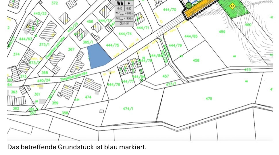 Das Grundstück befindet sich in einem allgemeinen Wohngebiet (WA) mit offener Bauweise und bietet vielseitige Bebauungsmöglichkeiten. Zulässig ist eine Grundflächenzahl von 0,40 und eine Geschossflächenzahl von 0,80, wodurch eine großzügige Wohnbebauung möglich wird. Die maximale Wandhöhe beträgt 6,0 m, die Firsthöhe 9,5 m. Dank einer flexiblen Dachneigung von 0° bis 50° sind sowohl Flachdächer als auch klassische geneigte Dächer realisierbar. Ideal für Einfamilien- oder Doppelhäuser.