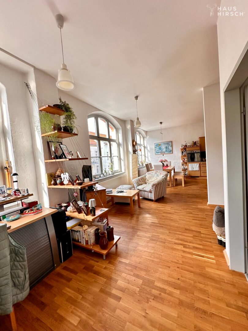 Die Wohnung erstreckt sich über ca. 107 m² Wohnfläche und beeindruckt durch ihre offene Raumstruktur, großzügige Deckenhöhen und stilvolle Details wie Parkettböden. Der lichtdurchflutete Wohnbereich und die offene Küche lädt zum Wohlfühlen und kreativen Wohnen ein.