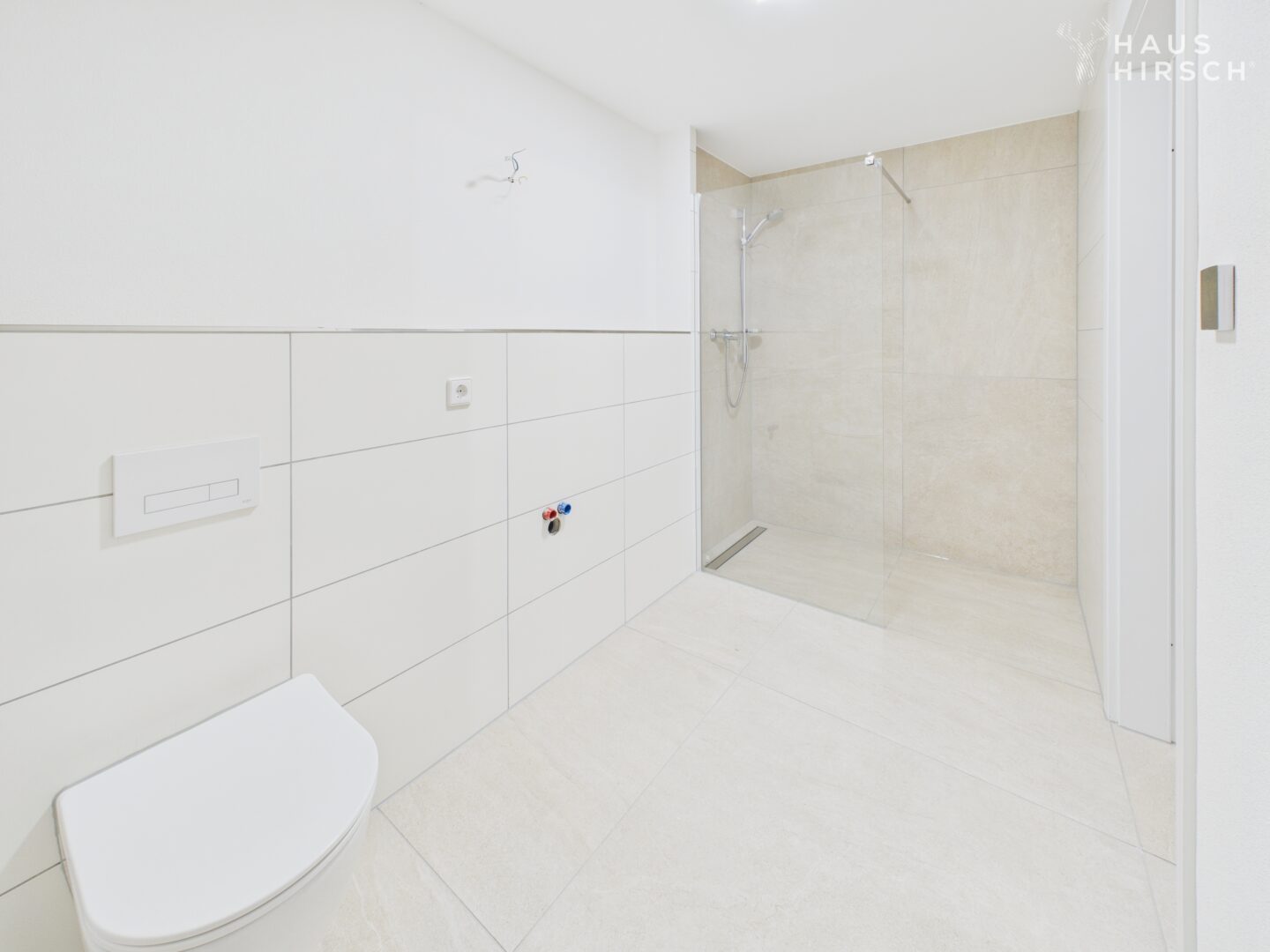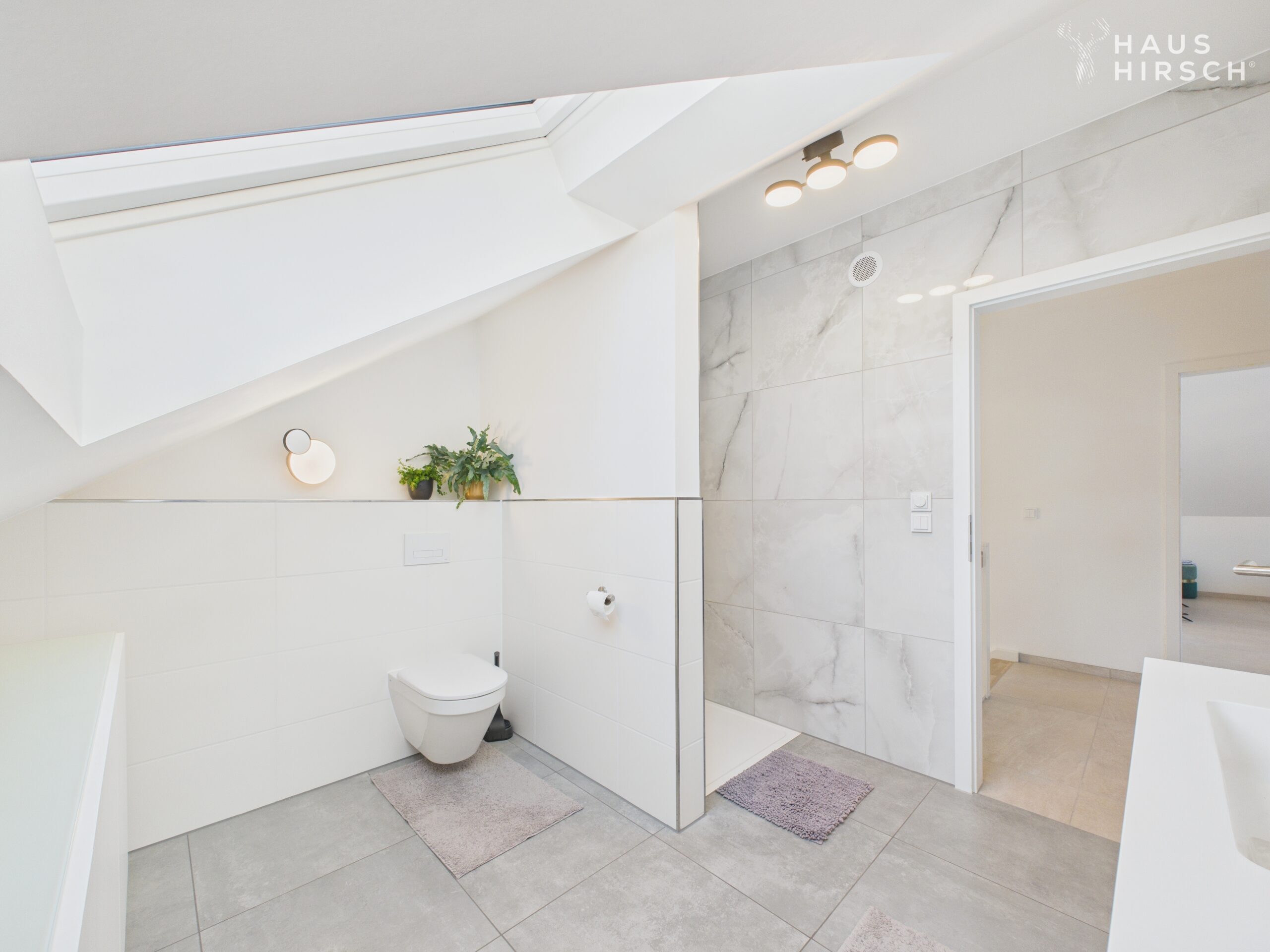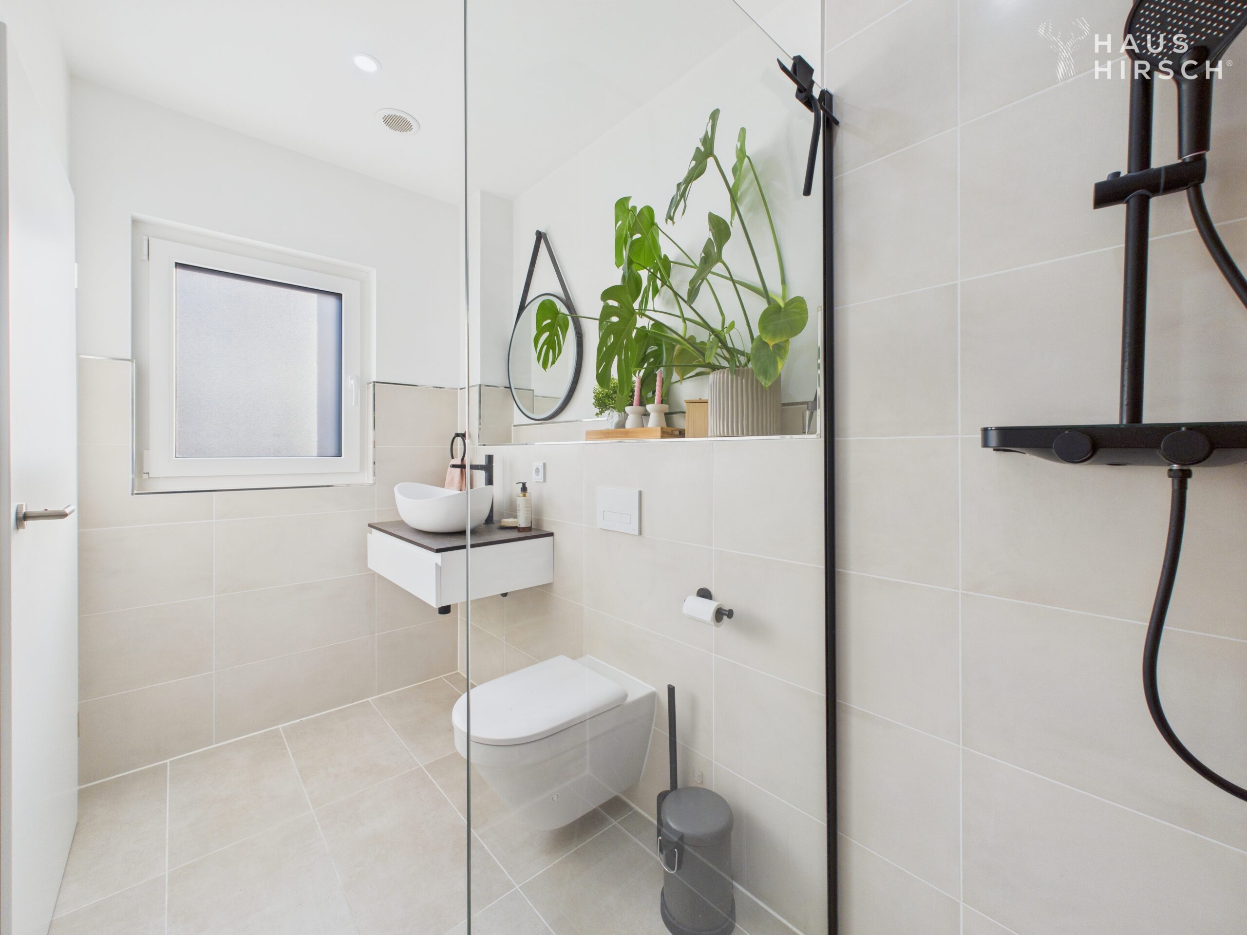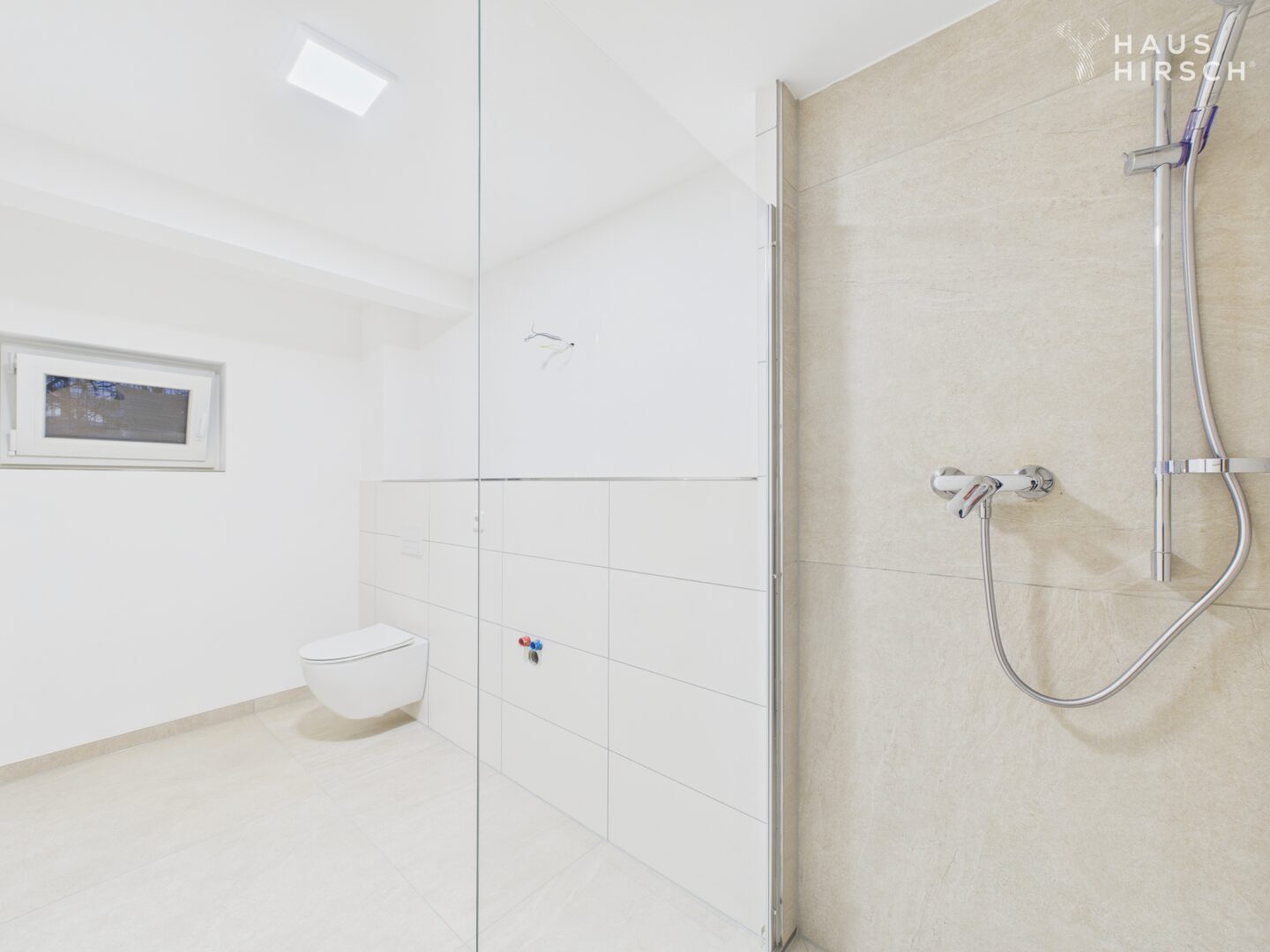 Das Tageslichtbad überzeugt mit hellen Hochglanz-Fliesen im Großformat und einer begehbaren Dusche, die jeden Morgen klar und frisch beginnen lässt.