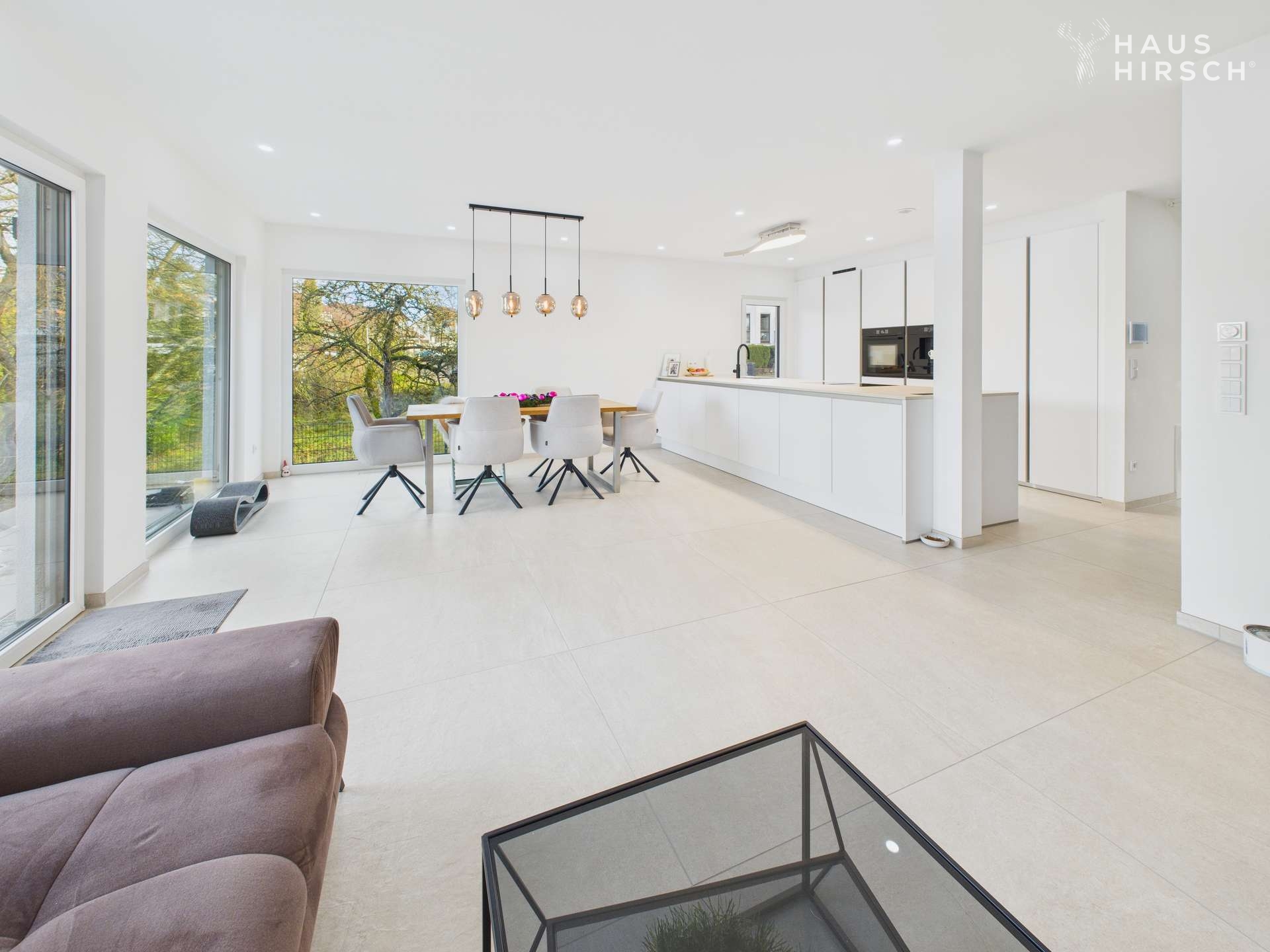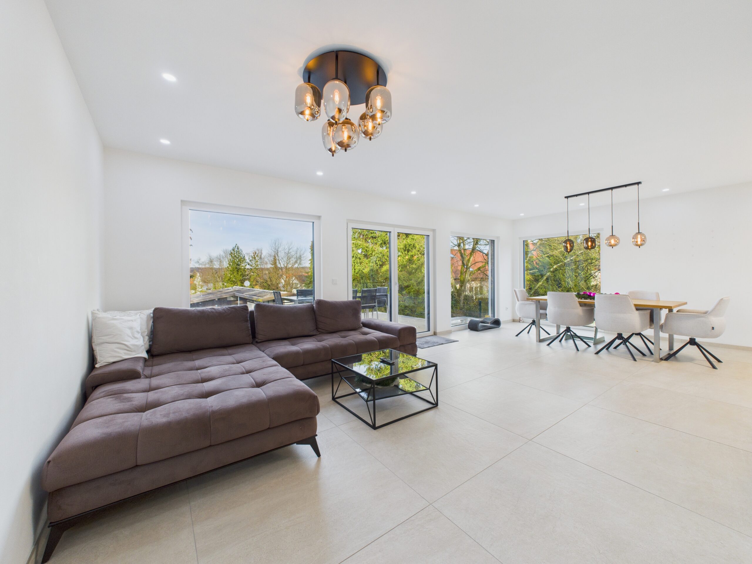 Im Erdgeschoss verschmelzen Innen- und Außenbereich auf natürliche Weise. Rundum bodentiefe Fensterflächen lassen viel Licht ins Haus und setzen das moderne Wohnkonzept perfekt in Szene.
