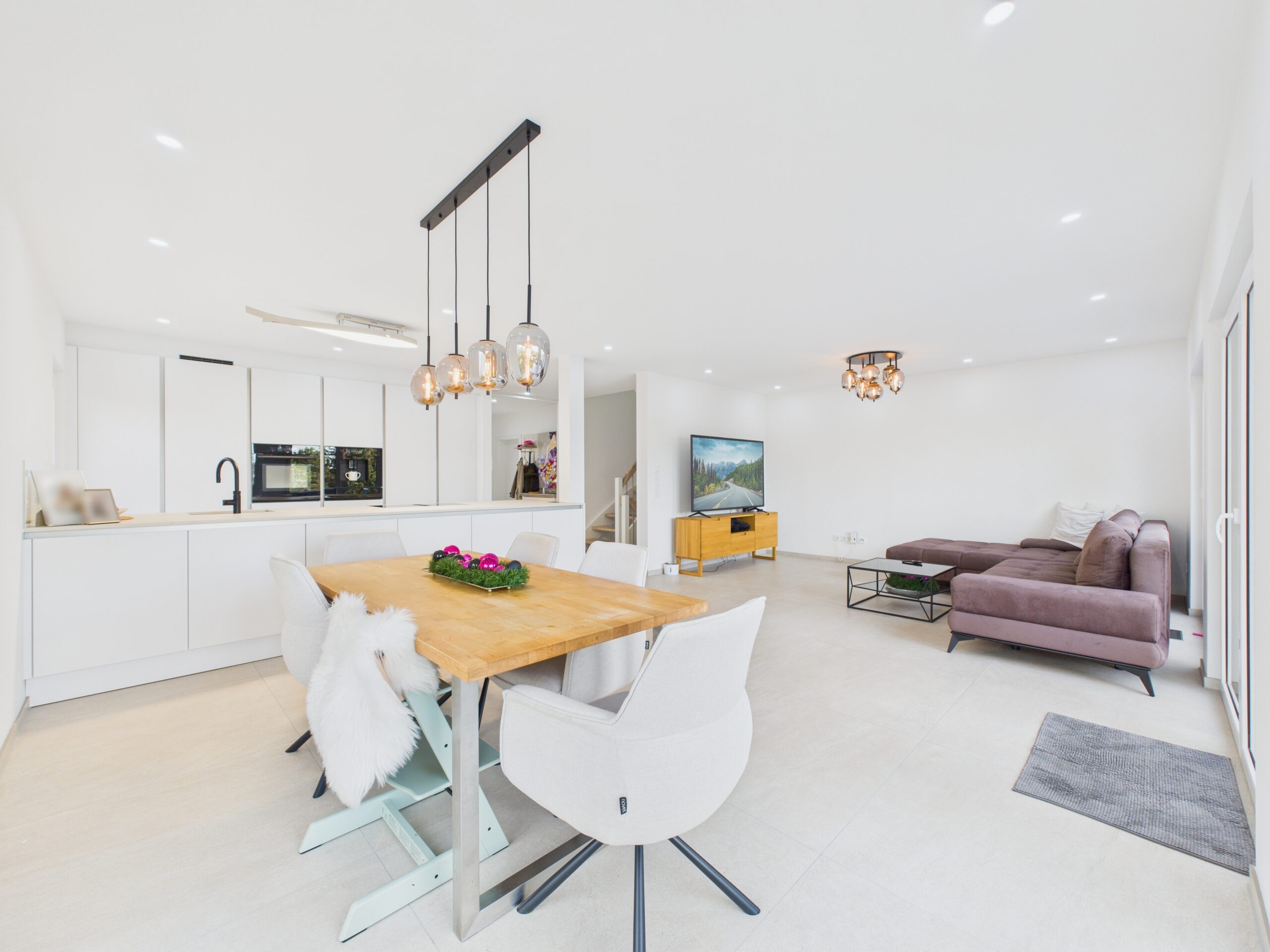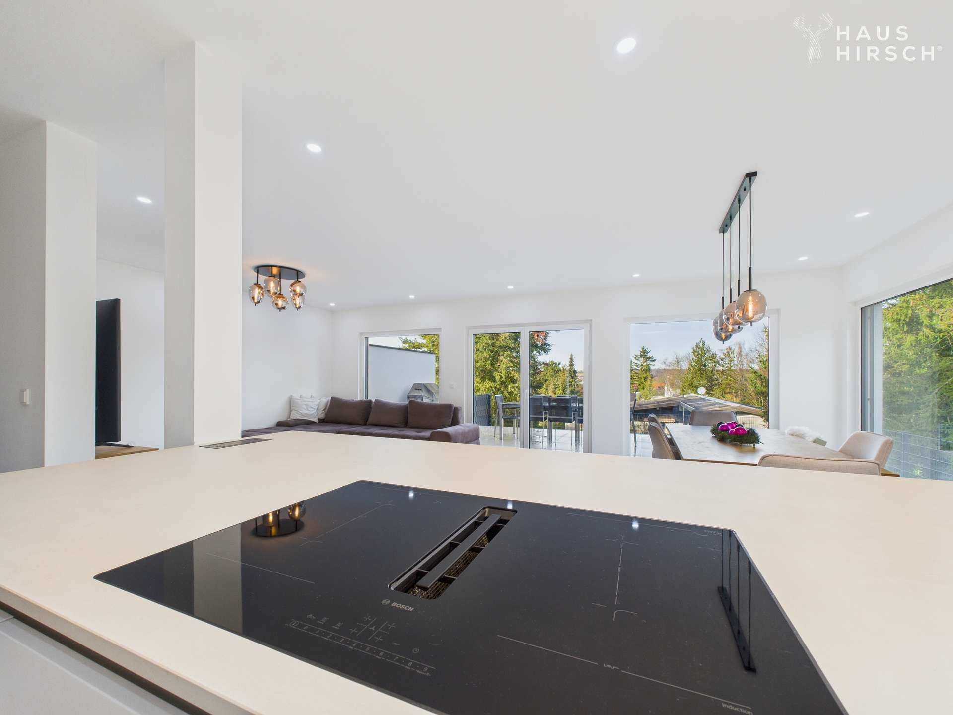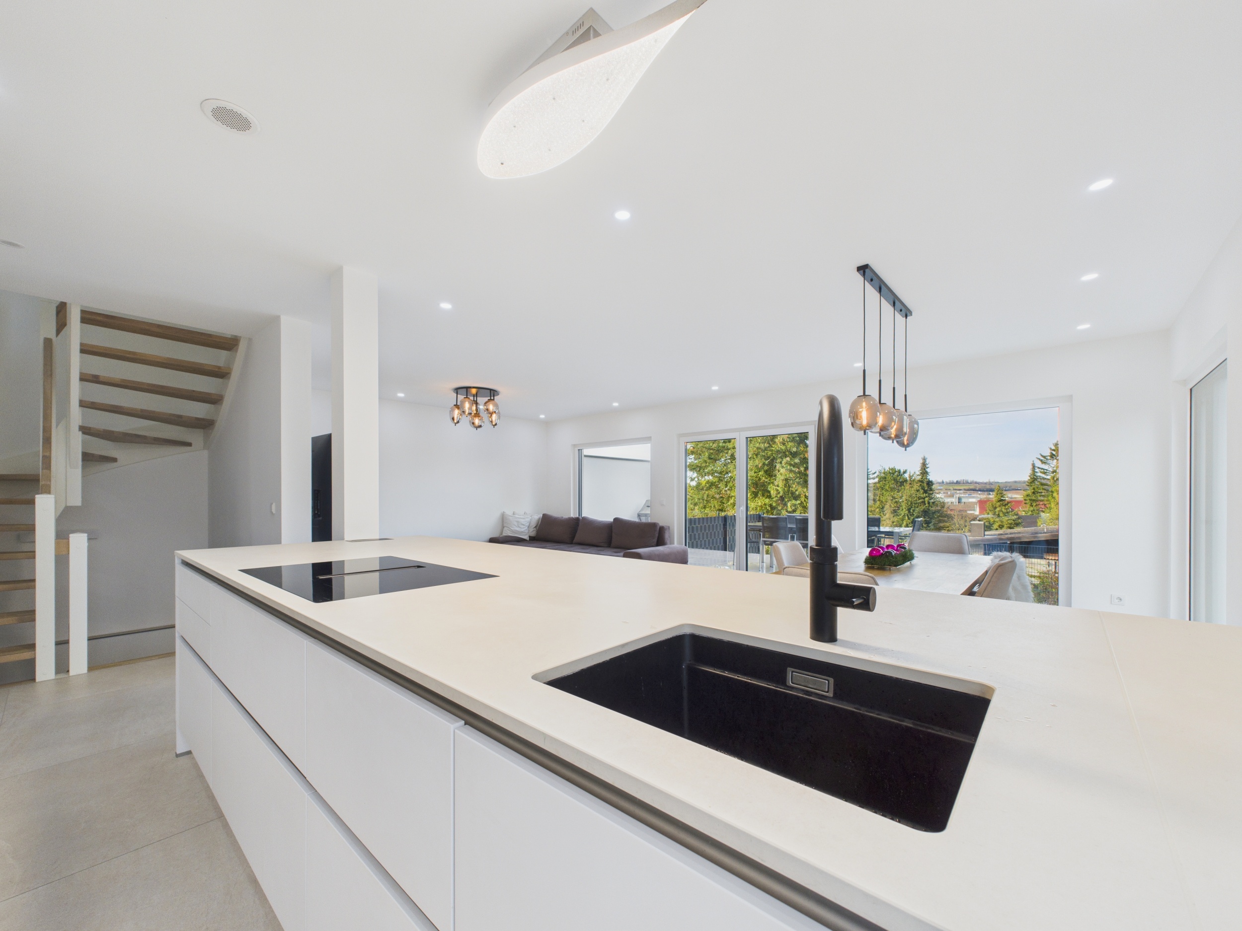 Die offene Küche mit Kochinsel bildet das kommunikative Zentrum des Hauses. Dank des hochwertigen, integrierten Dunstabzugs bleibt der Blick frei – ideal für gemeinsames Kochen, Gespräche und gesellige Abende.
