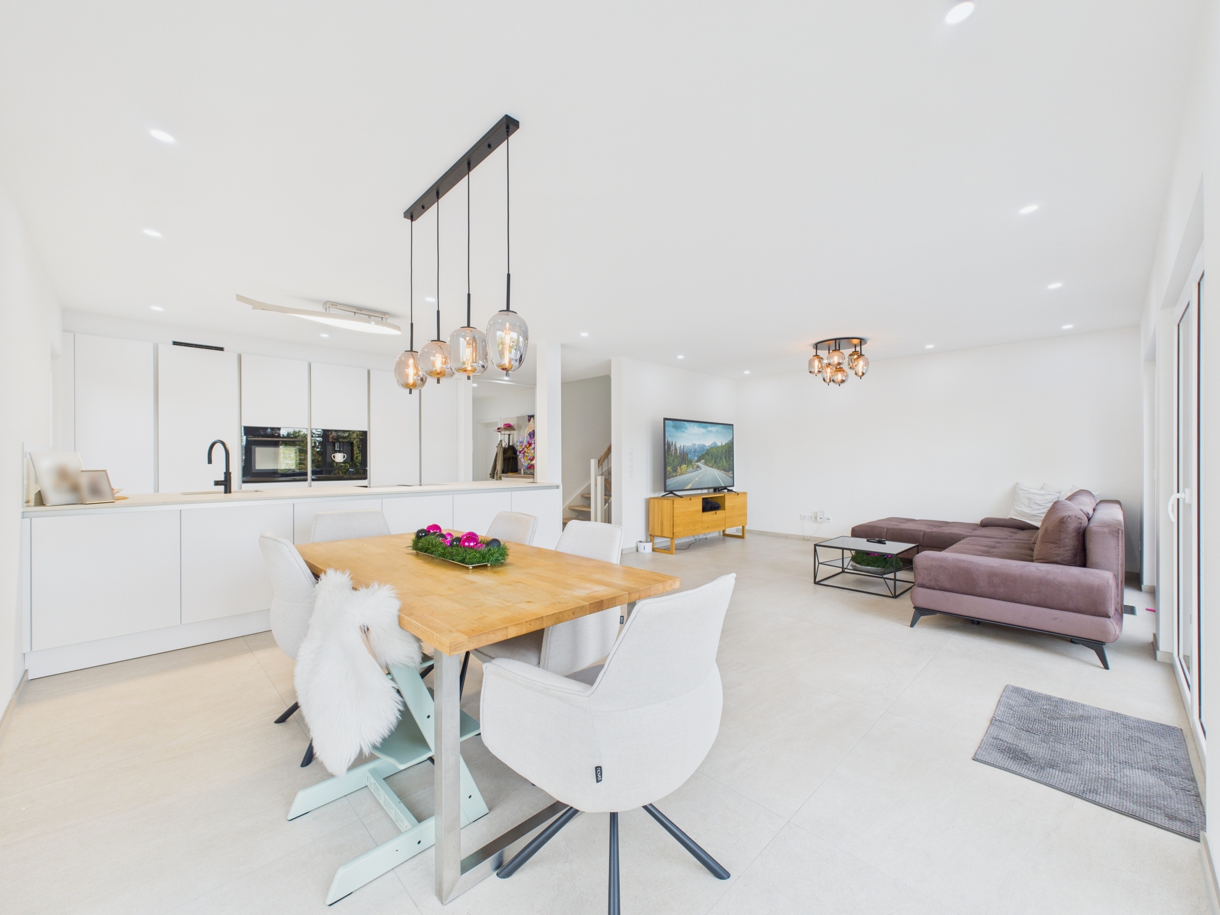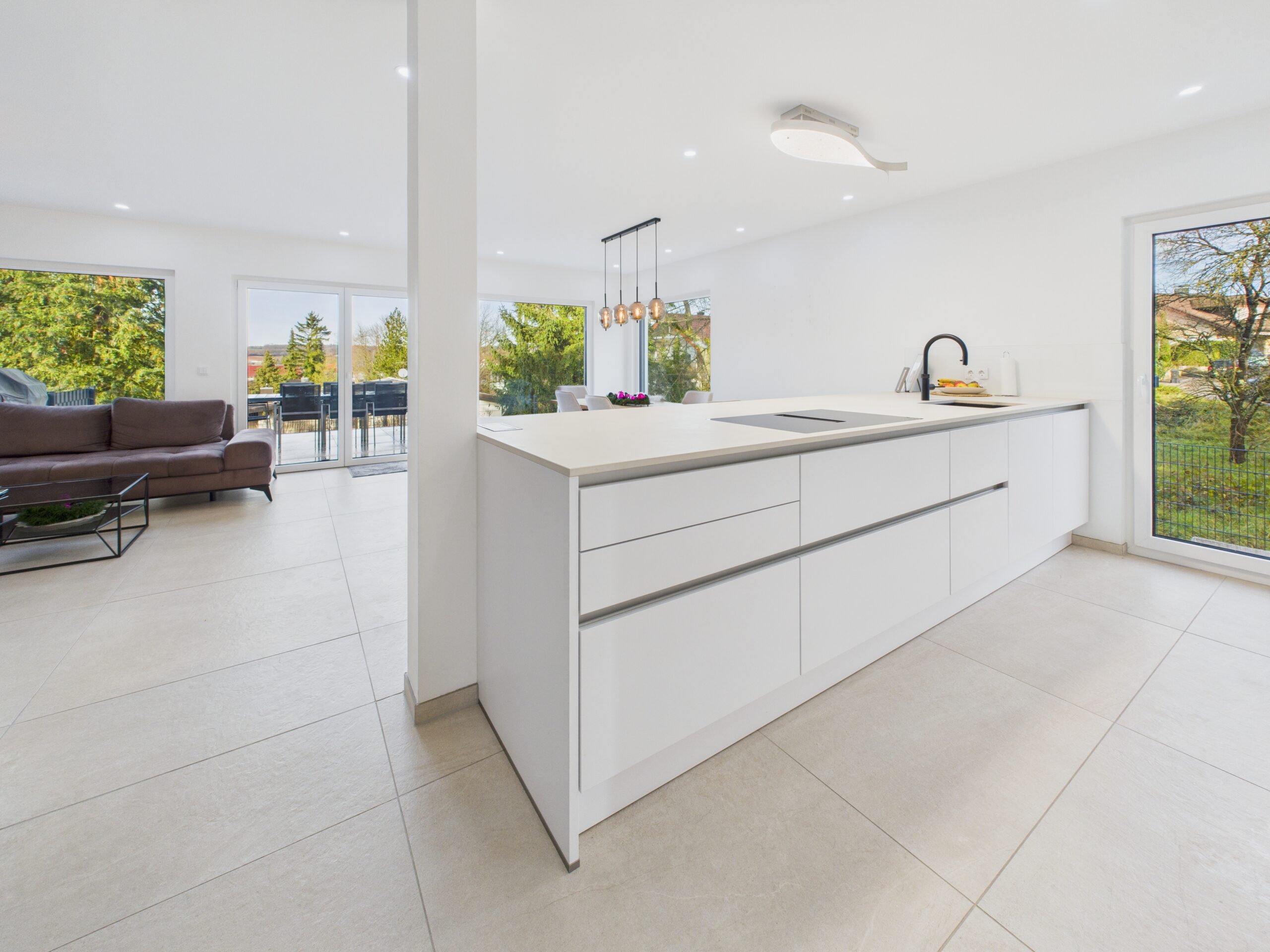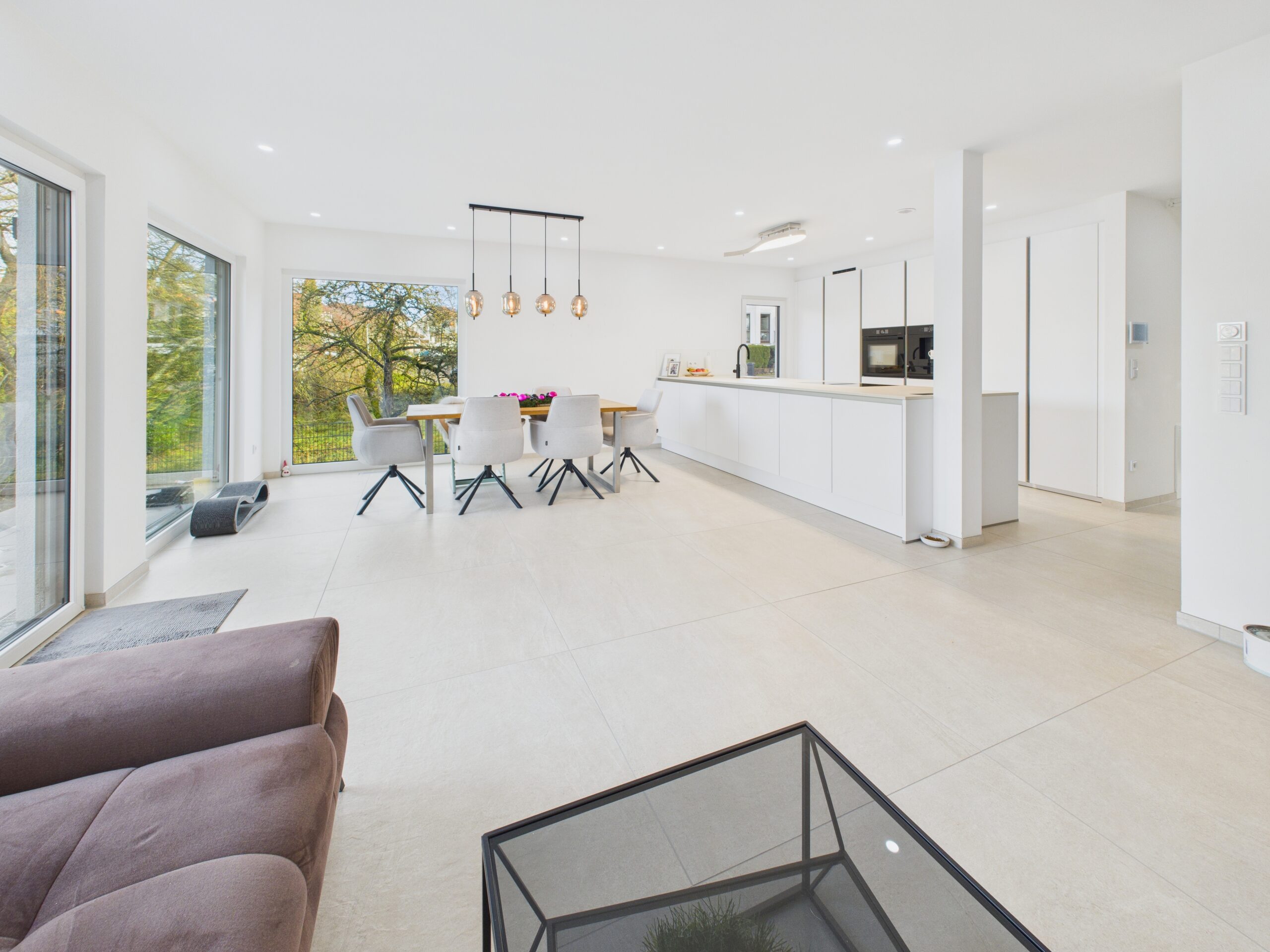 Das gesamte Haus ist konsequent auf Helligkeit und Offenheit ausgerichtet. Edle, helle Feinsteinzeug-Fliesen im großzügigen 1 × 1-Meter-Format ziehen sich fugenarm durch alle Etagen – inklusive Untergeschoss. Sie reflektieren das Tageslicht optimal und verleihen allen Räumen eine besondere Weite und Leichtigkeit. Alles wirkt ruhig, aufgeräumt und angenehm großzügig.