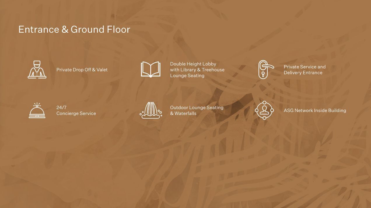 Der 24/7 Concierge-Service steht Ihnen jederzeit zur Verfügung, ebenso wie der private Drop Off & Valet-Service. Die beeindruckende Doppelhöhe der Lobby beherbergt eine Bibliothek und einen Treehouse Lounge Bereich, während draußen ein Outdoor Loungebereich mit Wasserfällen zum Verweilen einlädt. Ein privater Service- und Lieferzugang erleichtert den Alltag.