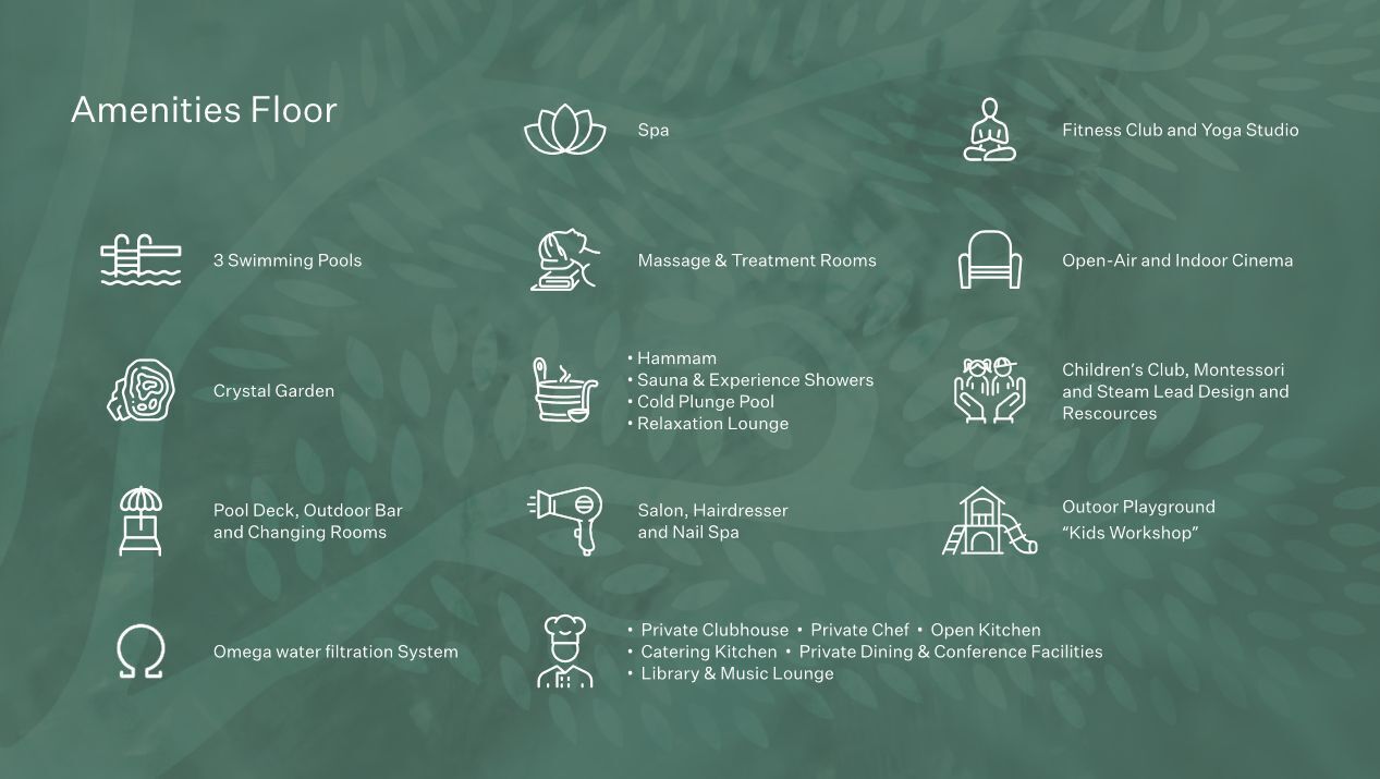 Das Gebäude ist mit dem ASG-Netzwerk ausgestattet und verfügt über 3 Swimmingpools, einen Crystal Garden und einen Pooldeck mit Outdoorbar. Die Omega Wasserfiltration sorgt für höchste Wasserqualität, während der Spa-Bereich mit Massage- und Behandlungsräumen sowie einem Hamam und Erlebnisduschen pure Entspannung bietet. Ein weiterer Luxus ist der private Clubhouse mit eigenem Koch, offener Küche und Catering-Küche.
