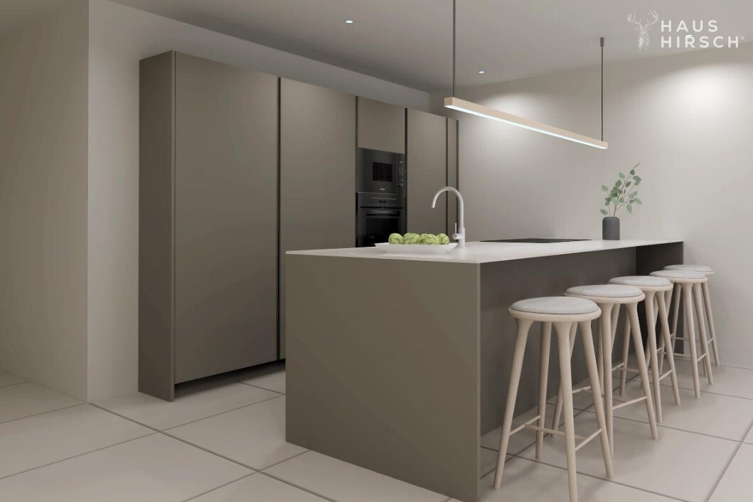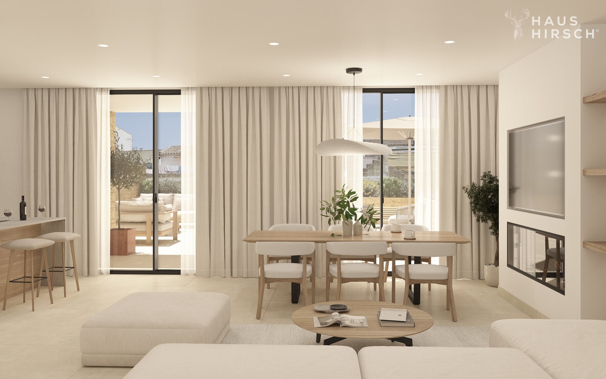 Die gehobene Ausstattung der Wohnung lässt keine Wünsche offen. Ein Highlight ist der offene Wohn- und Essbereich mit einer komplett ausgestatteten Einbauküche. Von hier aus gelangen Sie auch auf die über 60 qm große Terrasse, auf der Sie die Sonne und die Ruhe genießen können. Die Klimaanlage sorgt auch an heißen Tagen für ein angenehmes Raumklima.