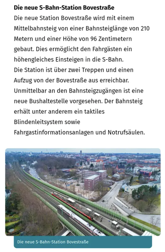 Noch weiter verbessert wird die Anbindung durch die geplante Fertigstellung des ersten Abschnitts der S-Bahn 4 im Jahr 2027, die dann eine fußläufig erreichbare Anbindung mit nur 5 Stationen bis zum Hauptbahnhof (oder 6 bis Jungfernstieg) ermöglicht. In 6 Min. gelangen Sie zur Auffahrt der A24, dem schnellen Weg mit dem Auto nach Hamburg, Berlin oder an die Ostsee.