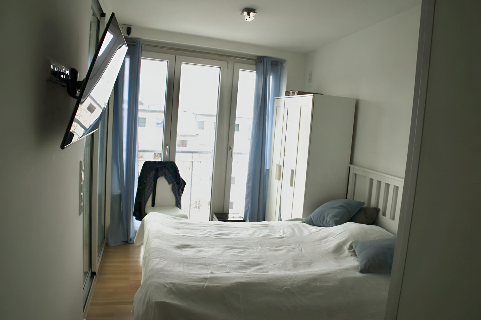 The kitchen is a custom-made creation from Berlin kitchen studios, fully equipped with modern Siemens appliances including oven, microwave, dishwasher, induction stove, and refrigerator.