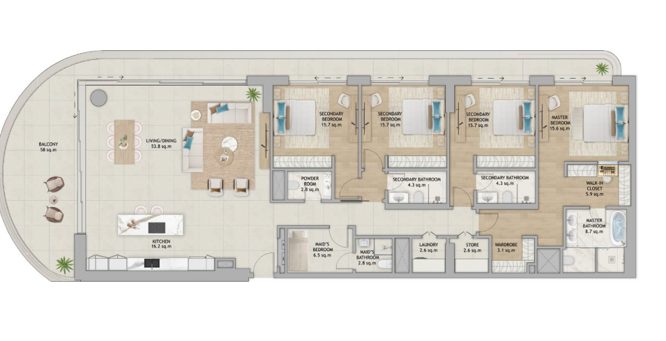 Herzlich Willkommen in diesem traumhaften Apartment mit 4 Schlafzimmern und einem Dienstmädchenzimmer. Treten Sie ein und lassen Sie sich von den unzähligen Annehmlichkeiten dieses exklusiven Wohnkomplexes beeindrucken.