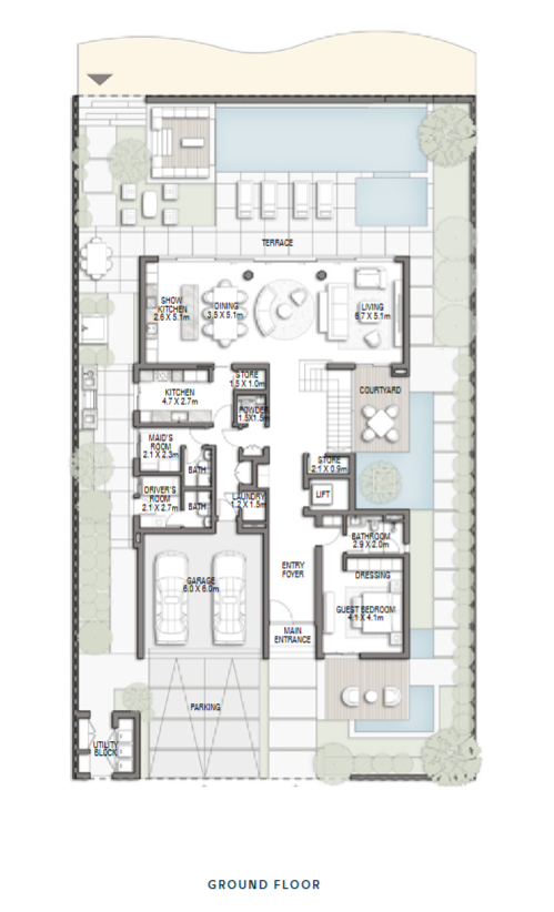 Im Erdgeschoss erwartet Sie ein geräumiges Gästezimmer mit eigenem Badezimmer, ein Zimmer für das Personal mit eigenem Badezimmer, ein Fahrerzimmer mit eigenem Badezimmer, eine Garage, zwei Abstellräume, ein Gäste-WC, ein weitläufiges Wohnzimmer, eine elegante Küche und ein Innenhof.