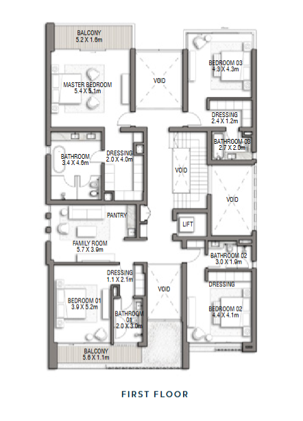 Im ersten Stock finden Sie fünf Schlafzimmer, jedes mit eigenem Badezimmer, sowie einen großen Familienraum für gemütliche Stunden mit Ihren Liebsten.