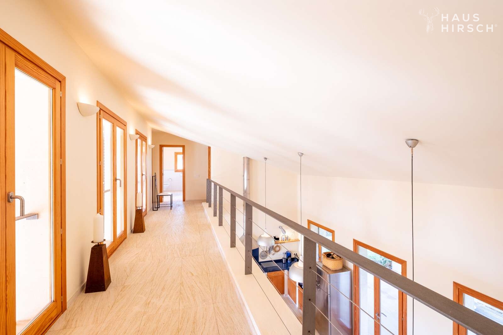 Im Obergeschoss erwartet Sie ein eleganter Galeriebereich, der sich ideal als Lounge oder Homeoffice nutzen lässt. Zwei weitere Schlafzimmer – eines mit eigenem Bad en Suite – bieten höchsten Komfort und einen malerischen Ausblick auf den Pool, das üppige Grün der Umgebung und das dahinterliegende Meer.